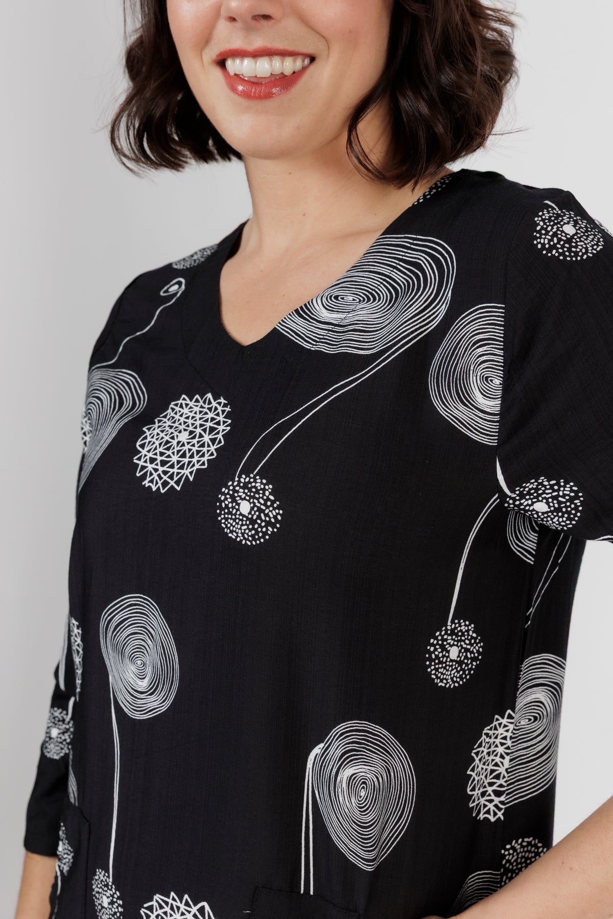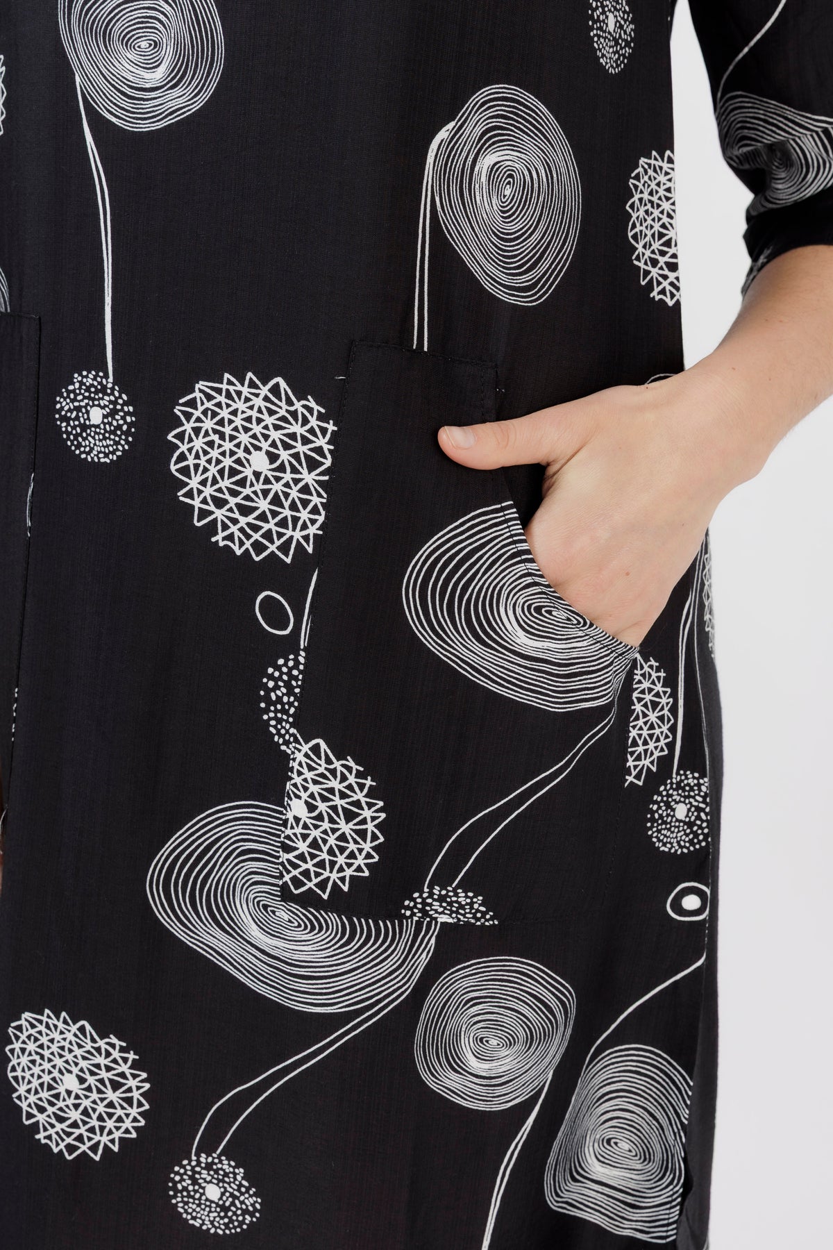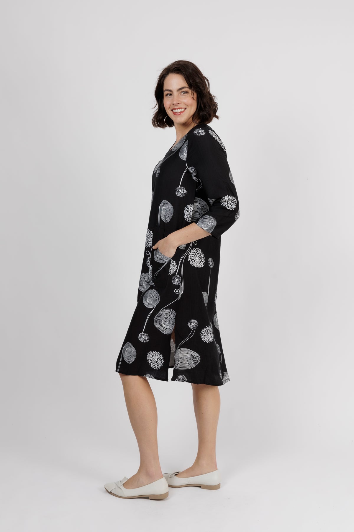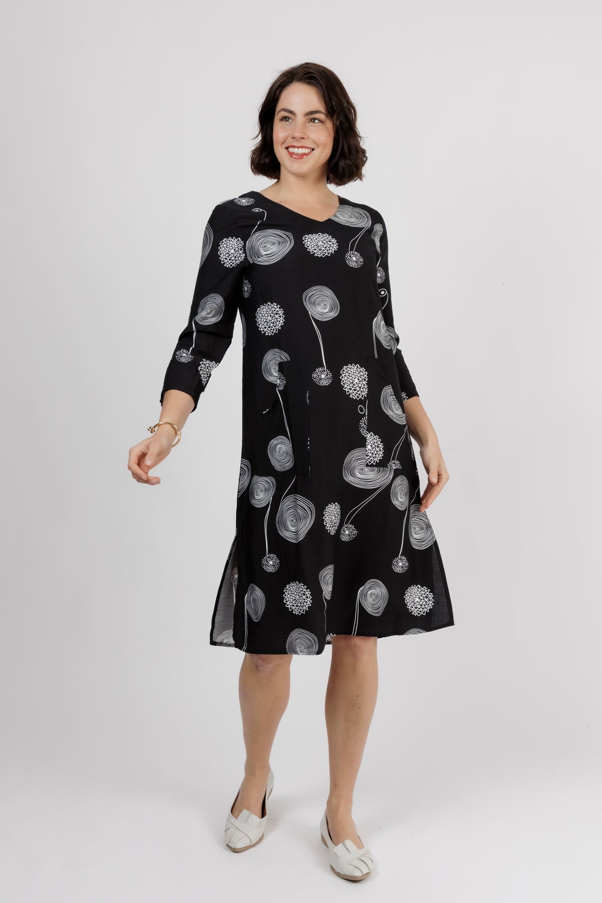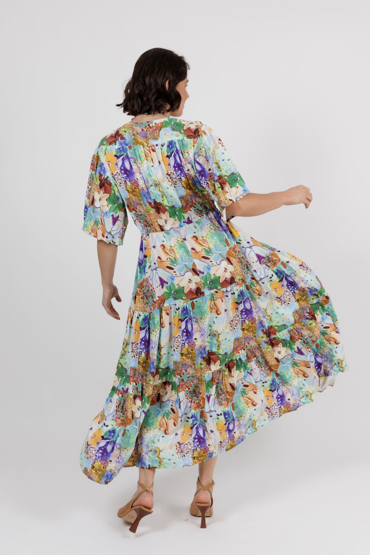 The V-neckline and three-quarter sleeves add a flattering touch, while the straight relaxed silhouette and side pockets provide both comfort and practicality. Ideal for brunches, travel, or warm-weather events, this artistic dress brings colour, movement, and sophistication to every occasion.