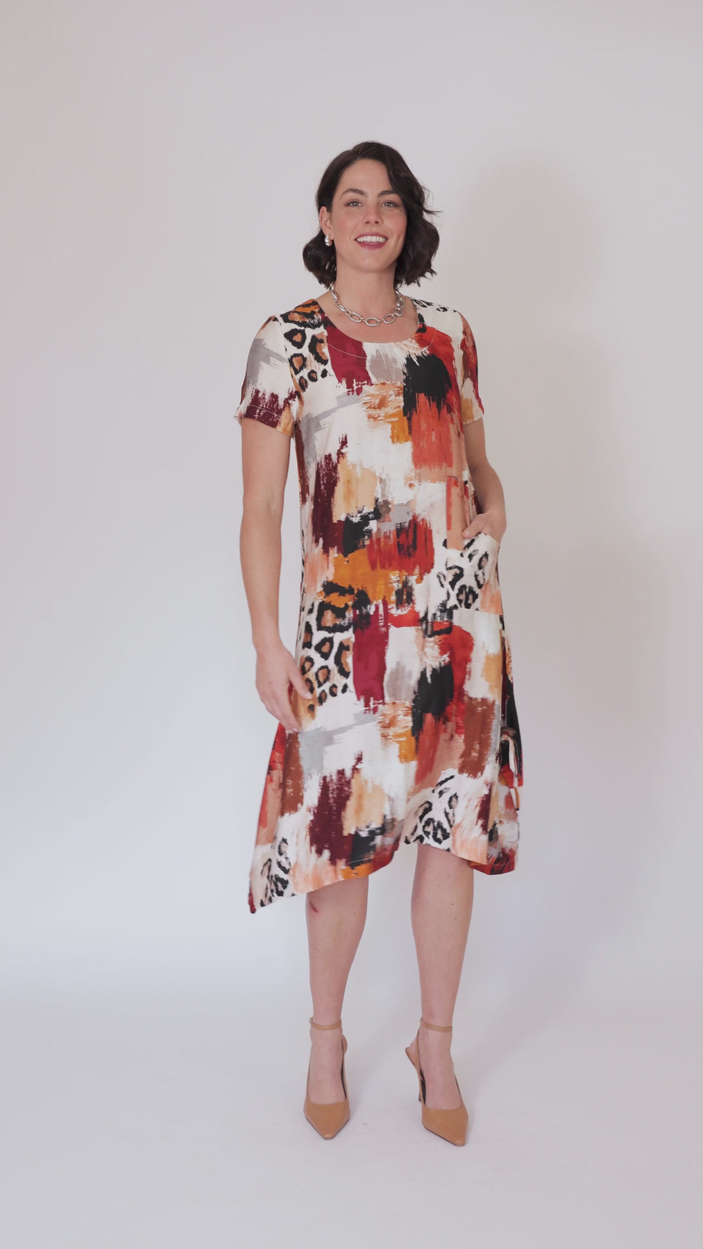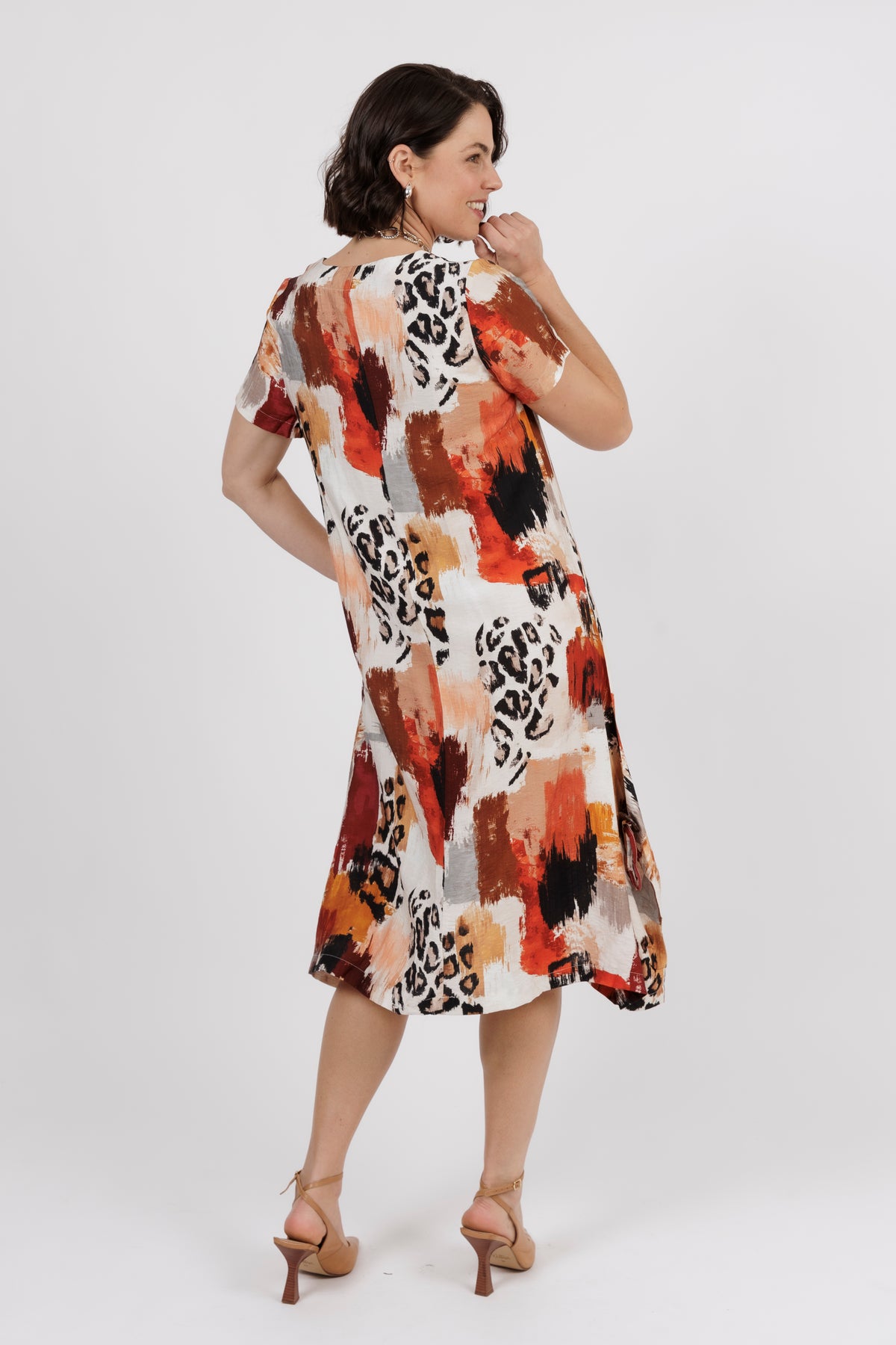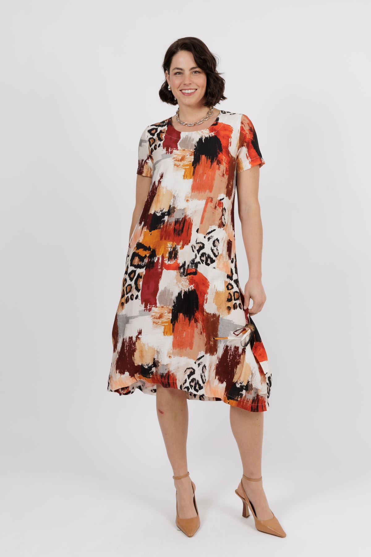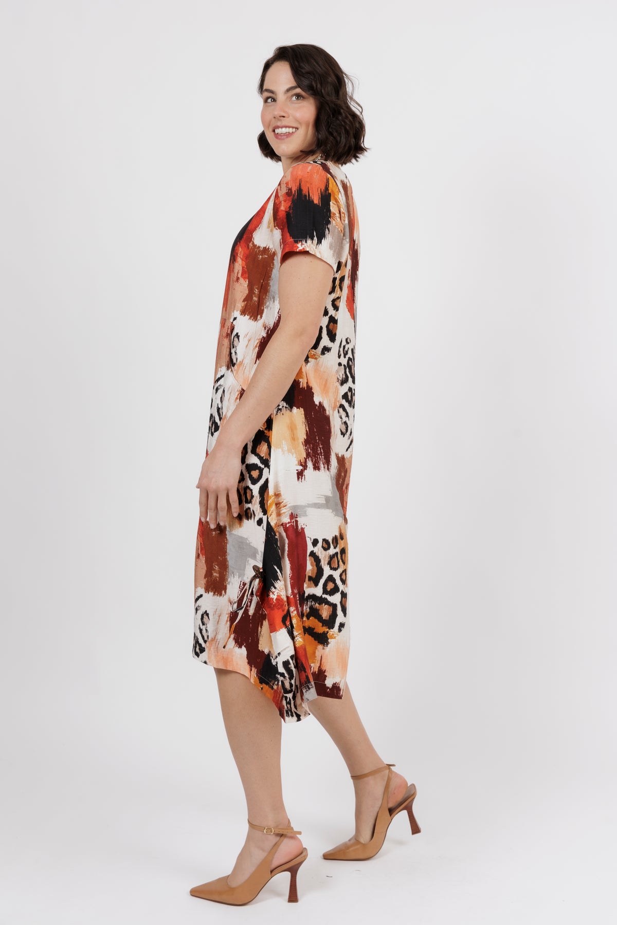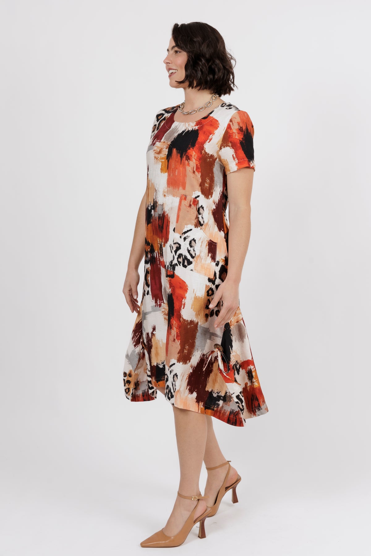 Regular price $59.89 Sale price $41.91Bold, modern and effortlessly flattering - this swing dress is made to stand out. The artistic brushstroke and animal print mix in warm autumn hues of rust, caramel, and ivory gives it a contemporary edge. Cut in a relaxed A-line silhouette with short sleeves and soft drape, it moves beautifully with every step.