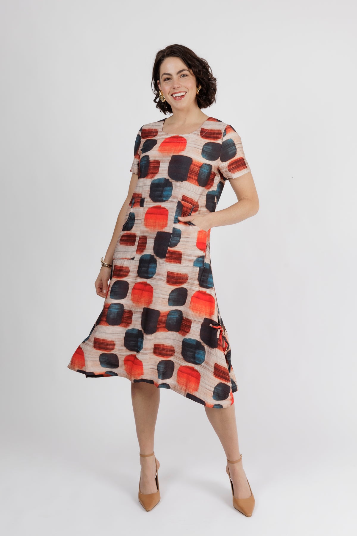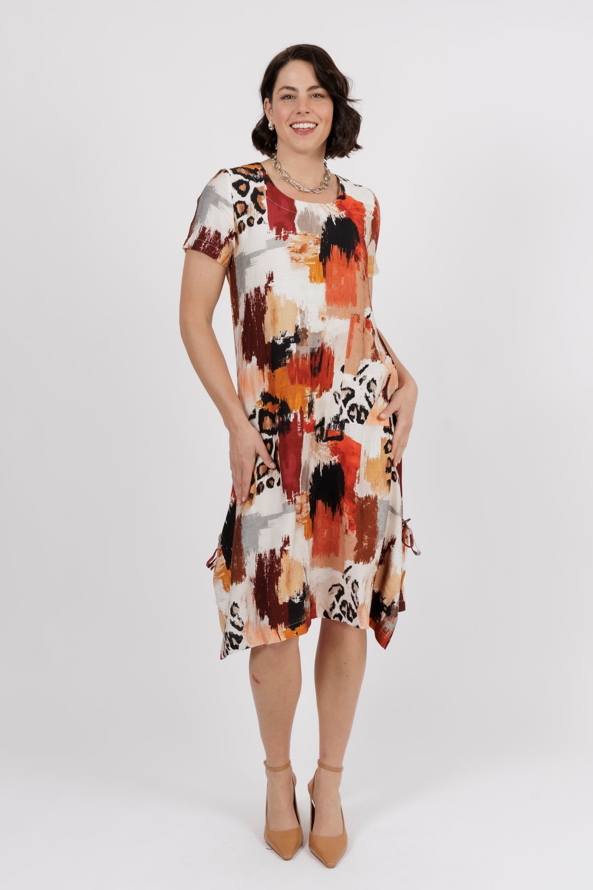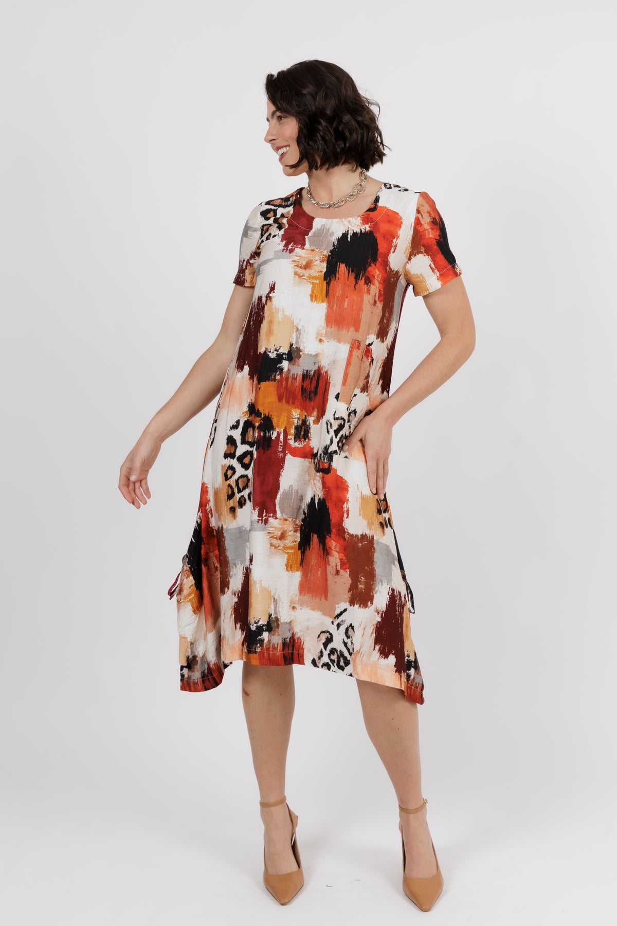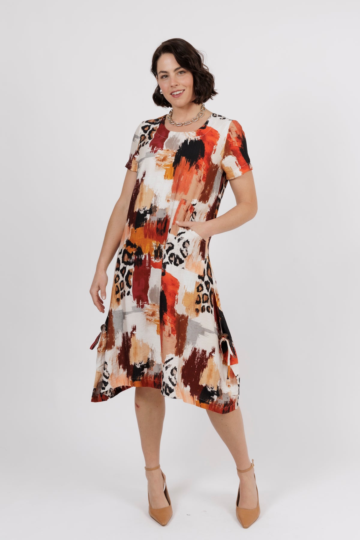 Regular price $59.89 Sale price $41.91Bold, modern and effortlessly flattering - this swing dress is made to stand out. The artistic brushstroke and animal print mix in warm autumn hues of rust, caramel, and ivory gives it a contemporary edge. Cut in a relaxed A-line silhouette with short sleeves and soft drape, it moves beautifully with every step.