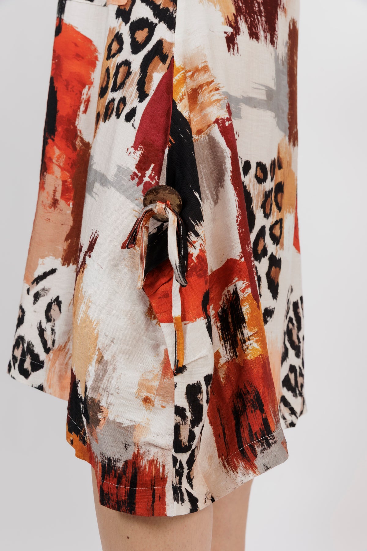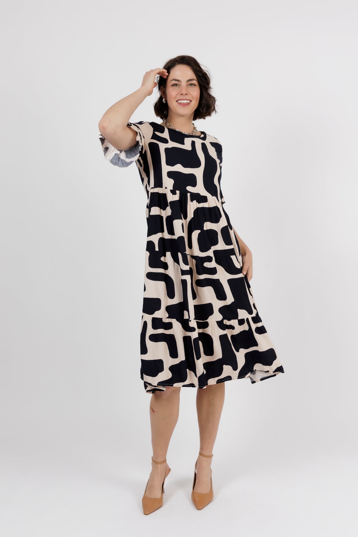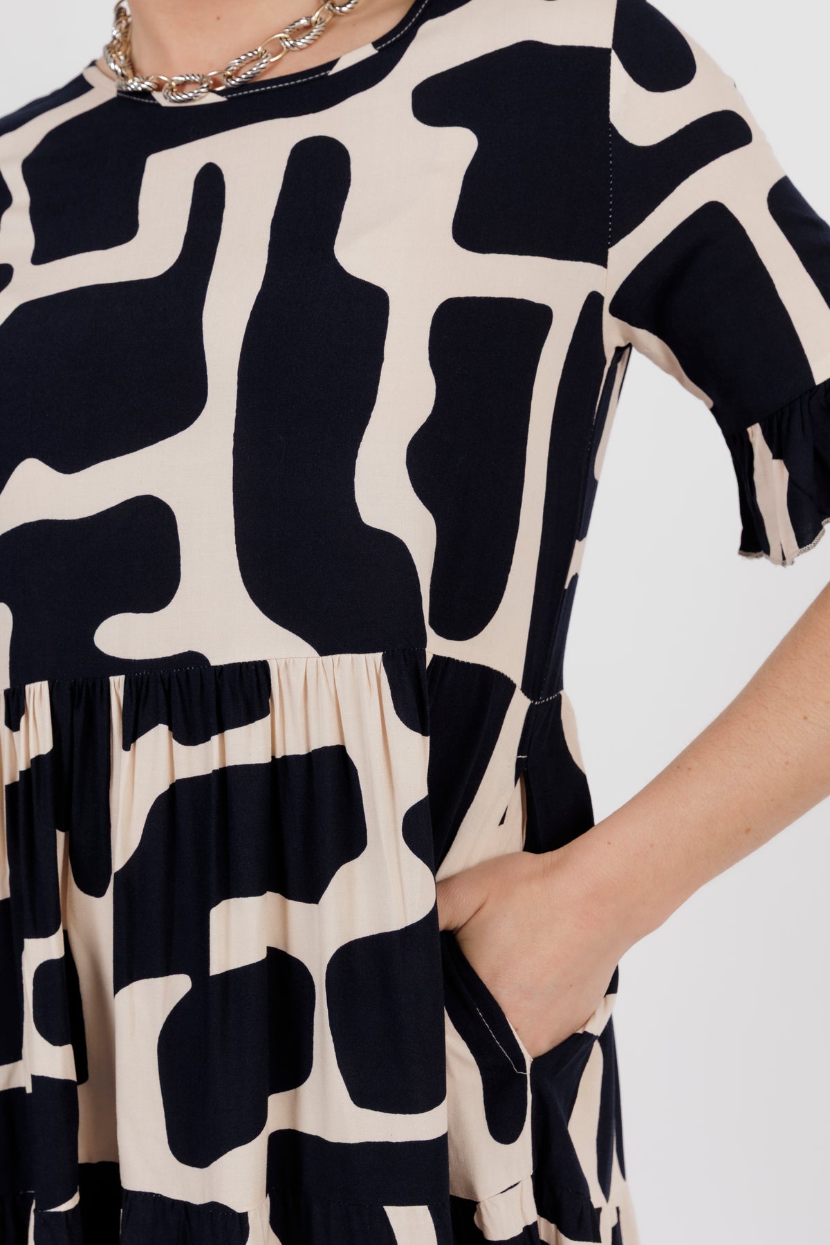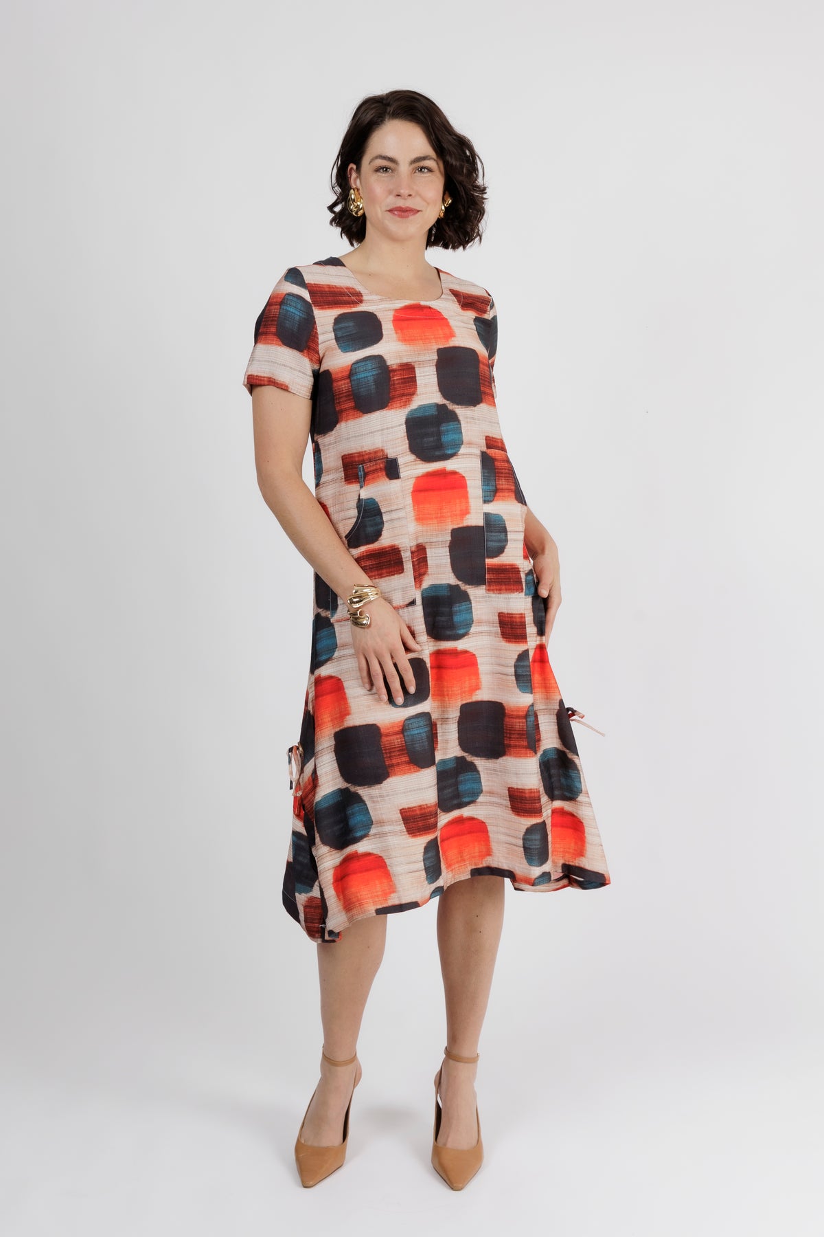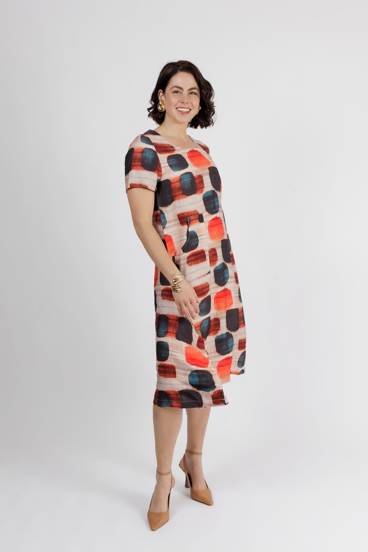 Regular price $59.89 Sale price $41.91Bold, modern and effortlessly flattering - this swing dress is made to stand out. The artistic brushstroke and animal print mix in warm autumn hues of rust, caramel, and ivory gives it a contemporary edge. Cut in a relaxed A-line silhouette with short sleeves and soft drape, it moves beautifully with every step.