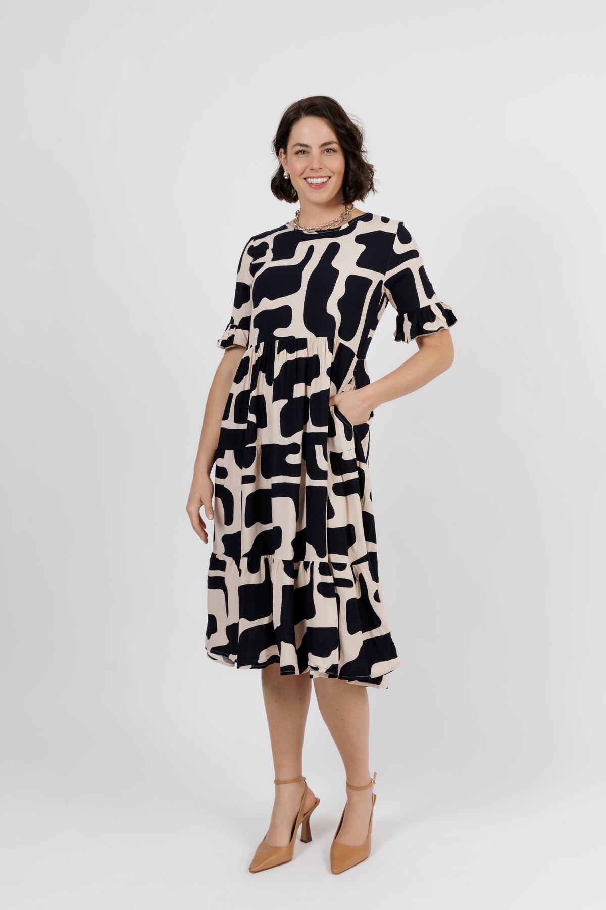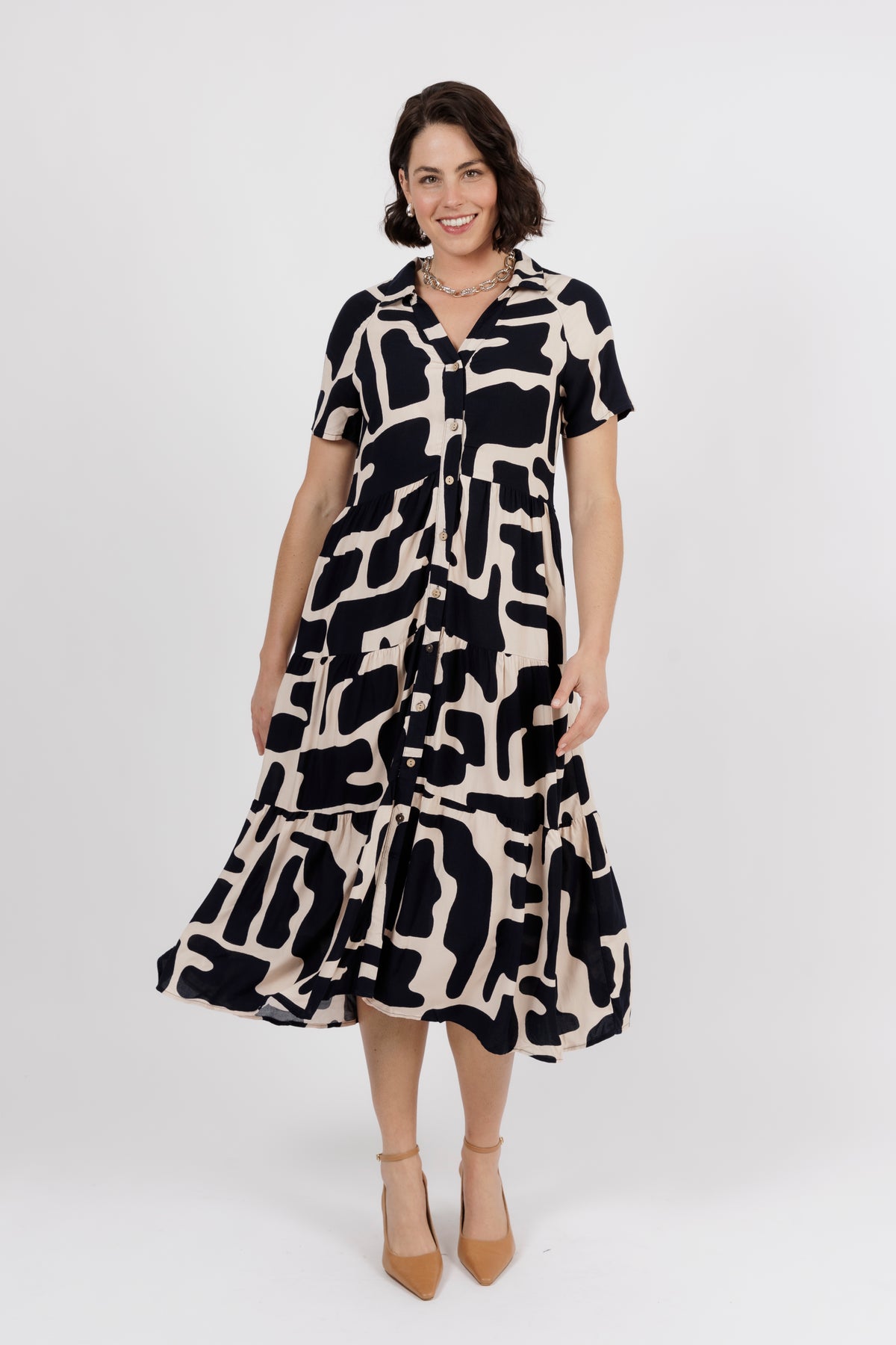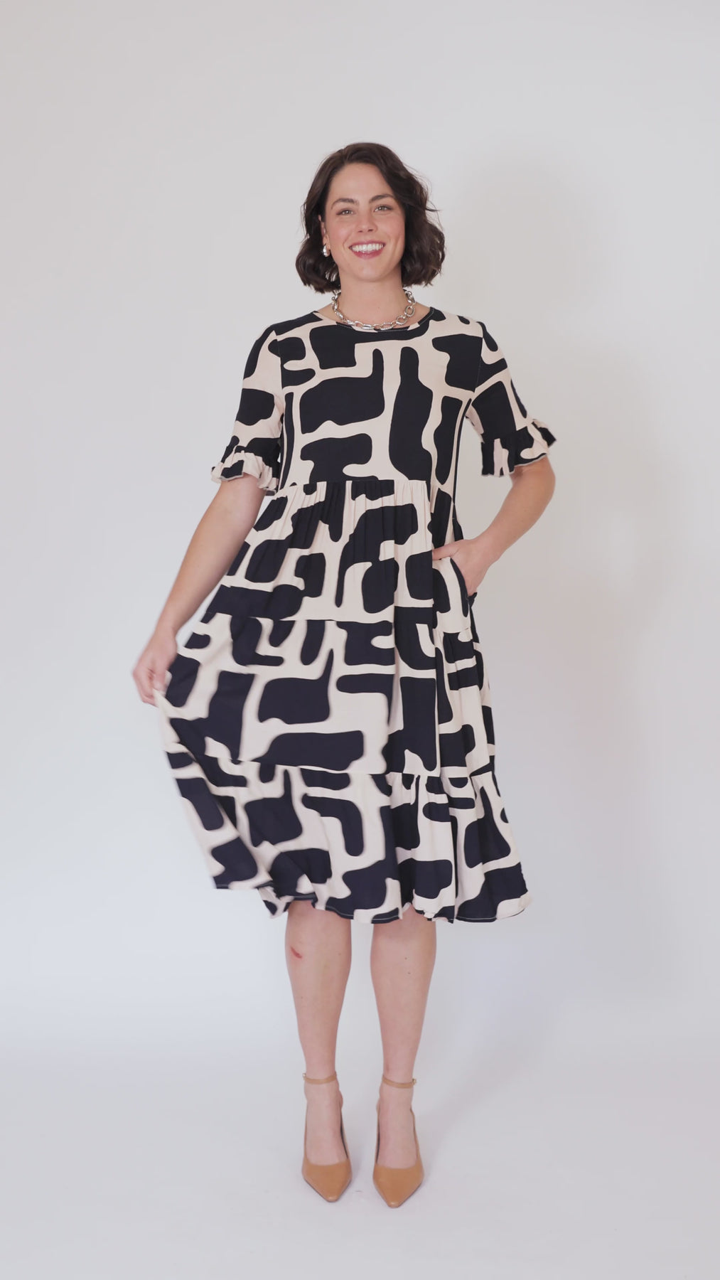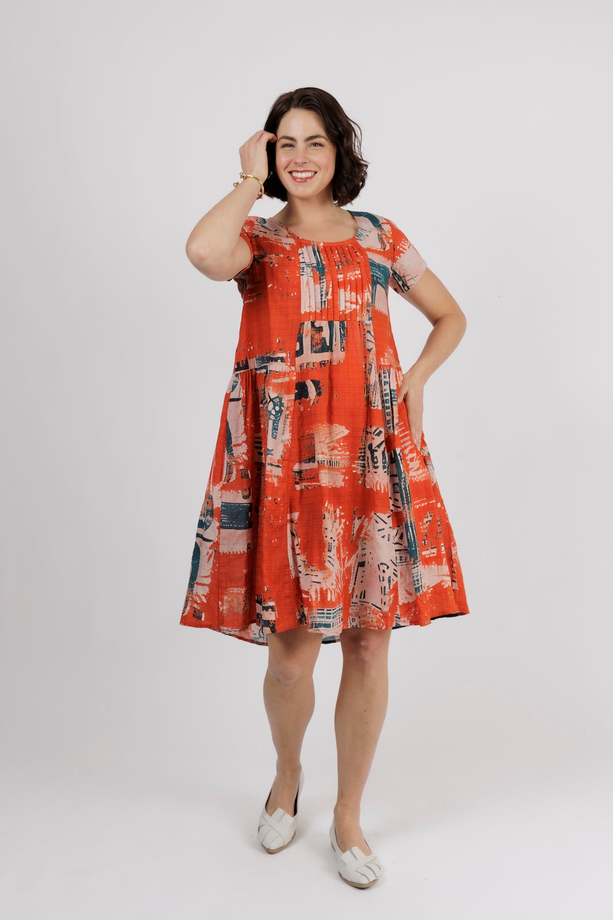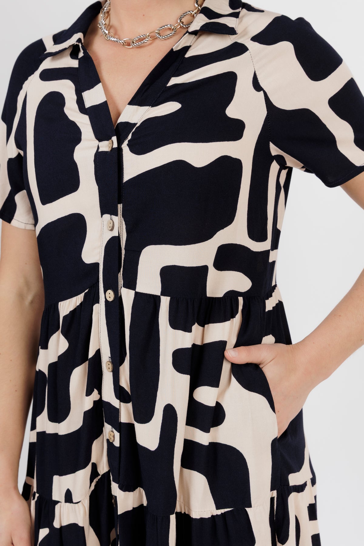 Regular price $59.89 Sale price $41.91Bold, modern and effortlessly flattering - this swing dress is made to stand out. The artistic brushstroke and animal print mix in warm autumn hues of rust, caramel, and ivory gives it a contemporary edge. Cut in a relaxed A-line silhouette with short sleeves and soft drape, it moves beautifully with every step.