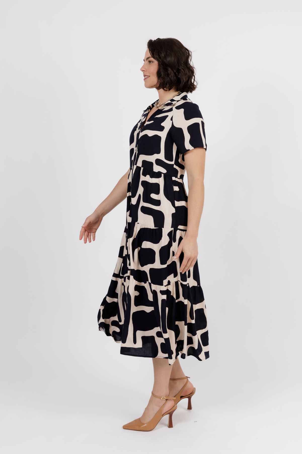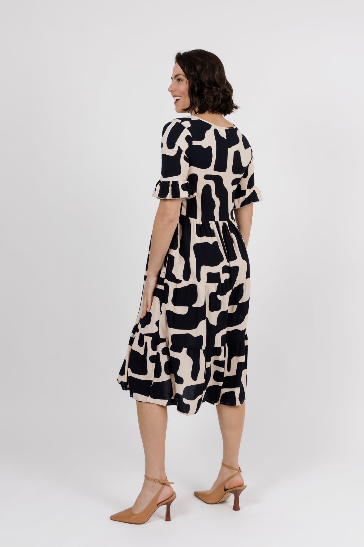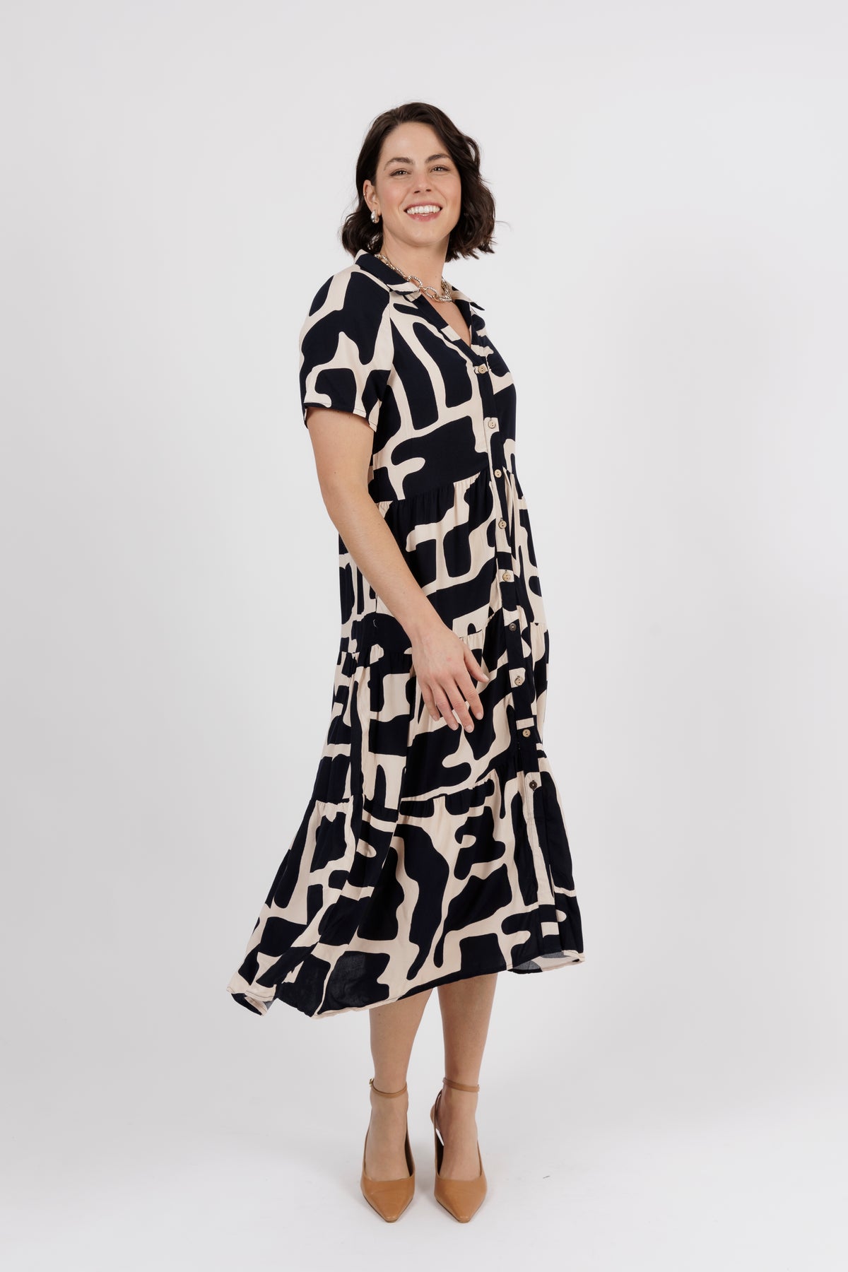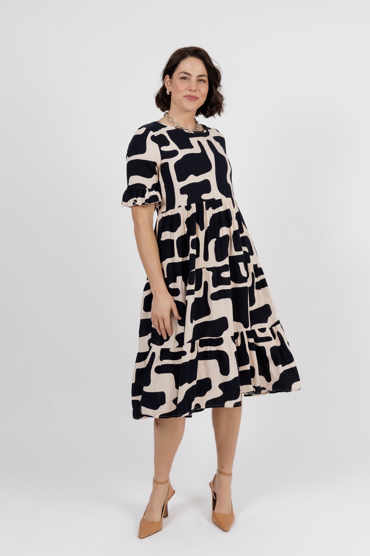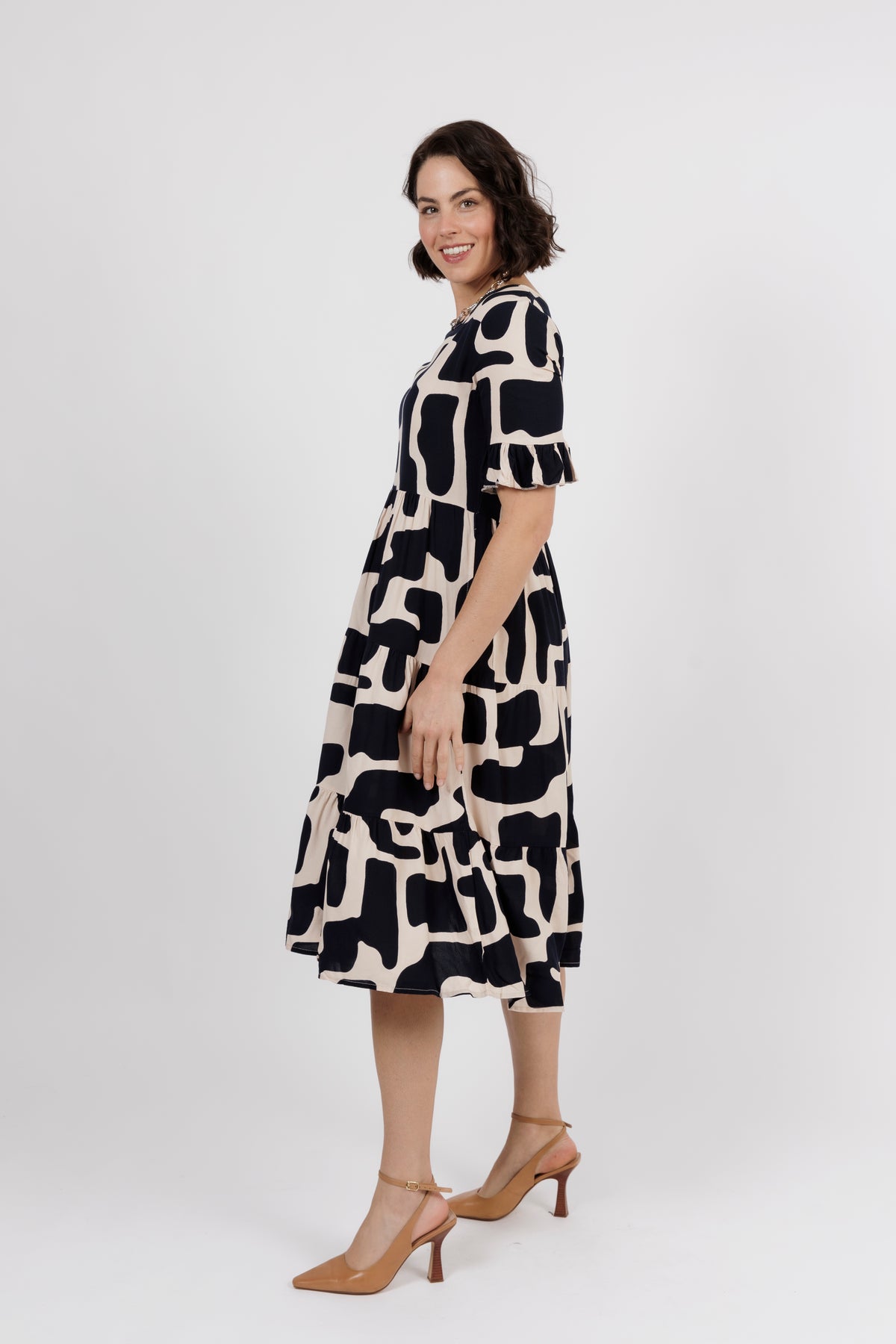 Regular price $59.89 Sale price $41.91Bold, modern and effortlessly flattering - this swing dress is made to stand out. The artistic brushstroke and animal print mix in warm autumn hues of rust, caramel, and ivory gives it a contemporary edge. Cut in a relaxed A-line silhouette with short sleeves and soft drape, it moves beautifully with every step.