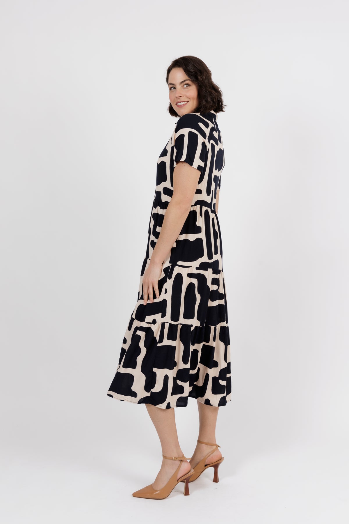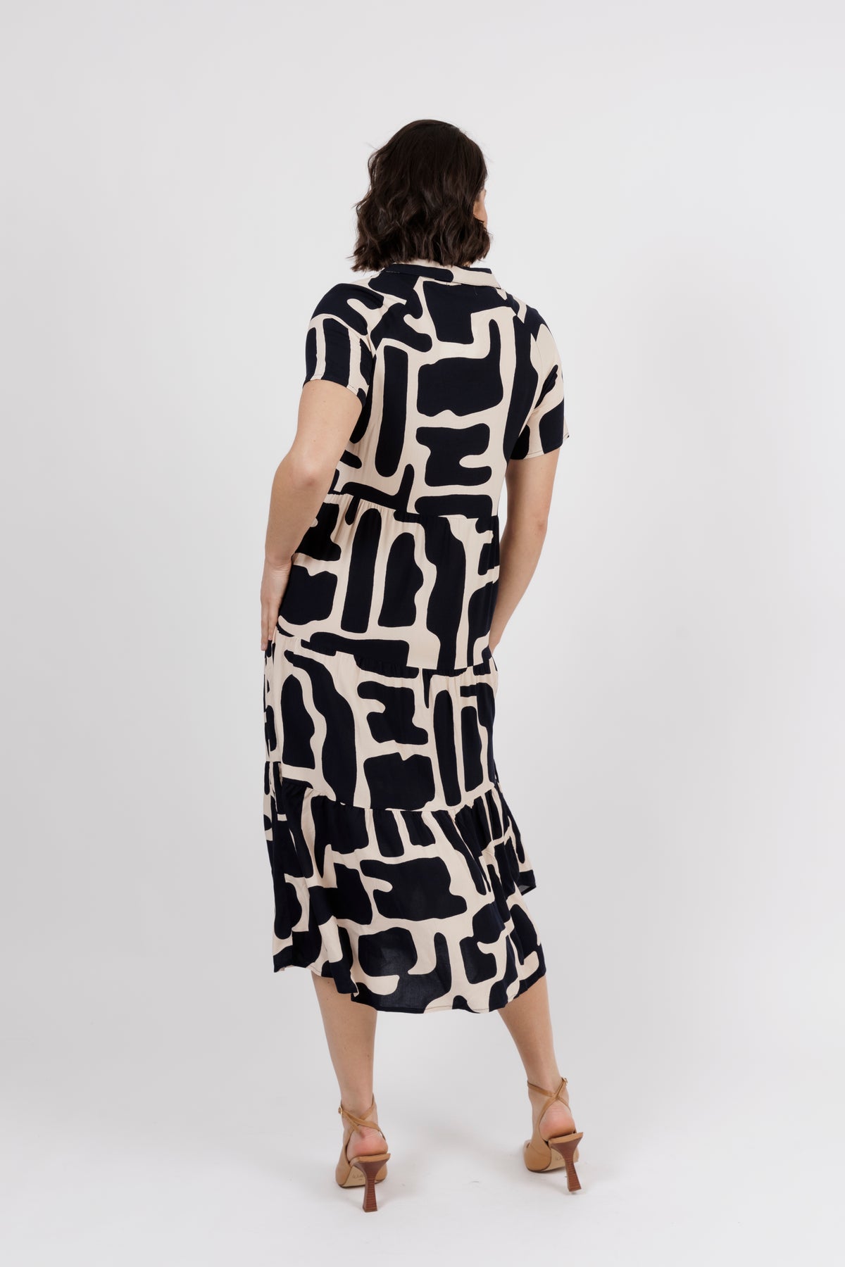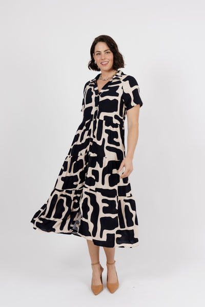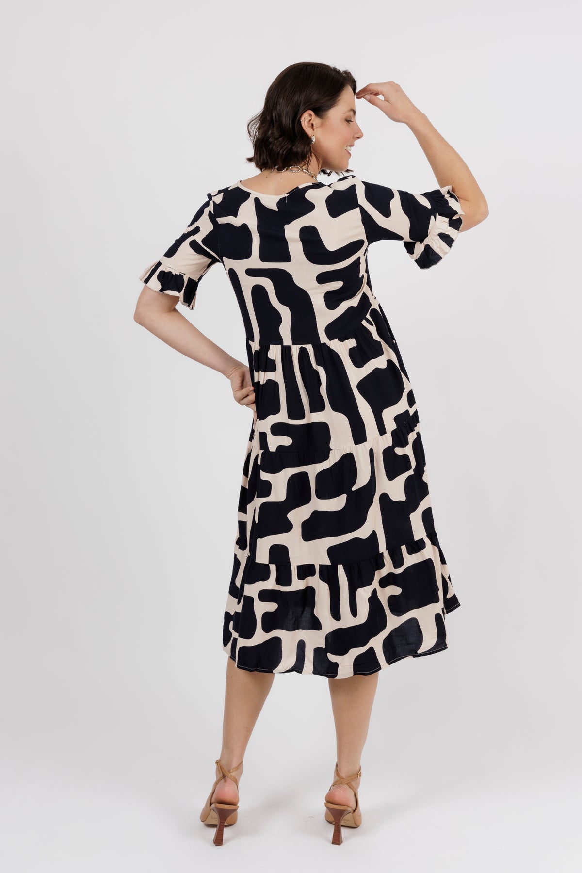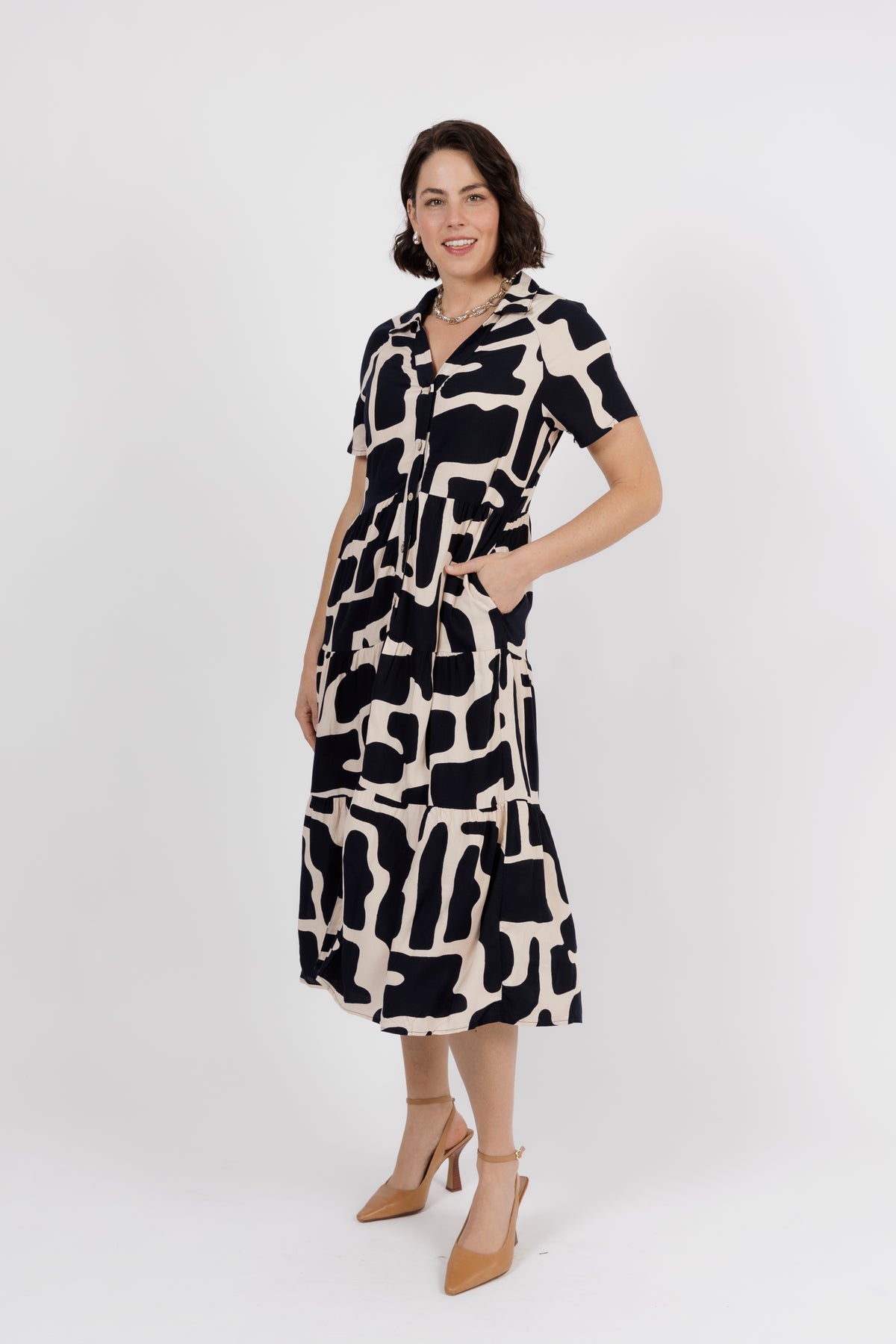 Regular price $59.89 Sale price $41.91Bold, modern and effortlessly flattering - this swing dress is made to stand out. The artistic brushstroke and animal print mix in warm autumn hues of rust, caramel, and ivory gives it a contemporary edge. Cut in a relaxed A-line silhouette with short sleeves and soft drape, it moves beautifully with every step.
