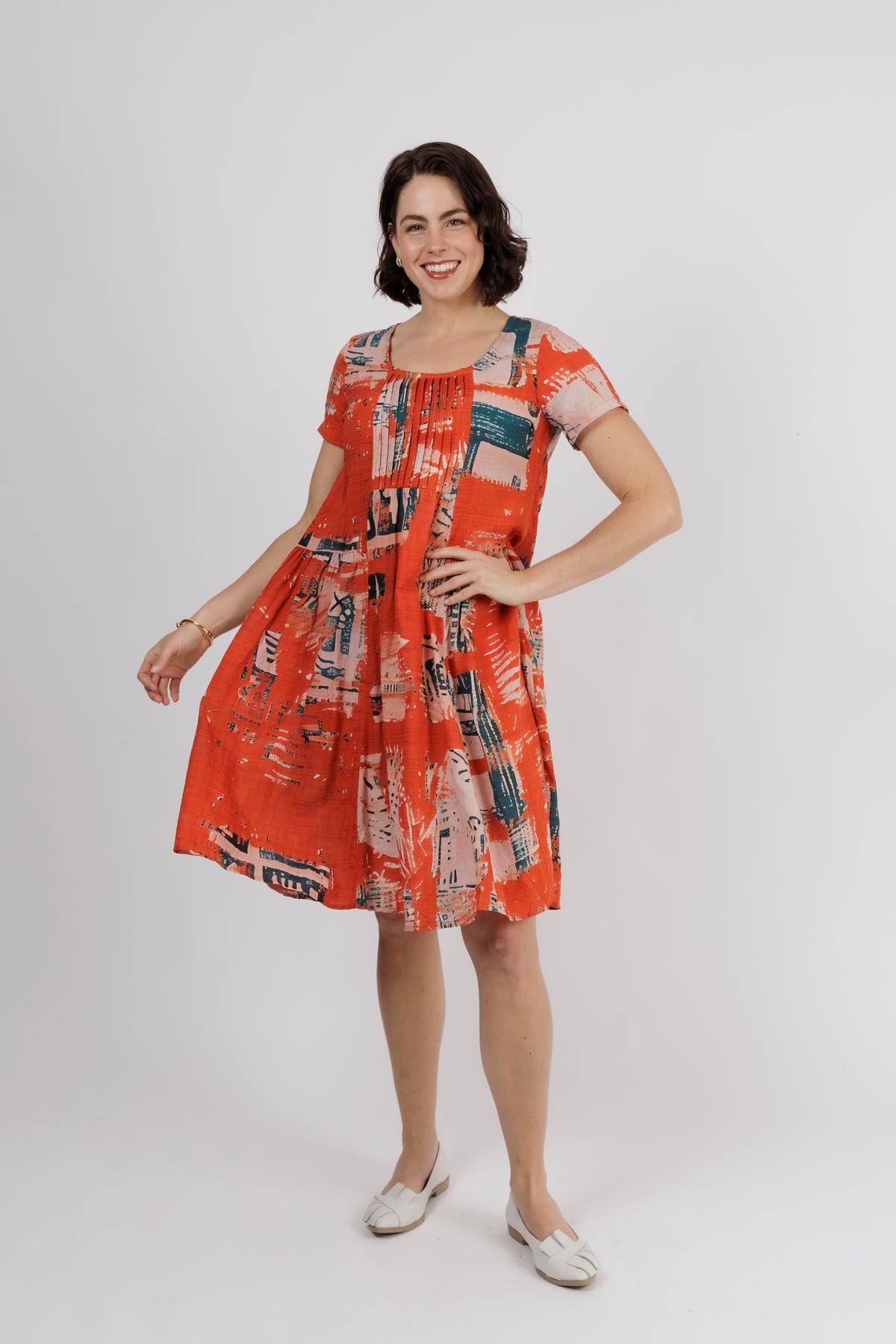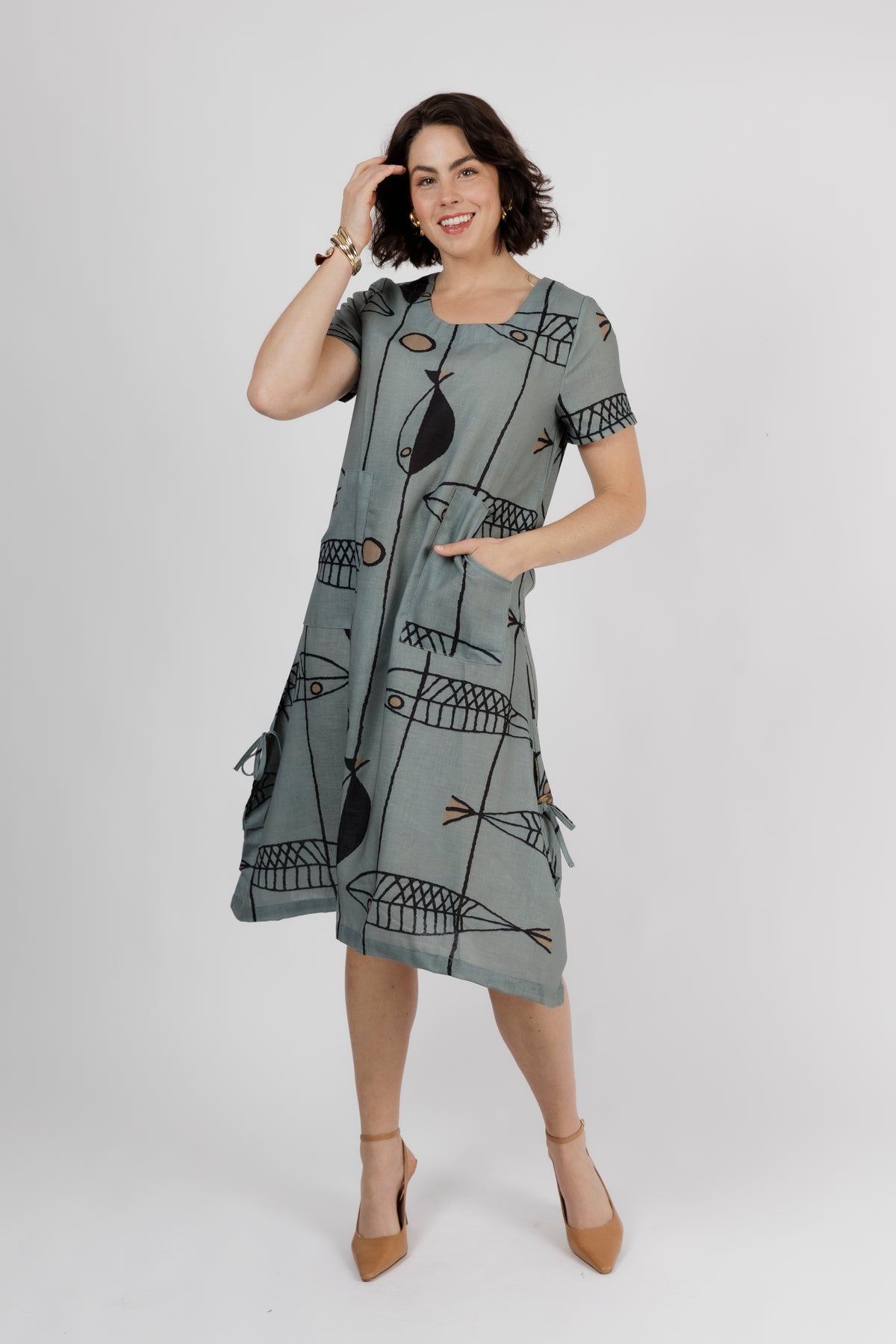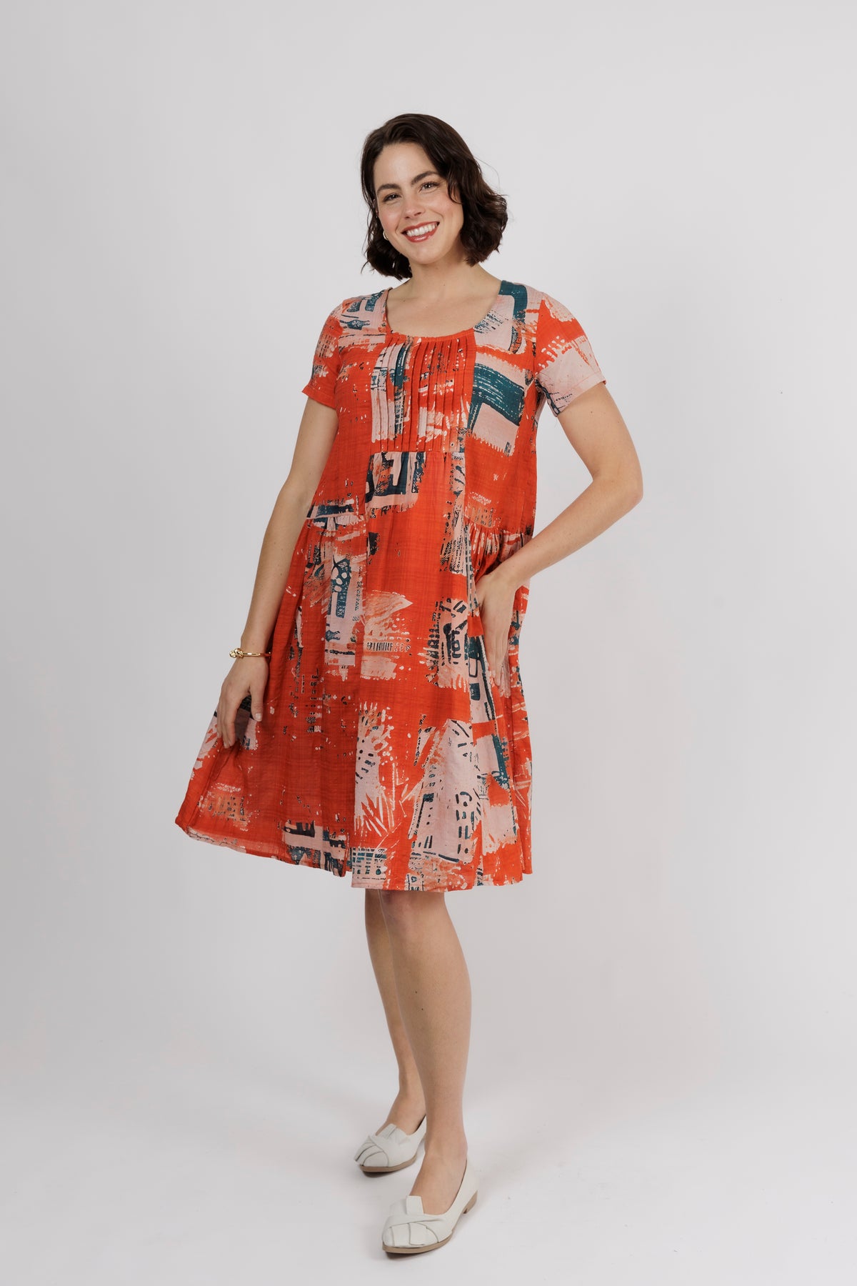 Cut from a soft, breathable linen-cotton blend, it’s perfect for summer days and effortless everyday wear. The scoop neckline and pleated front bodice flatter the figure while offering relaxed movement. Designed with short sleeves, a swingy A-line silhouette, and practical side pockets, this dress is both stylish and functional.