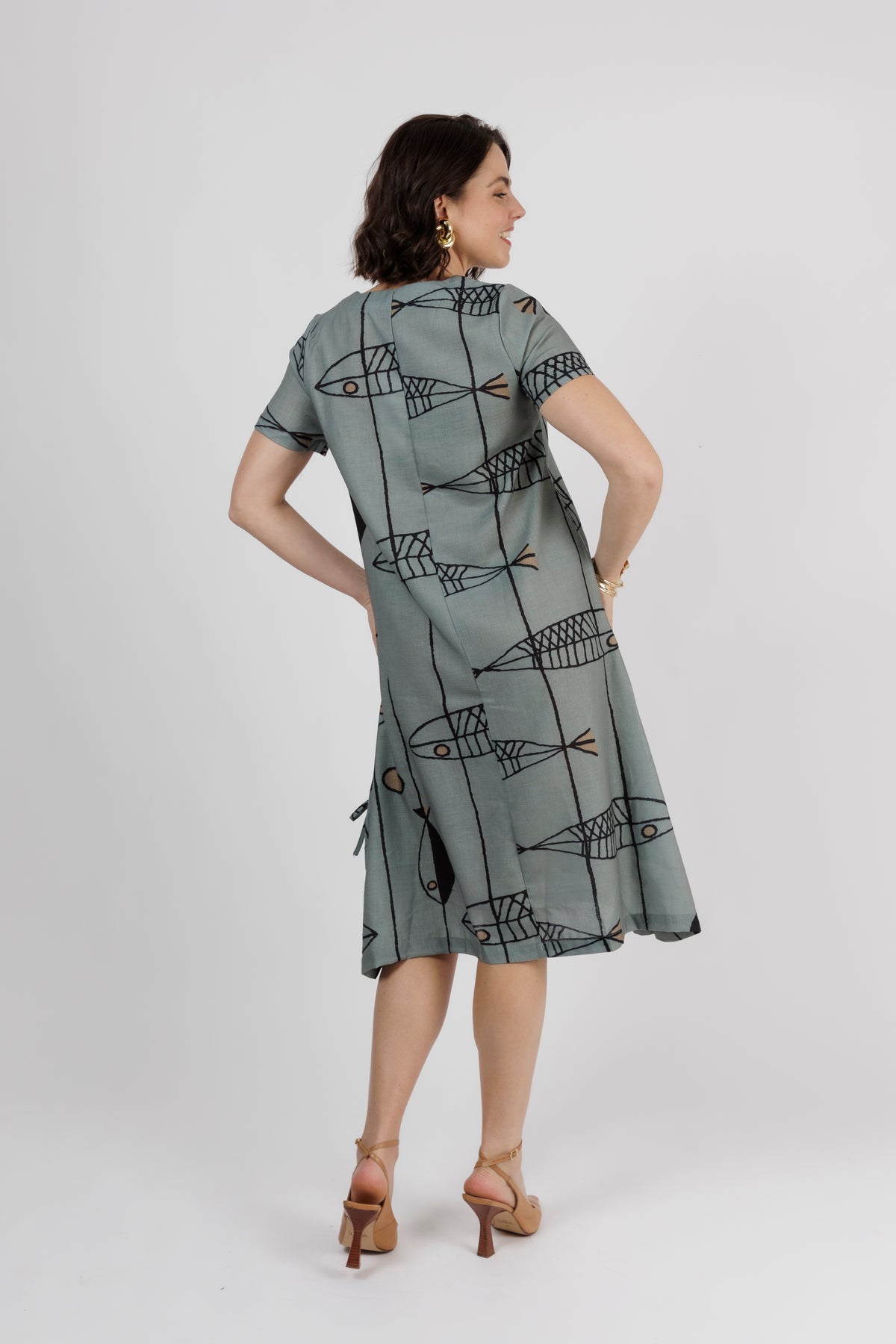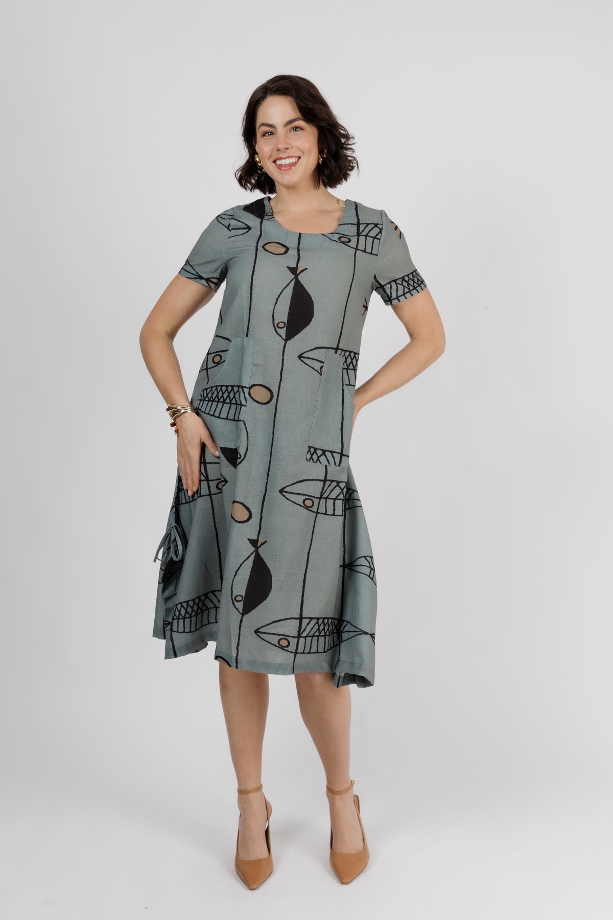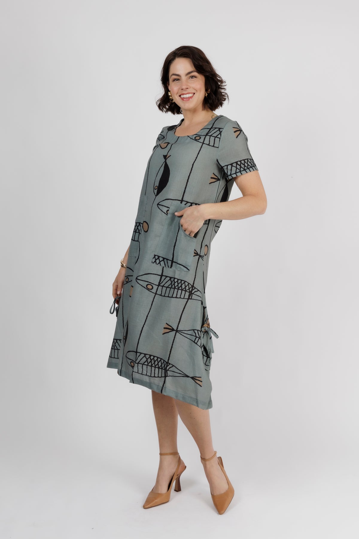 Cut from a soft, breathable linen-cotton blend, it’s perfect for summer days and effortless everyday wear. The scoop neckline and pleated front bodice flatter the figure while offering relaxed movement. Designed with short sleeves, a swingy A-line silhouette, and practical side pockets, this dress is both stylish and functional.