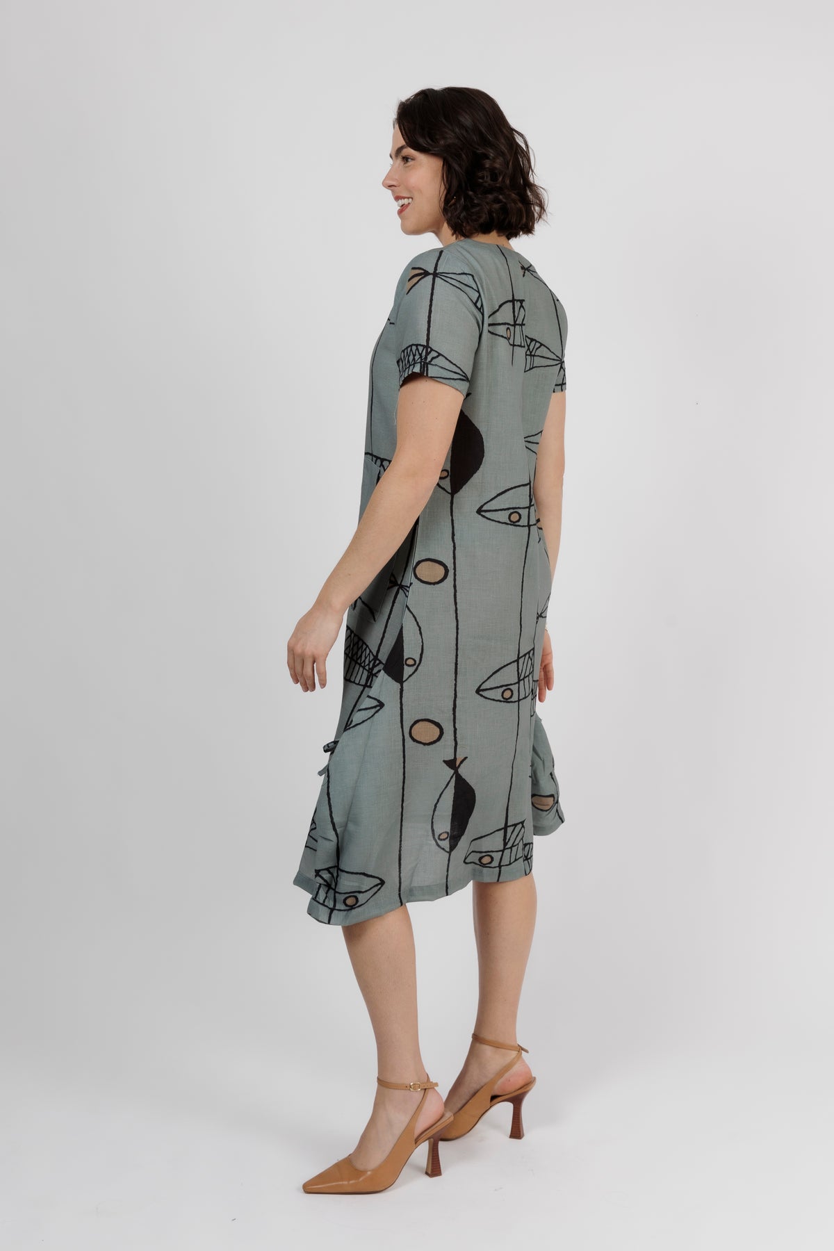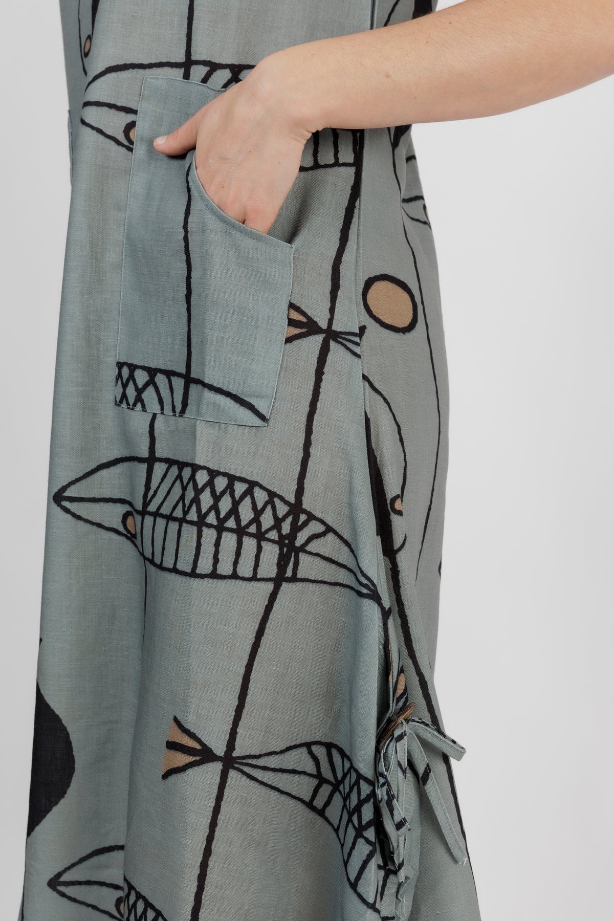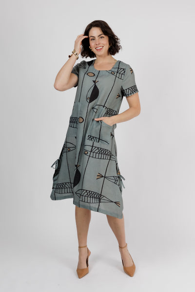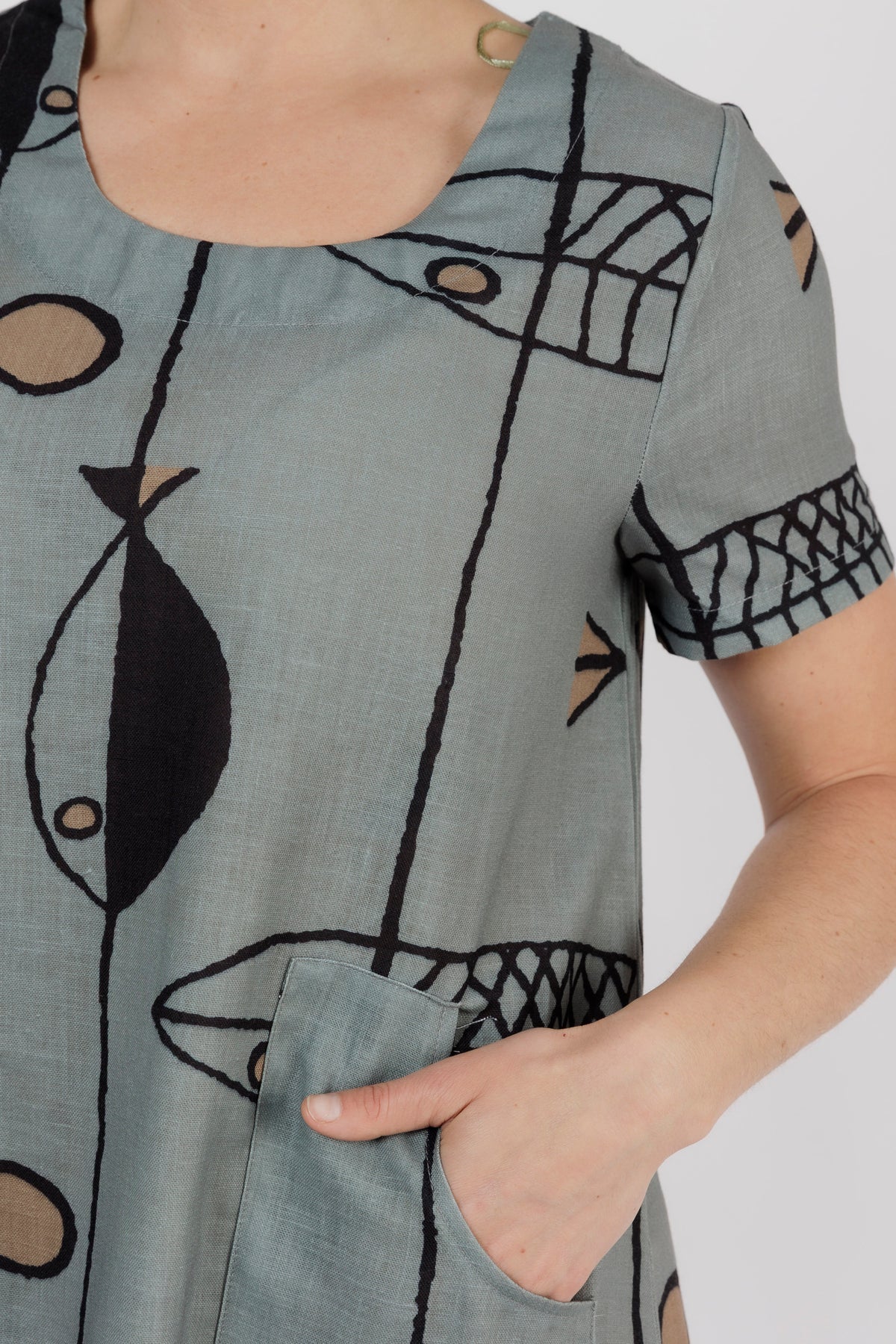 Regular price $59.89 Sale price $39.91Effortlessly chic and easy to wear, this Art Deco Print Linen Cotton Midi Dress combines artistic flair with all-day comfort. Crafted from a breathable linen-cotton blend, it features a unique geometric line print in muted charcoal and beige tones on a soft sage background.