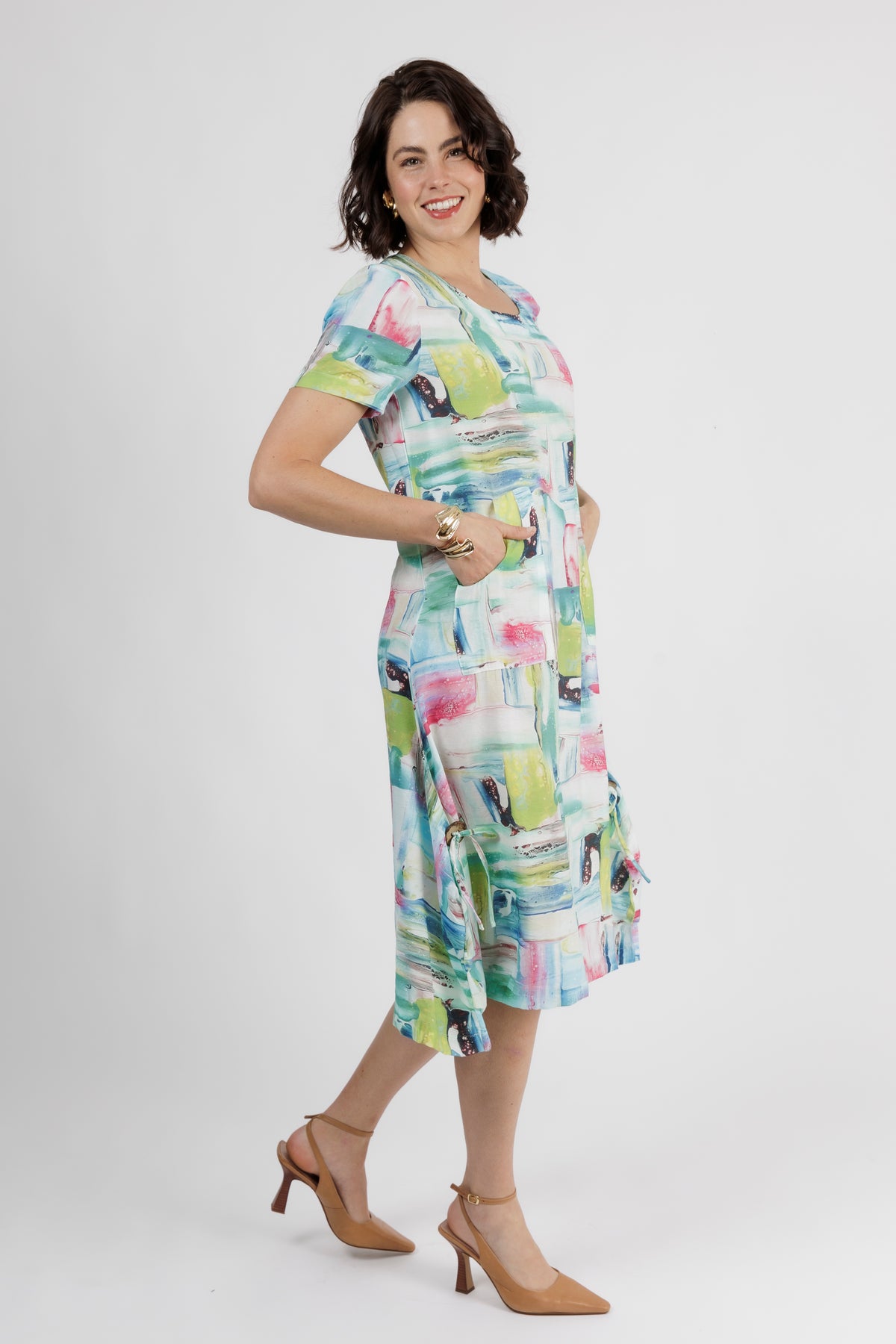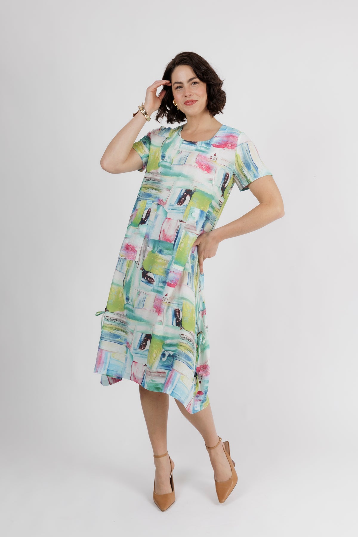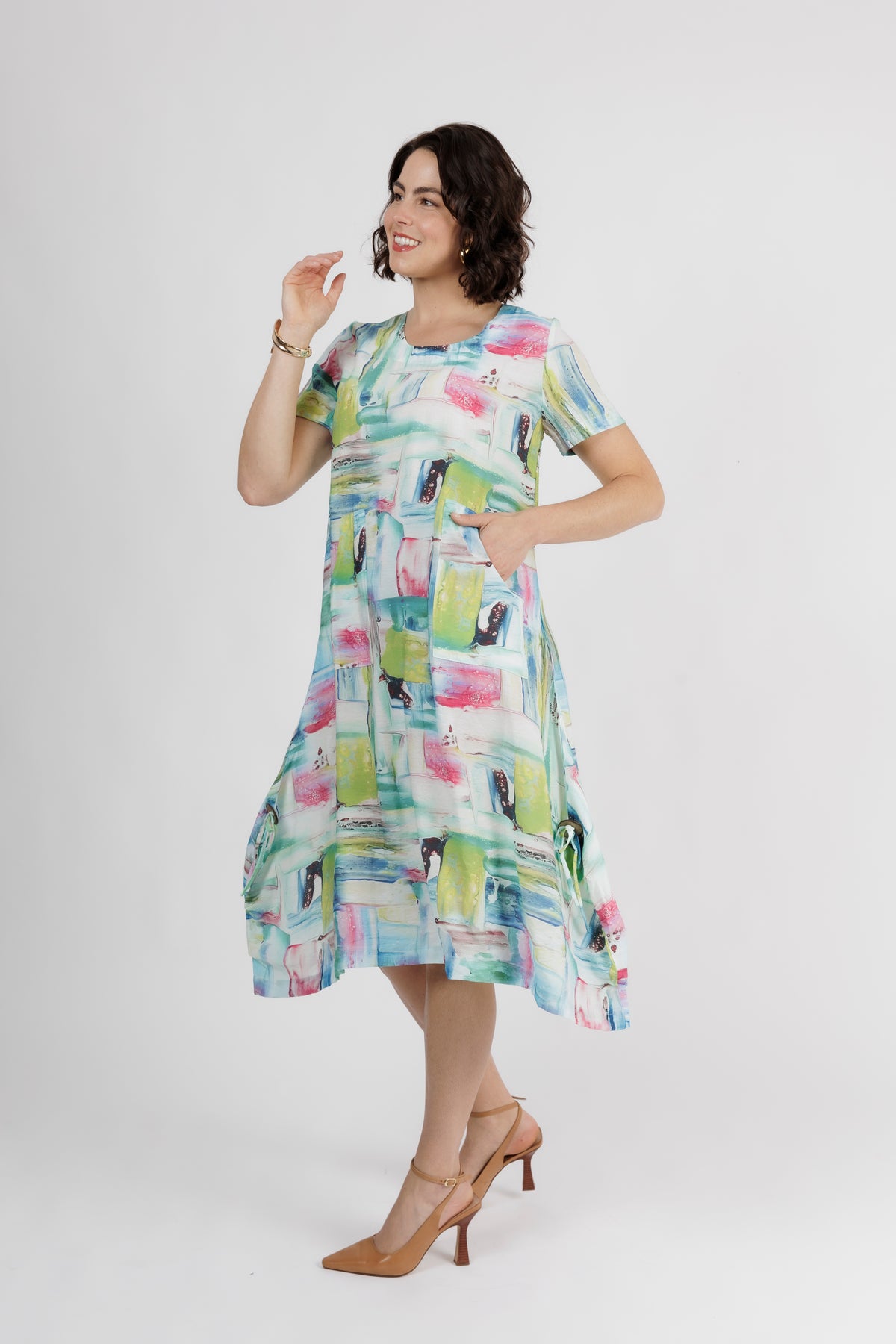 Regular price $59.89 Sale price $39.91Brighten your wardrobe with this refreshing cotton-blend midi dress, featuring a vibrant watercolour-inspired print in shades of mint, aqua, lime, and soft pink. The loose A-line silhouette offers comfort and effortless movement, while the round neckline and short sleeves create a flattering everyday look.