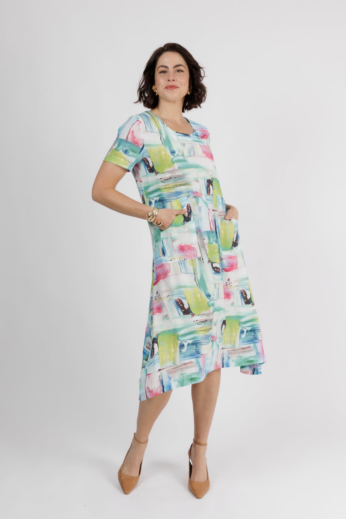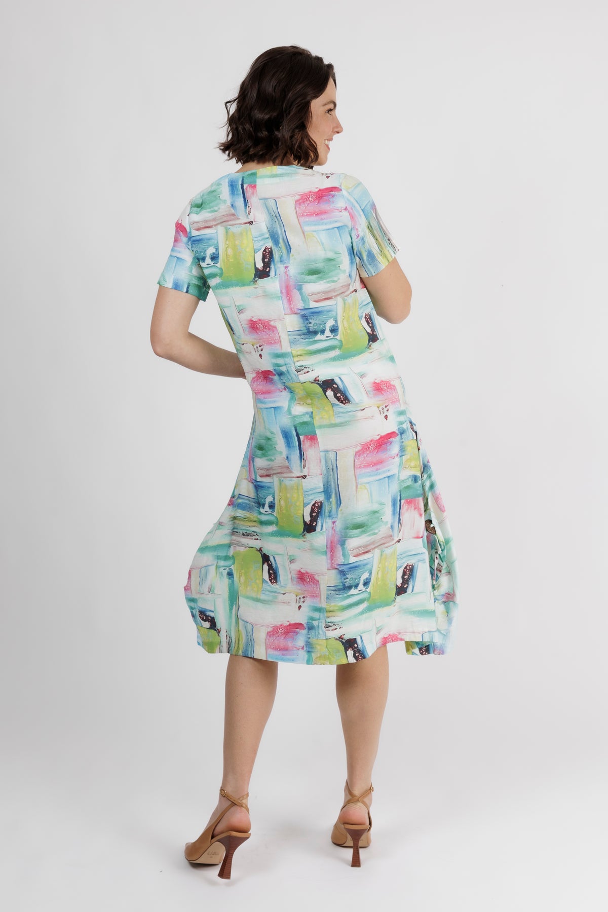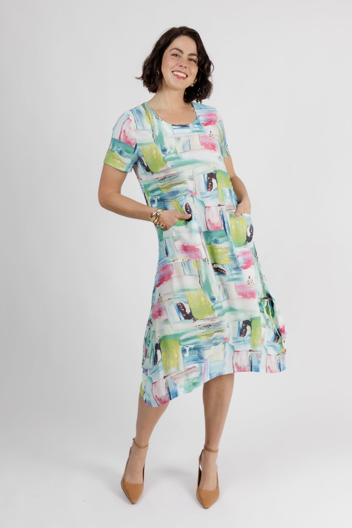 Regular price $59.89 Sale price $39.91Brighten your wardrobe with this refreshing cotton-blend midi dress, featuring a vibrant watercolour-inspired print in shades of mint, aqua, lime, and soft pink. The loose A-line silhouette offers comfort and effortless movement, while the round neckline and short sleeves create a flattering everyday look.