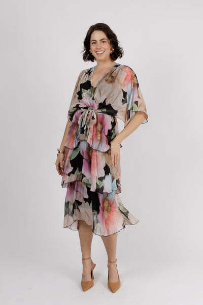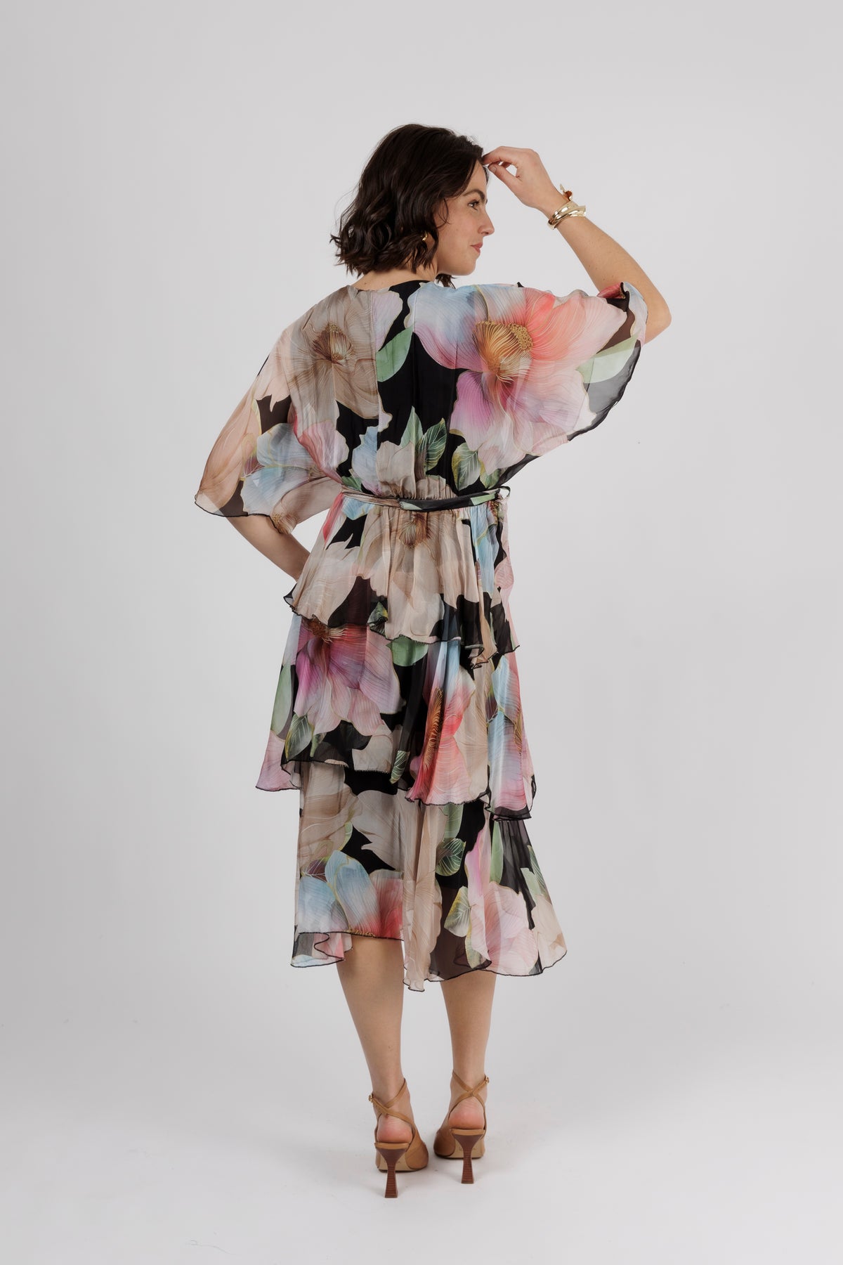 Featuring a painterly floral and butterfly - inspired print in soft greens, wine and gold tones, it captures a bohemian mood.