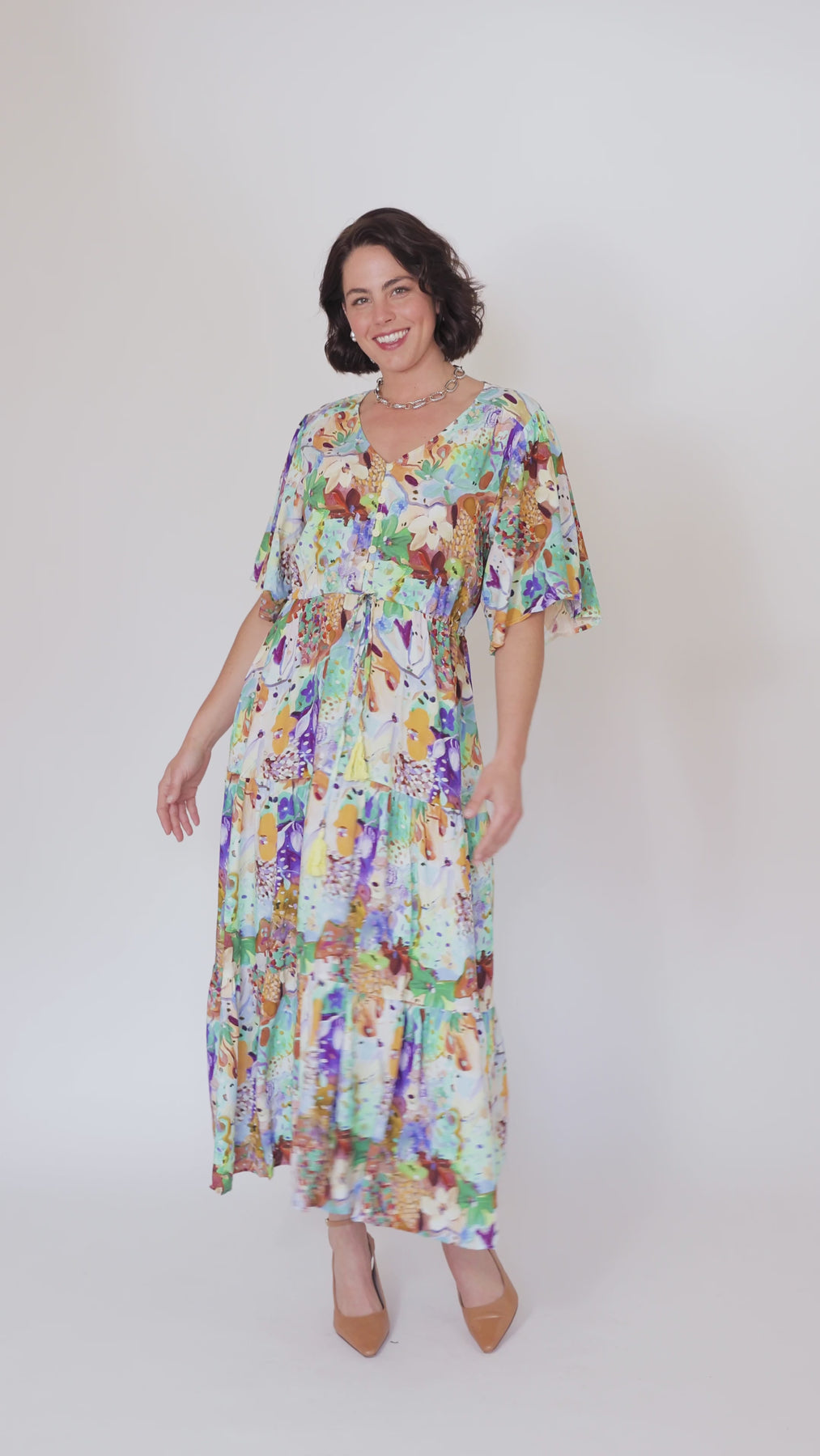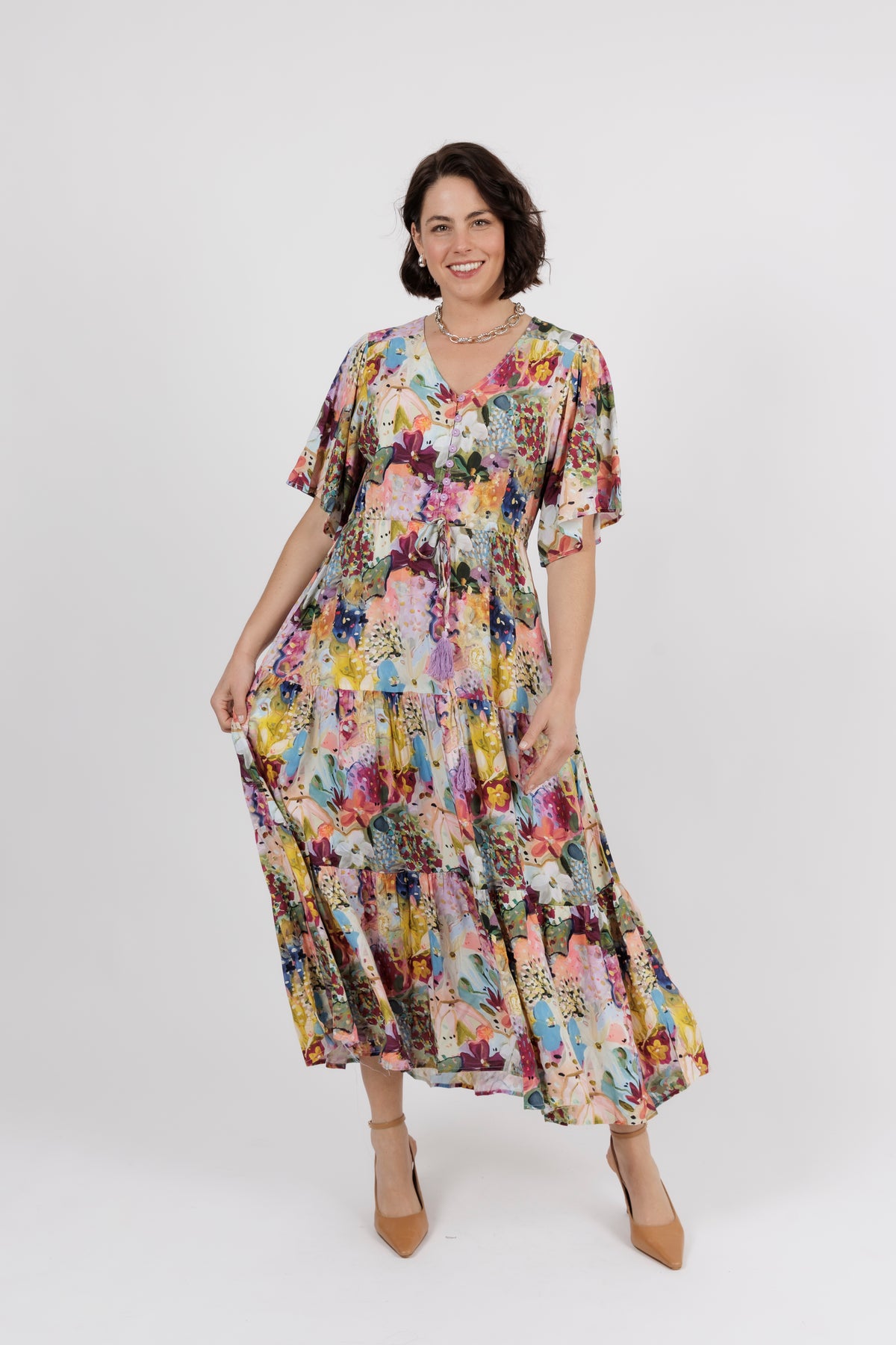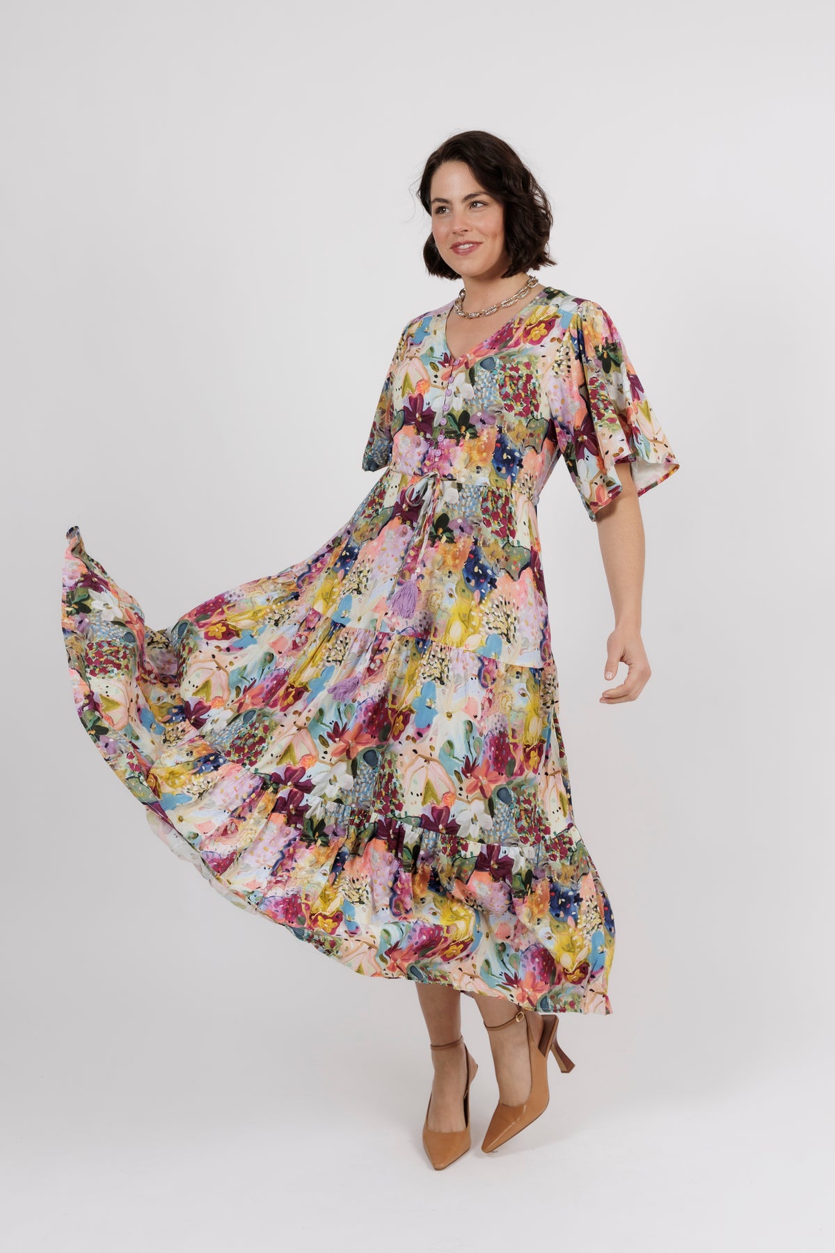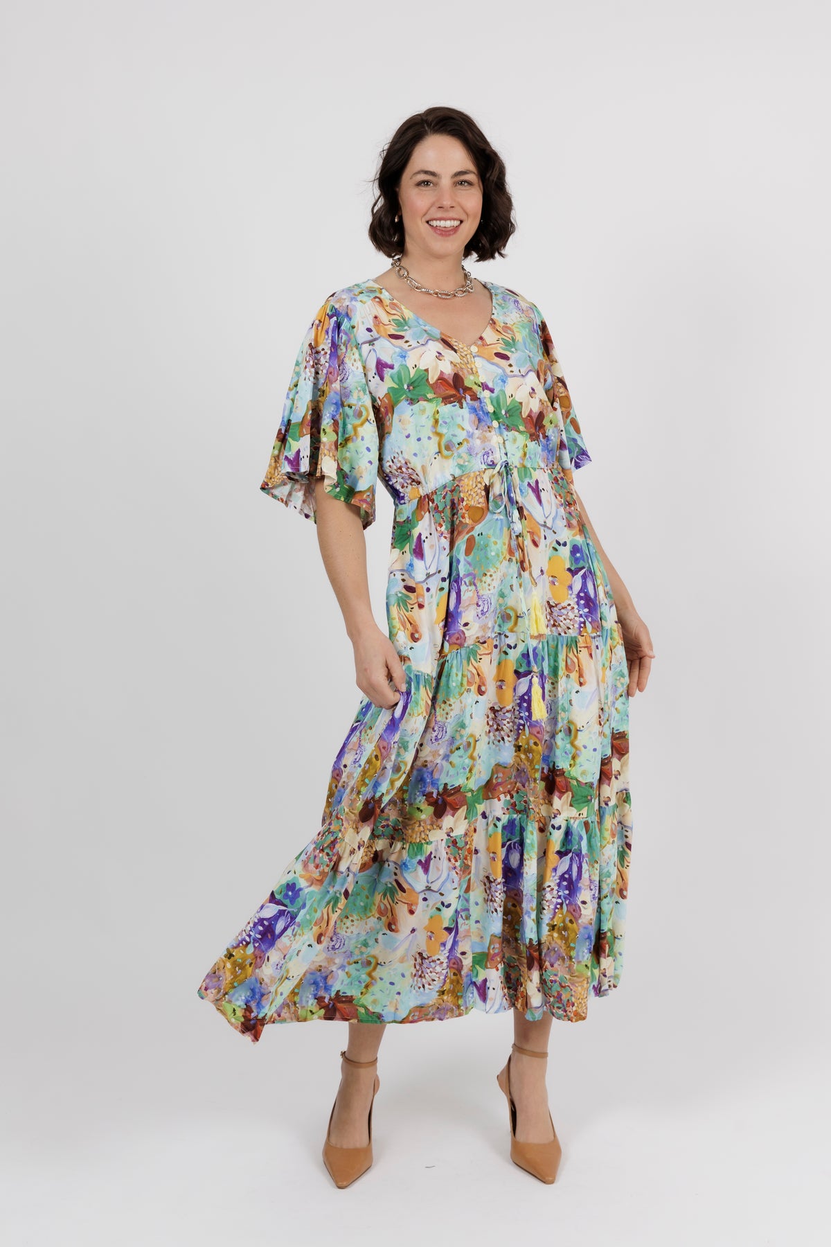 With flutter sleeves, a drawstring waist, and a flowing tiered skirt, this dress combines comfort with elegance. Ideal for daytime events or resort evenings.