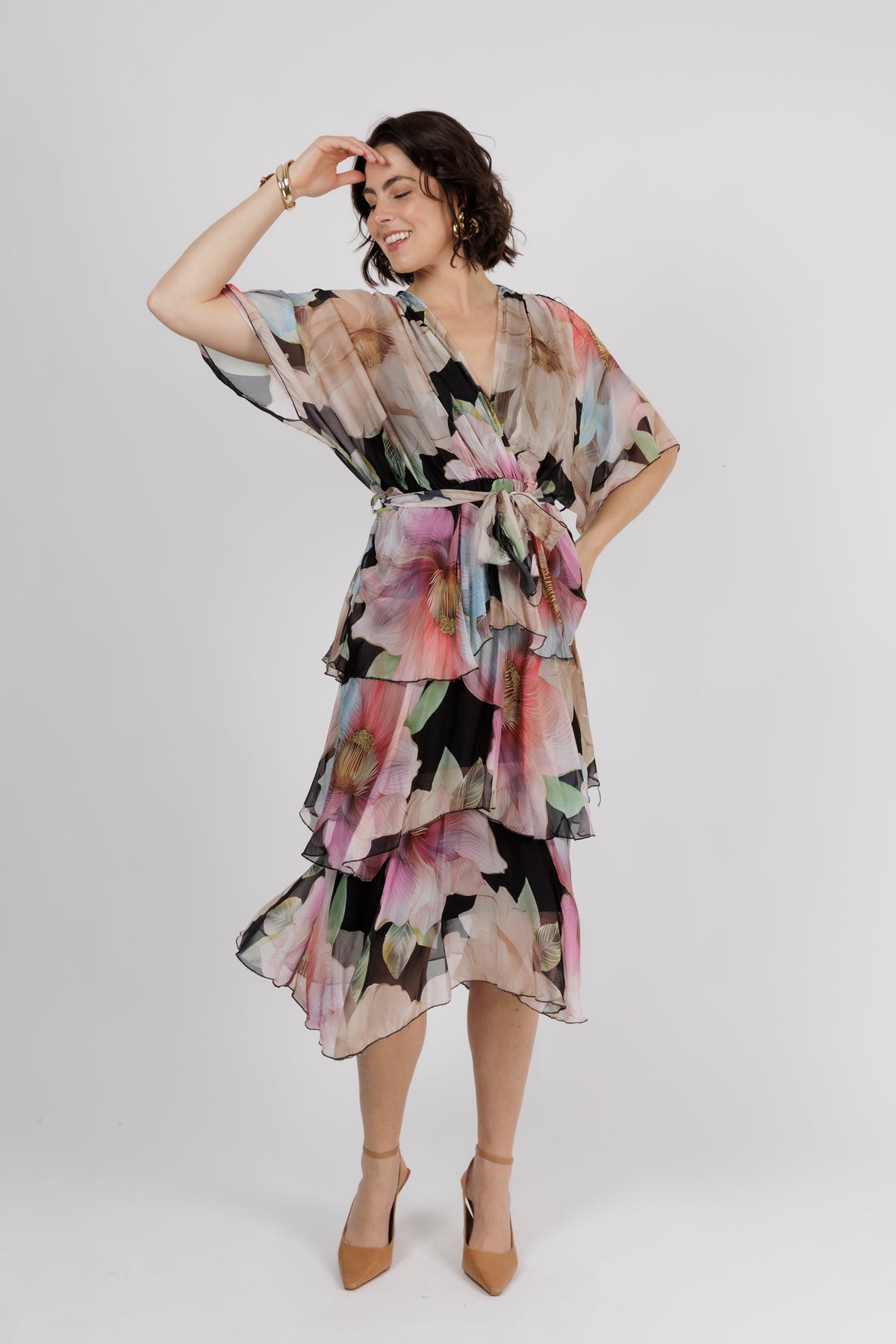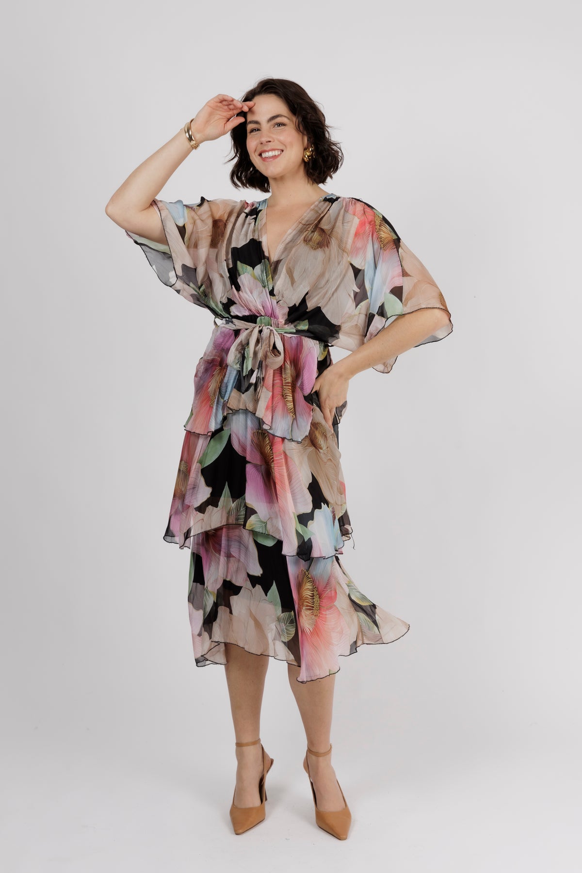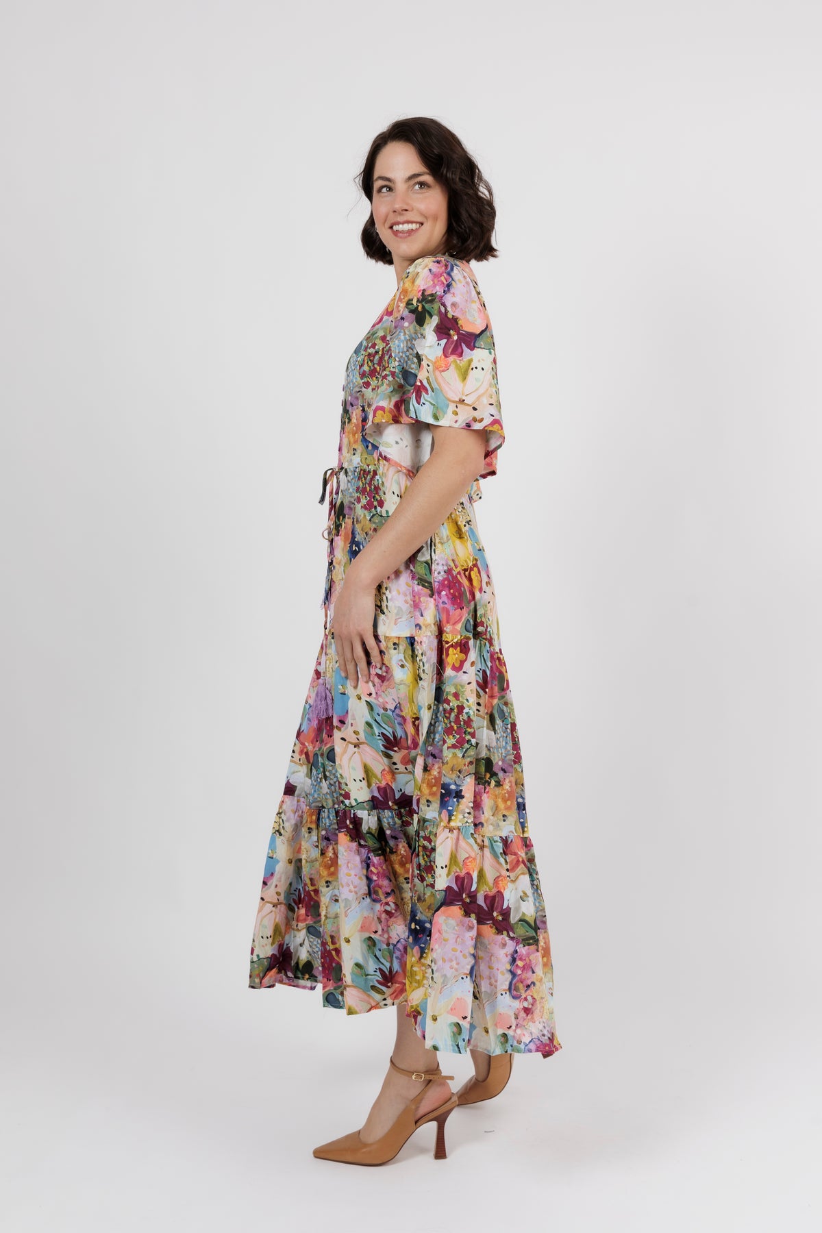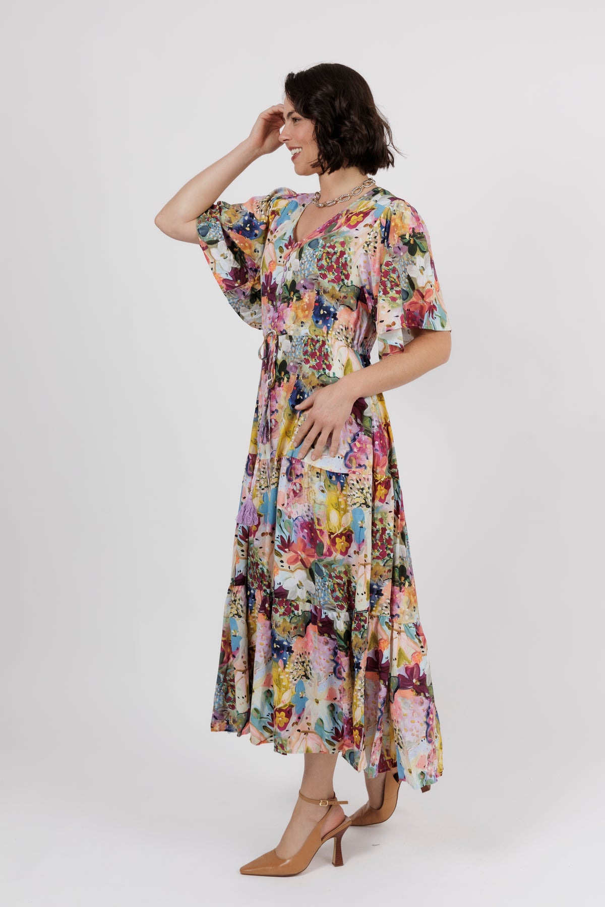 With flutter sleeves, a drawstring waist, and a flowing tiered skirt, this dress combines comfort with elegance. Ideal for daytime events or resort evenings.