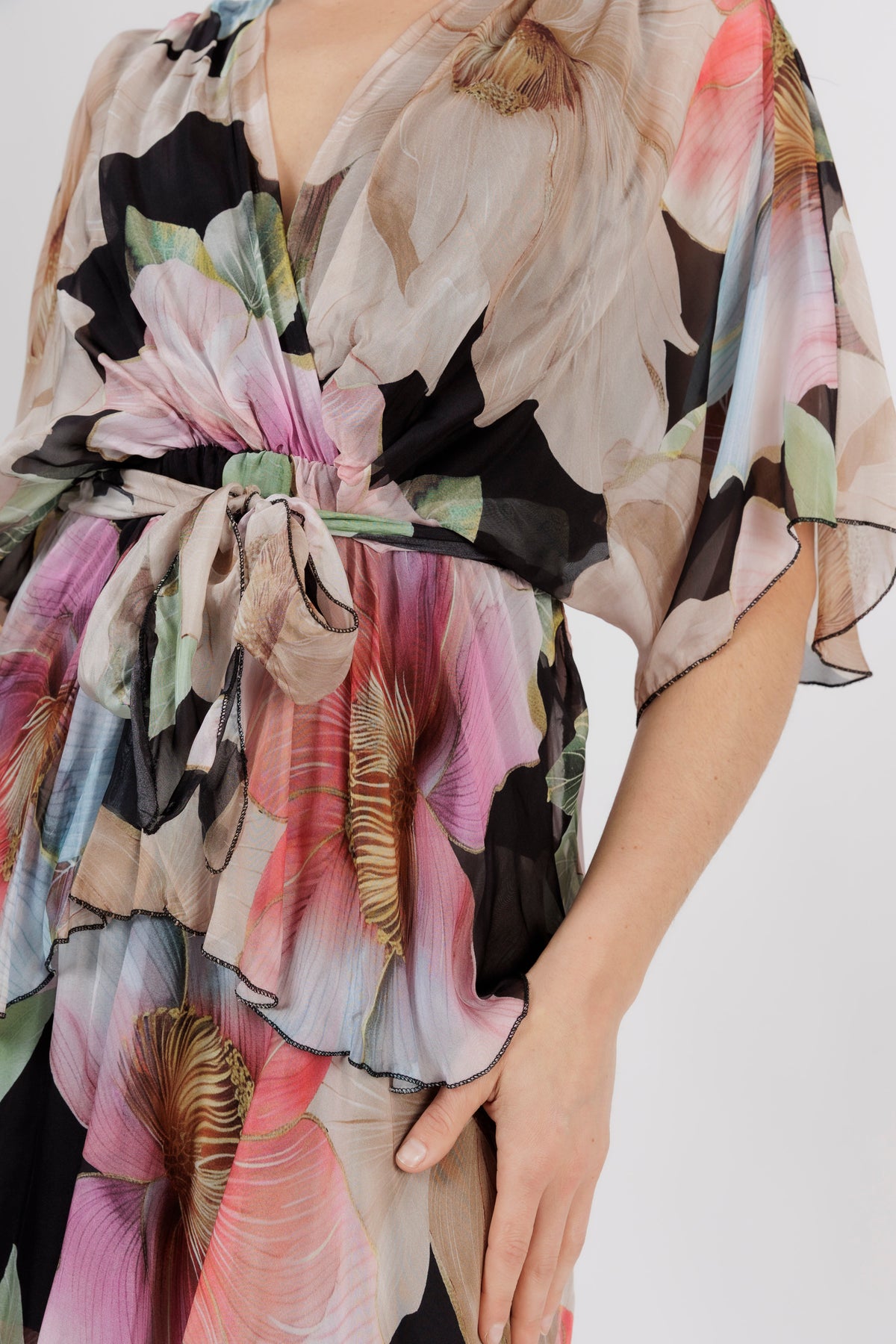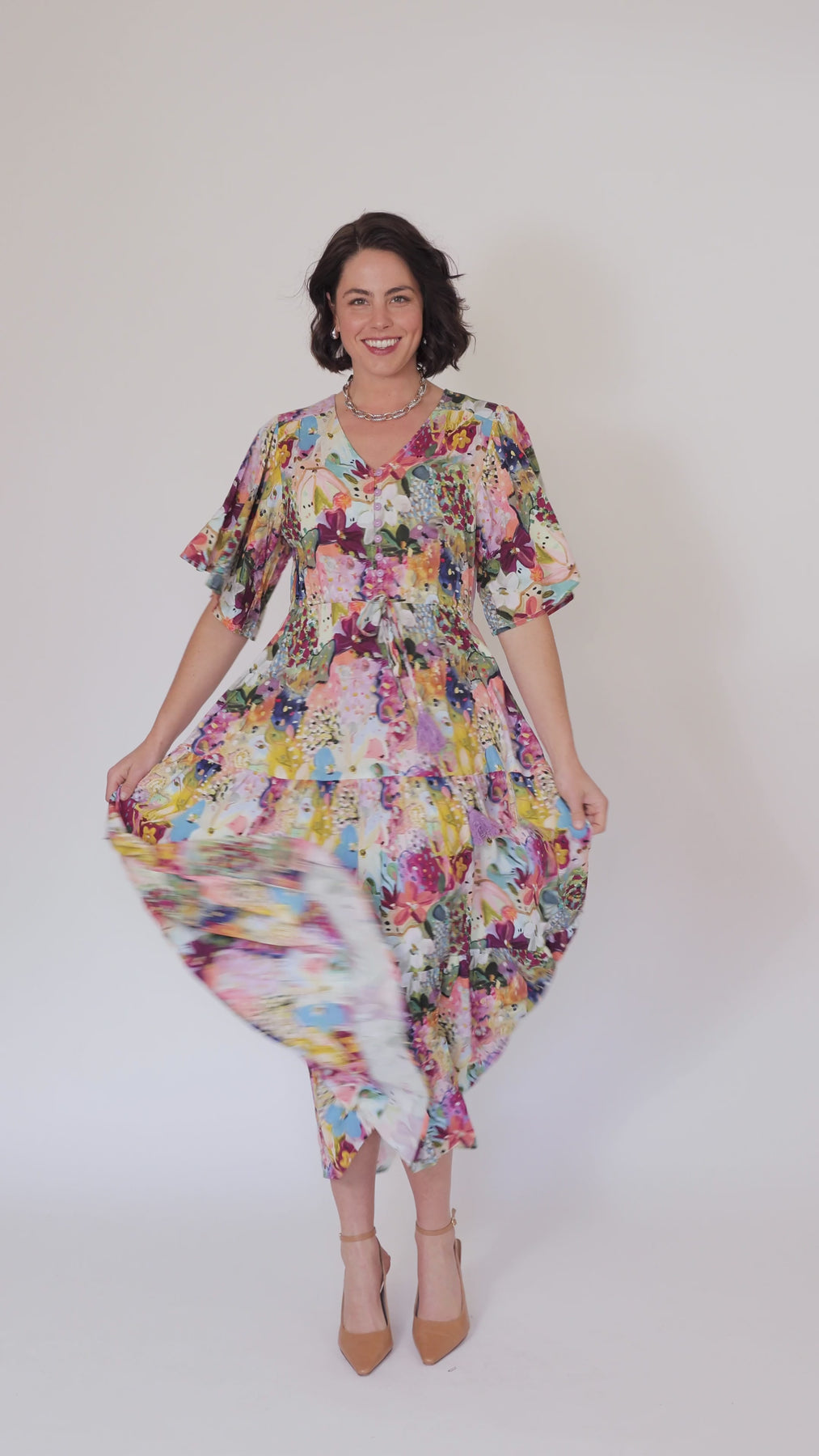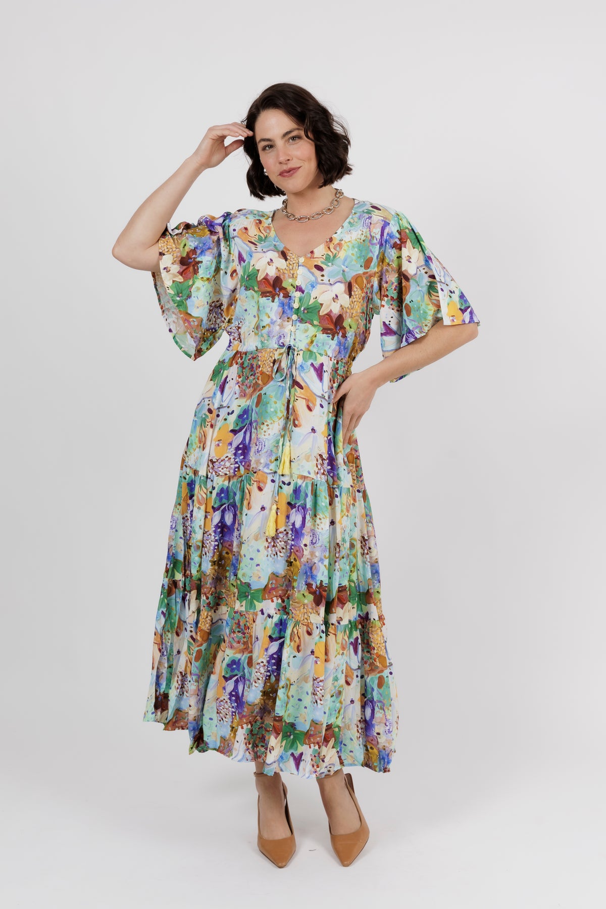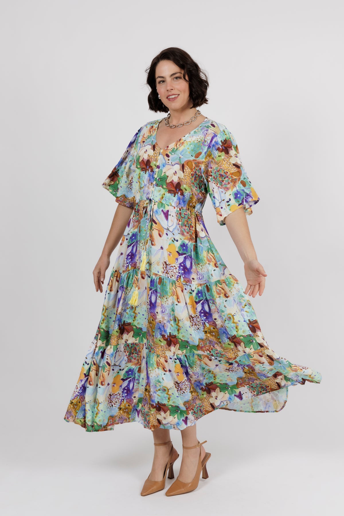 Featuring a painterly floral and butterfly - inspired print in soft greens, purples and gold tones, it captures a bohemian mood.