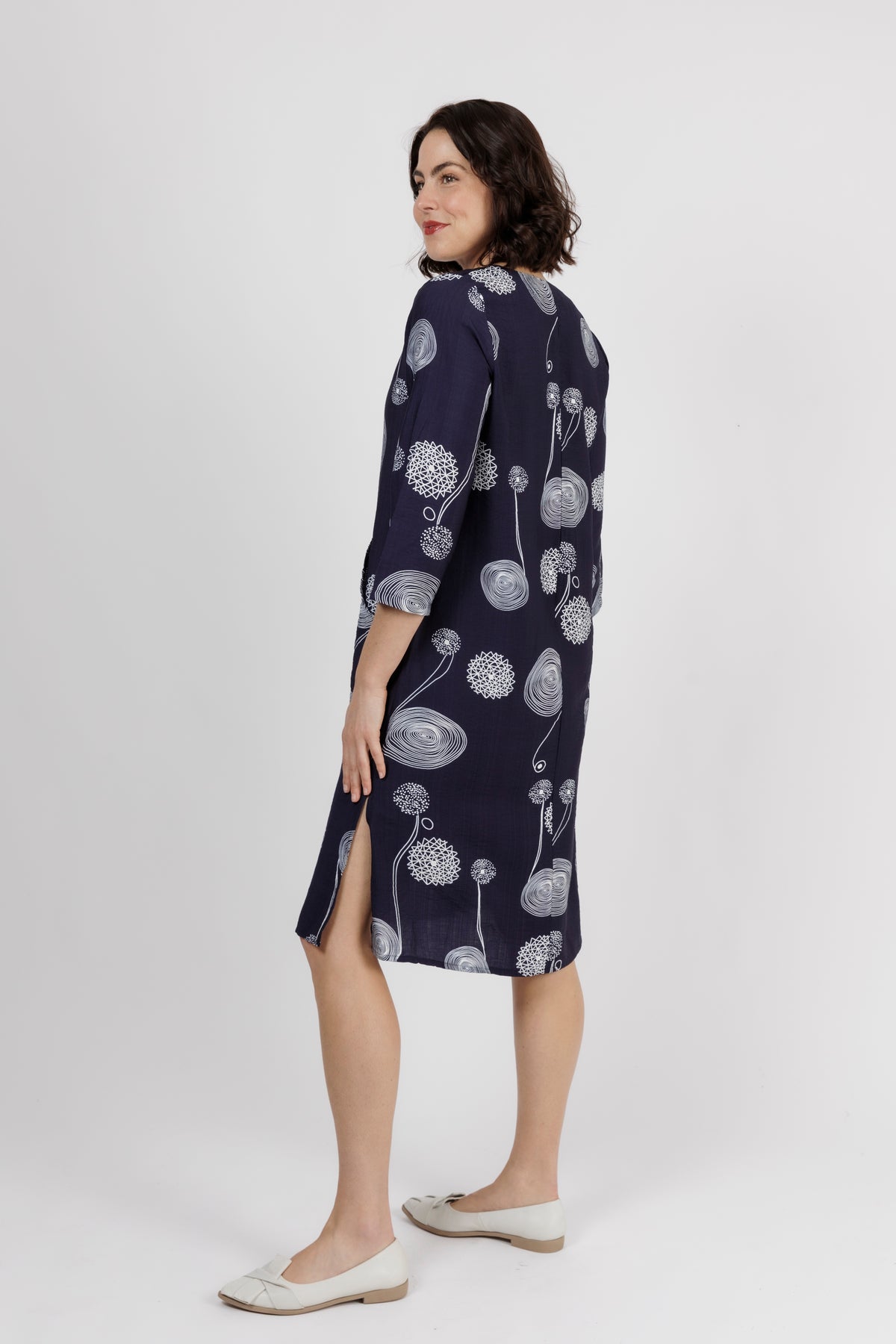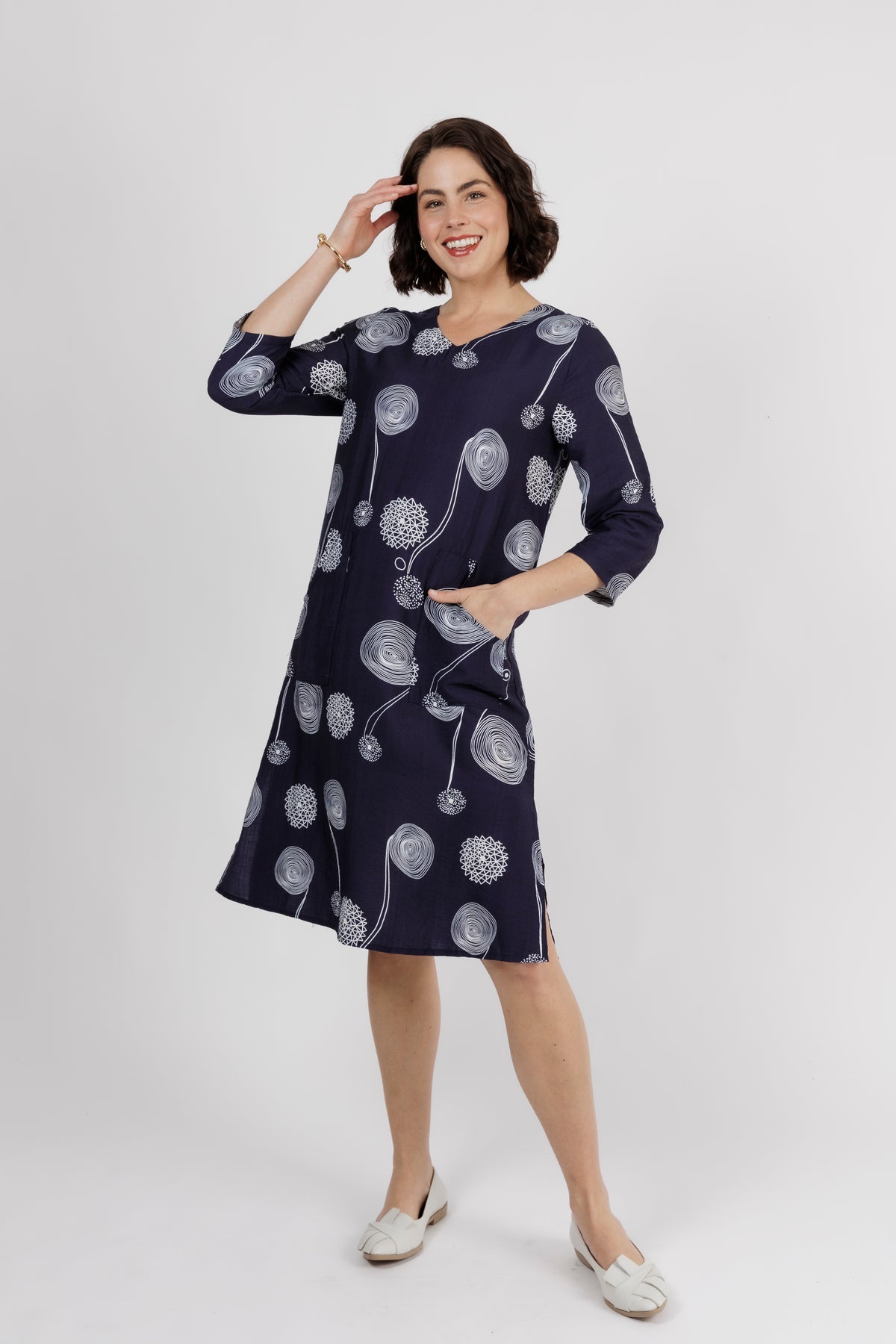 LIDA Navy Art Decor Print Linen Blend Midi Dress