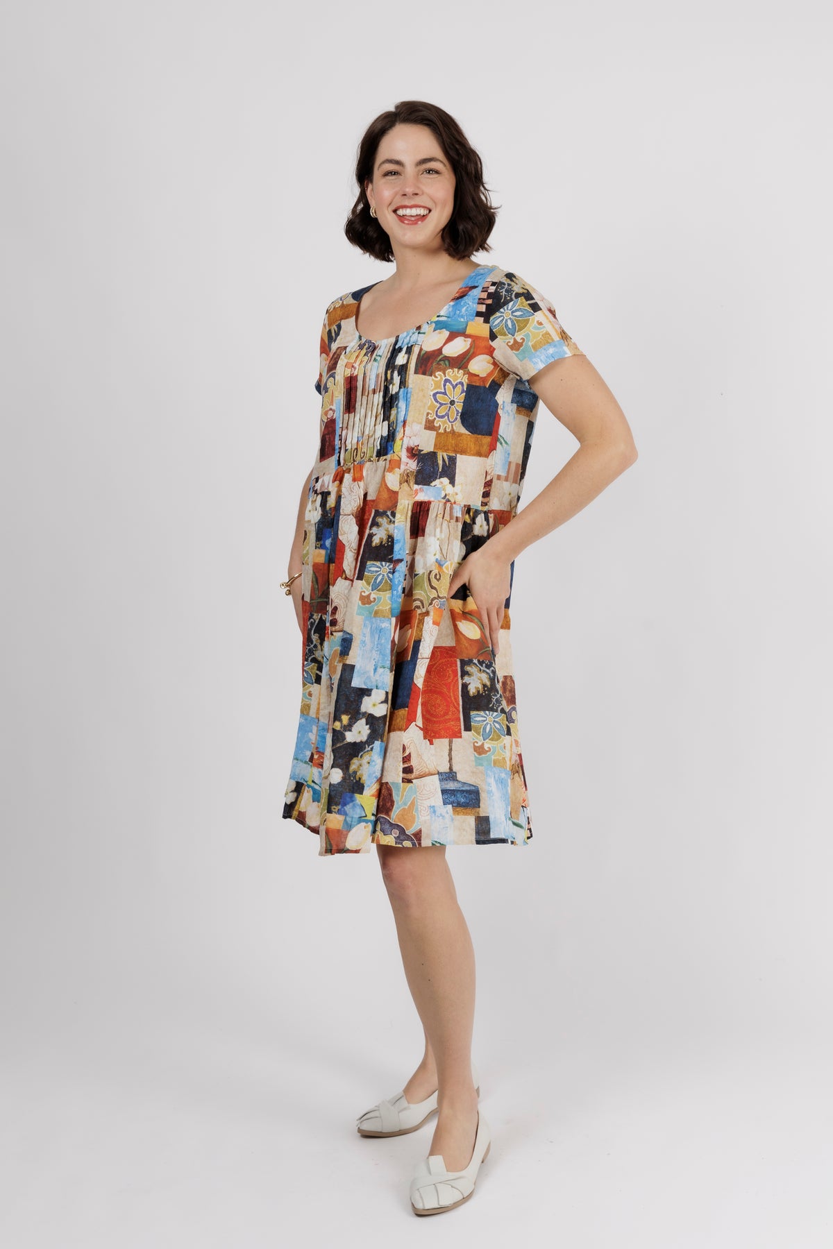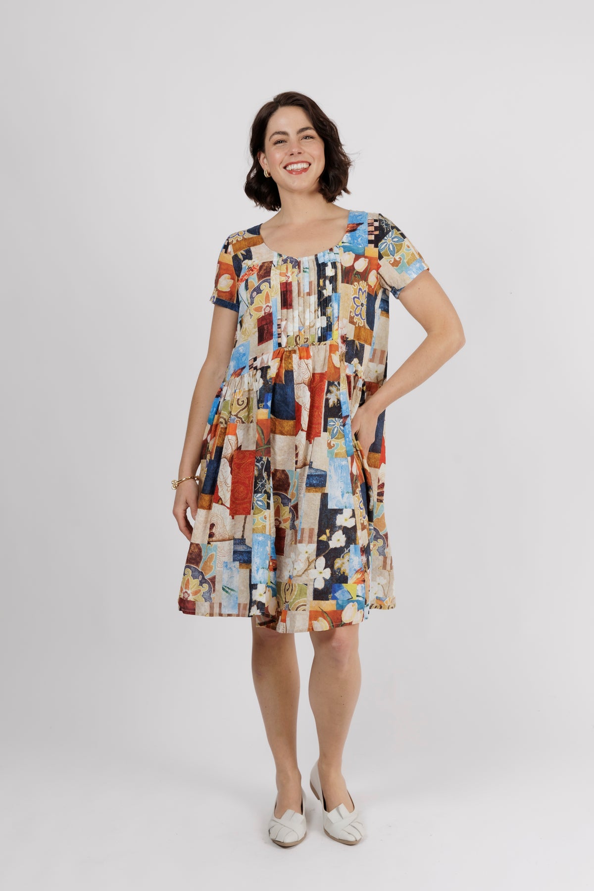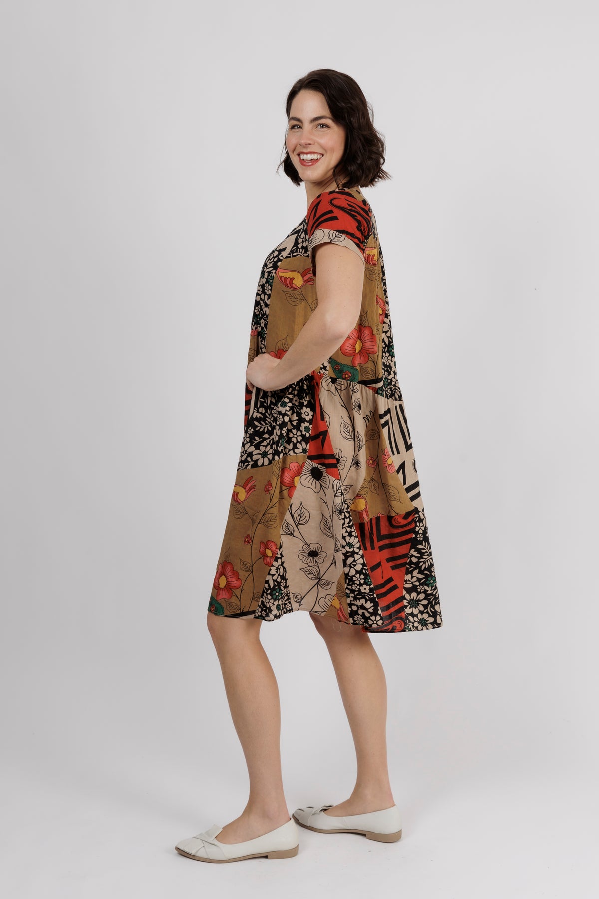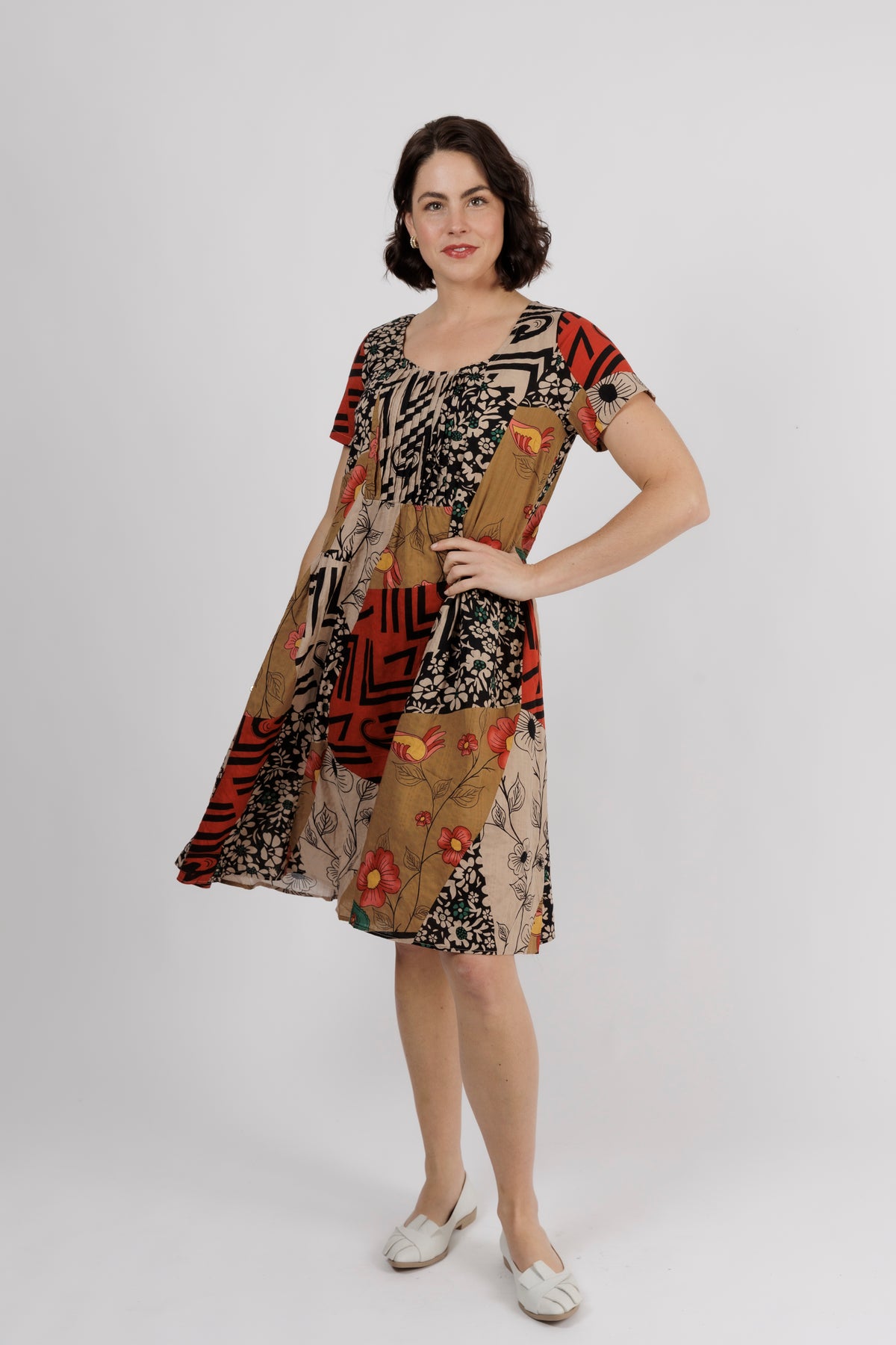 Regular price $59.89 Sale price $39.91Bring colour and creativity to your summer wardrobe with our Patchwork Print Cotton-Blend Dress, a relaxed and flattering style designed for everyday comfort. This vibrant design features an artistic patchwork pattern combining floral, geometric, and abstract elements in warm earthy tones with pops of blue and red.