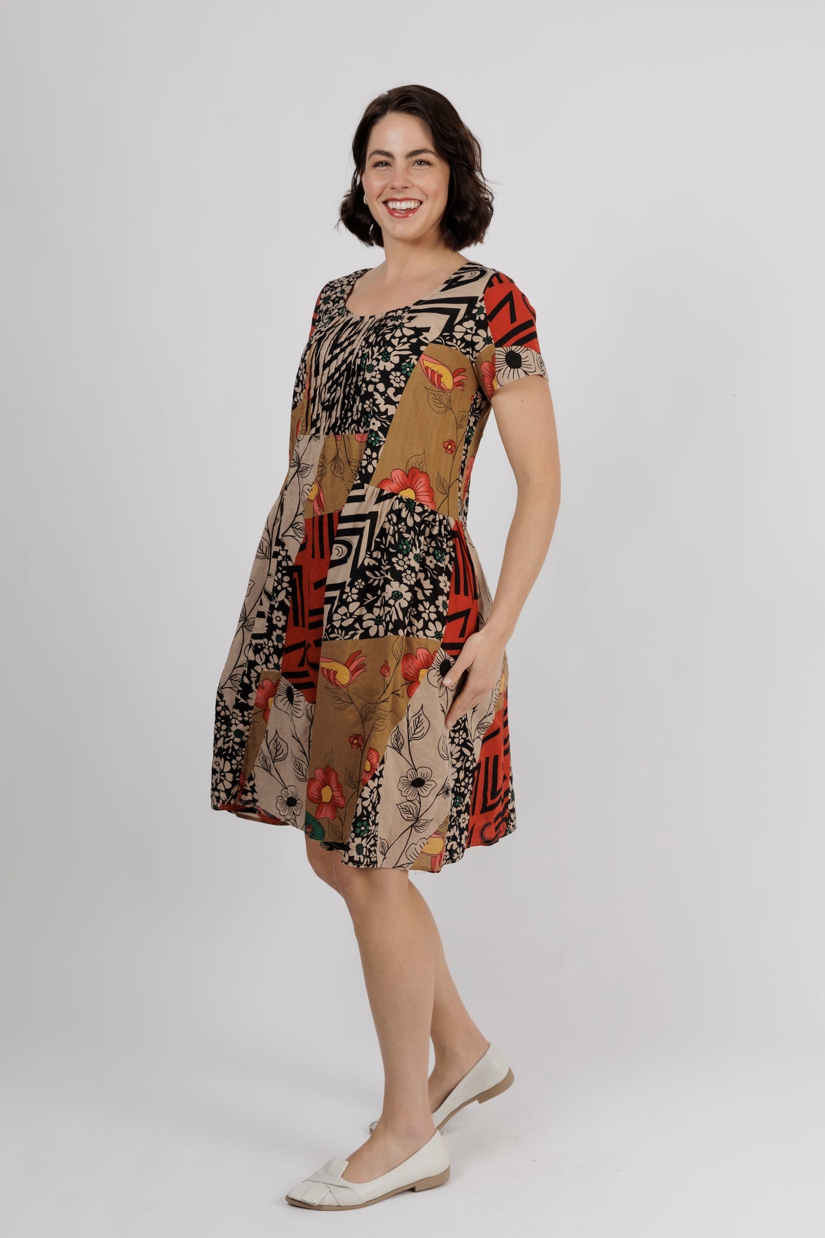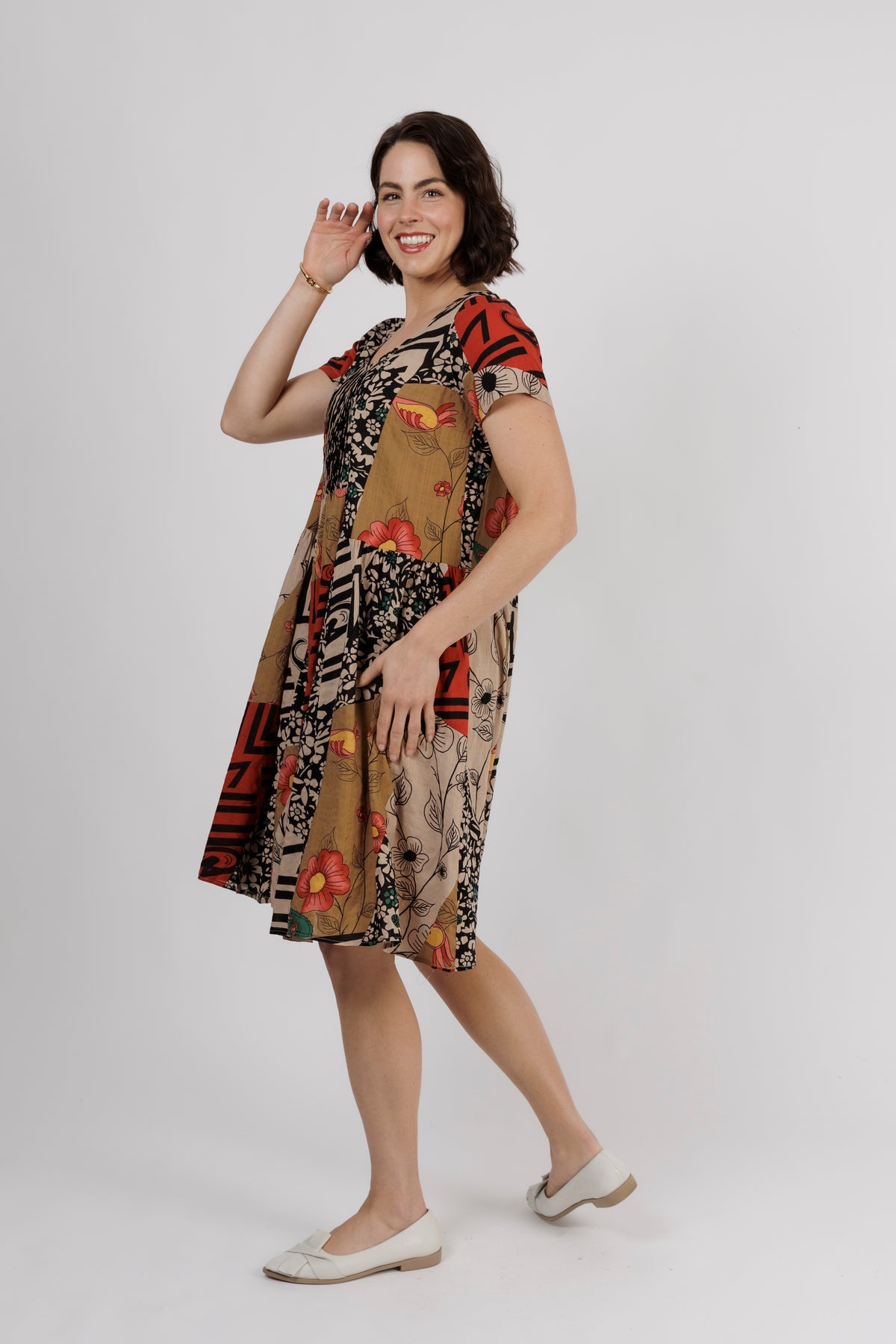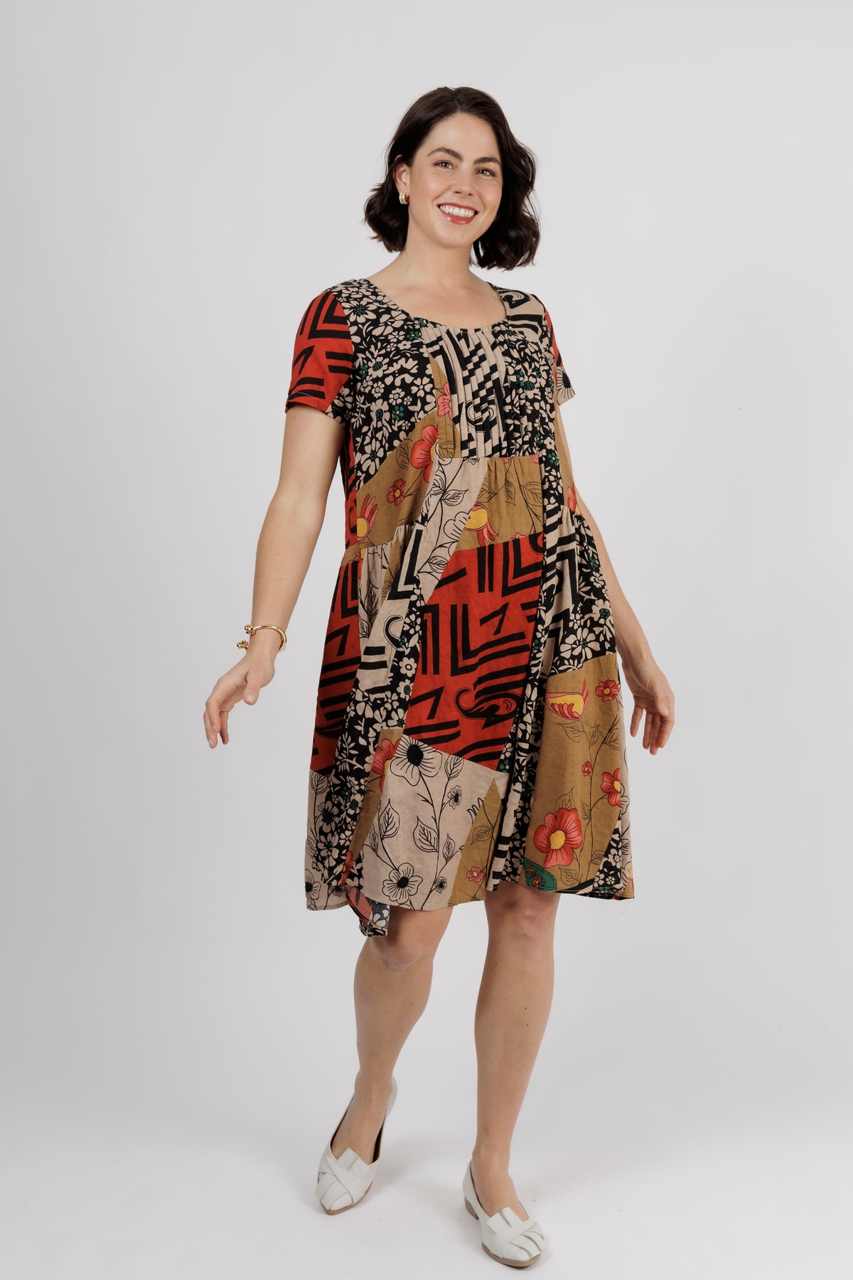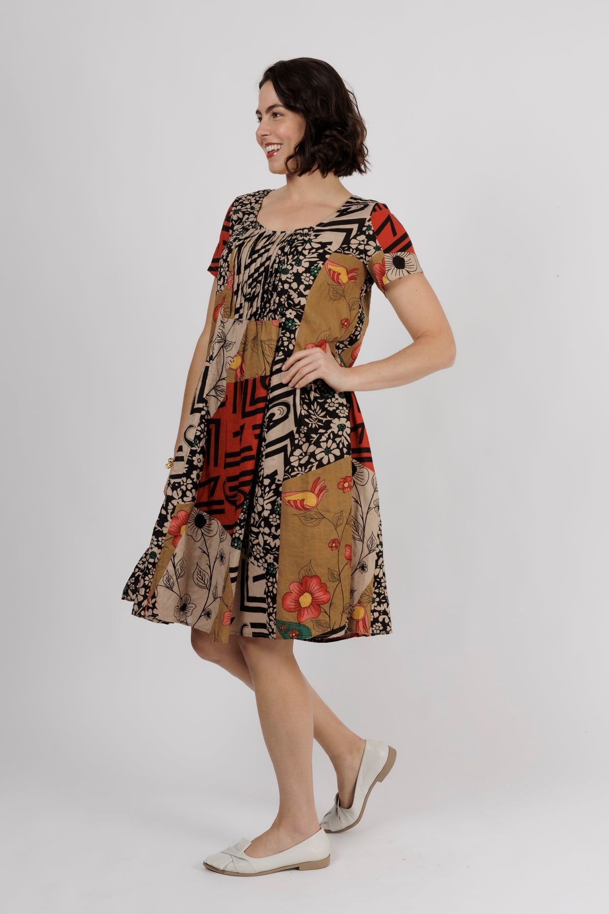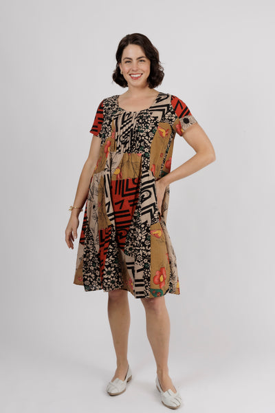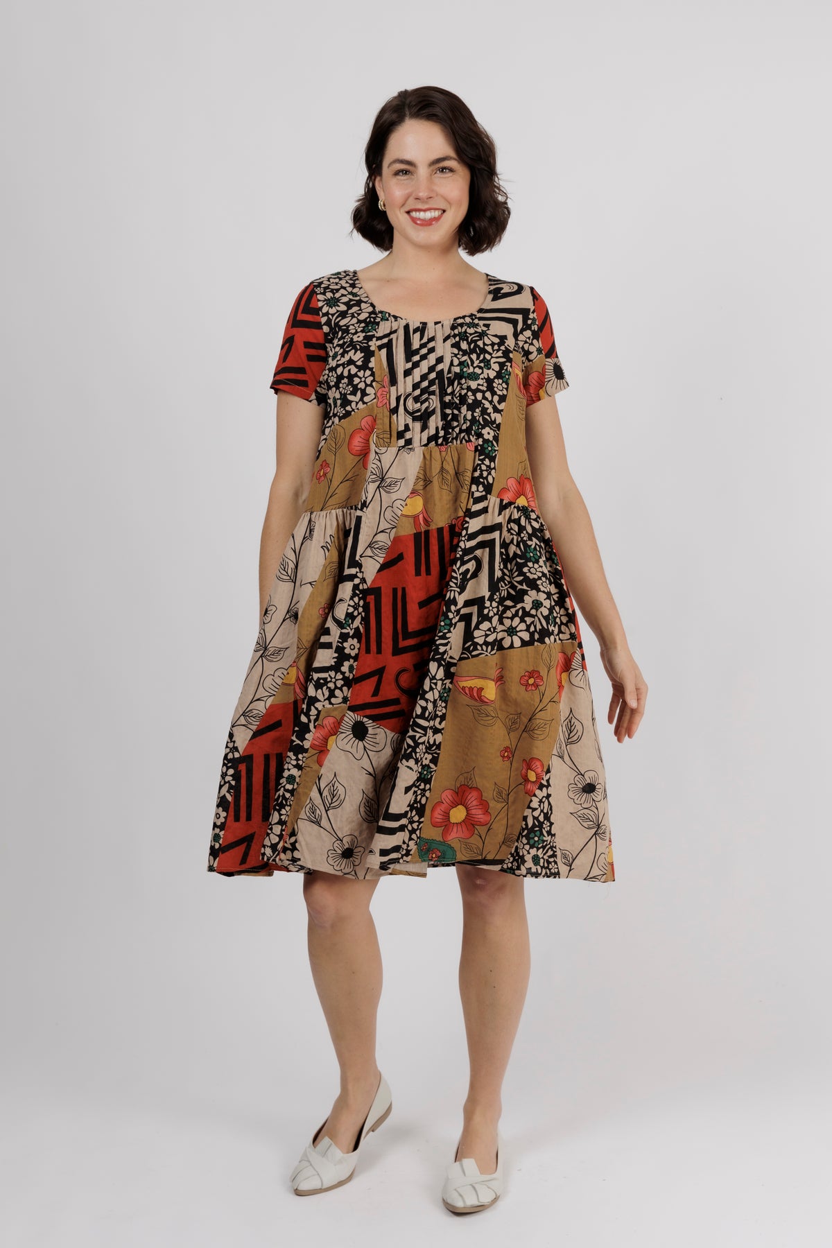 KAREN Earth Tone Patchwork Cotton Blend Dress