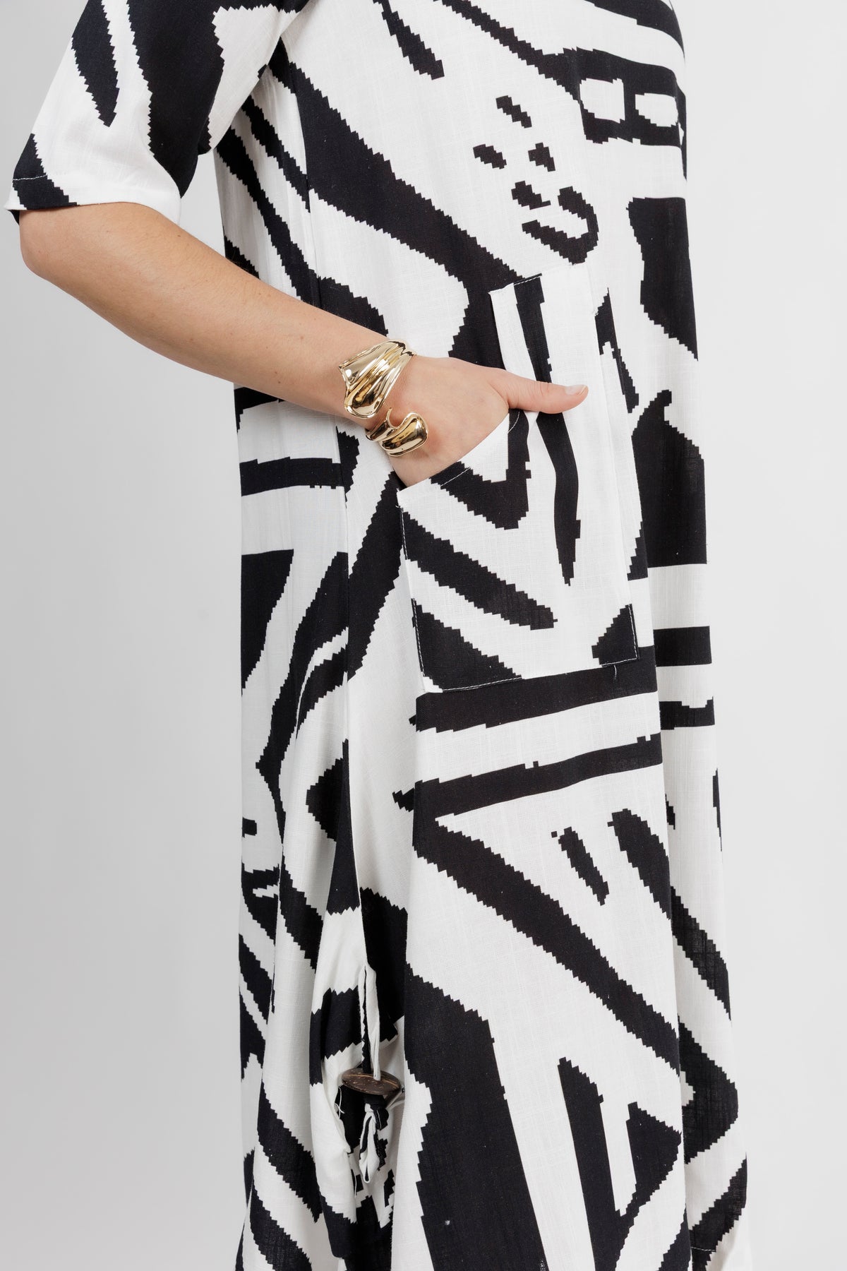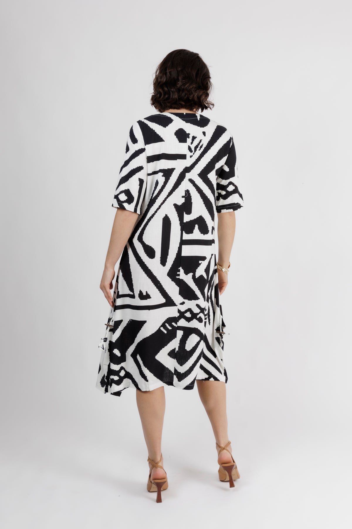 Regular price $59.89 Sale price $39.91Make a statement in this striking Monochrome Abstract Linen Cotton Midi Dress, where art meets comfort. Crafted from a soft, breathable linen-cotton blend, this modern piece features a bold black-and-white brushstroke print that adds instant sophistication to your look.
