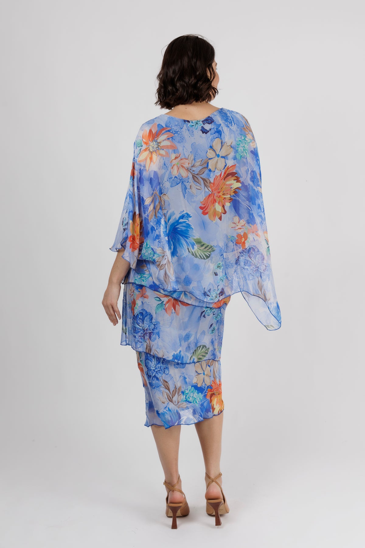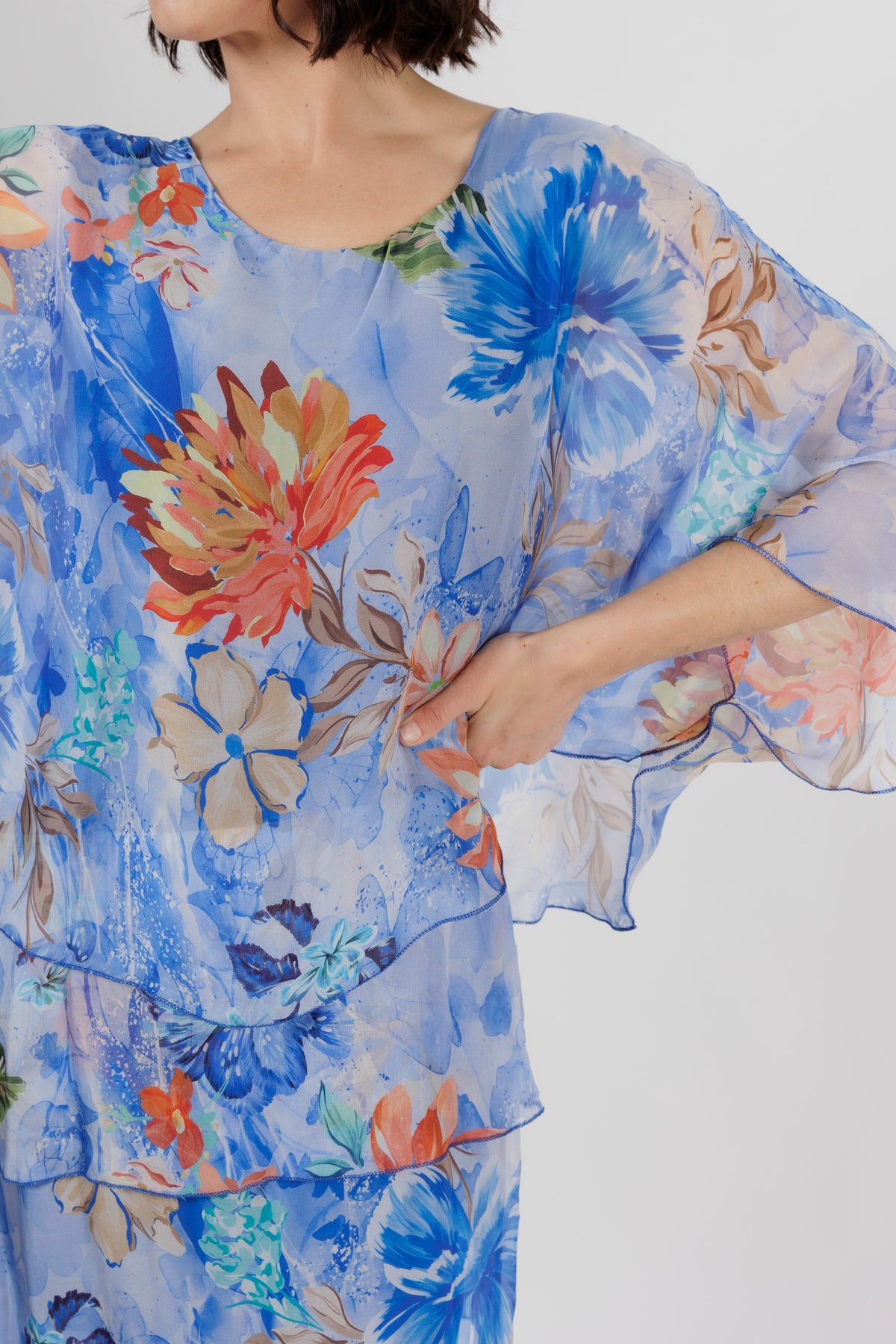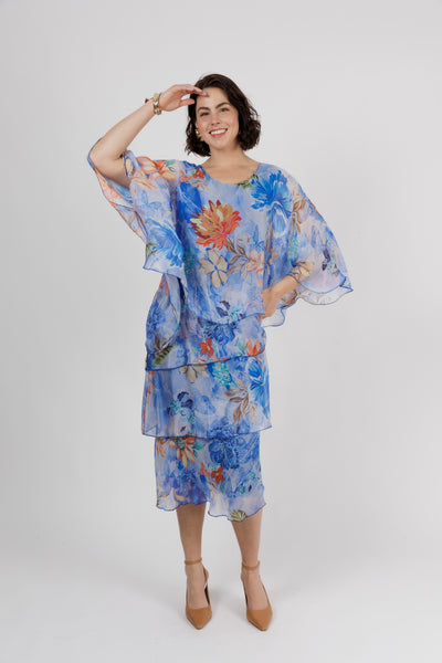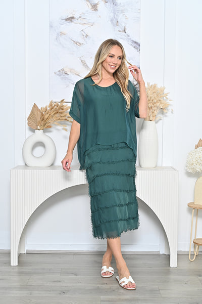 - Layers of silk blend fabric, with raw hems, create a flattering tiered silhouette from the waist down