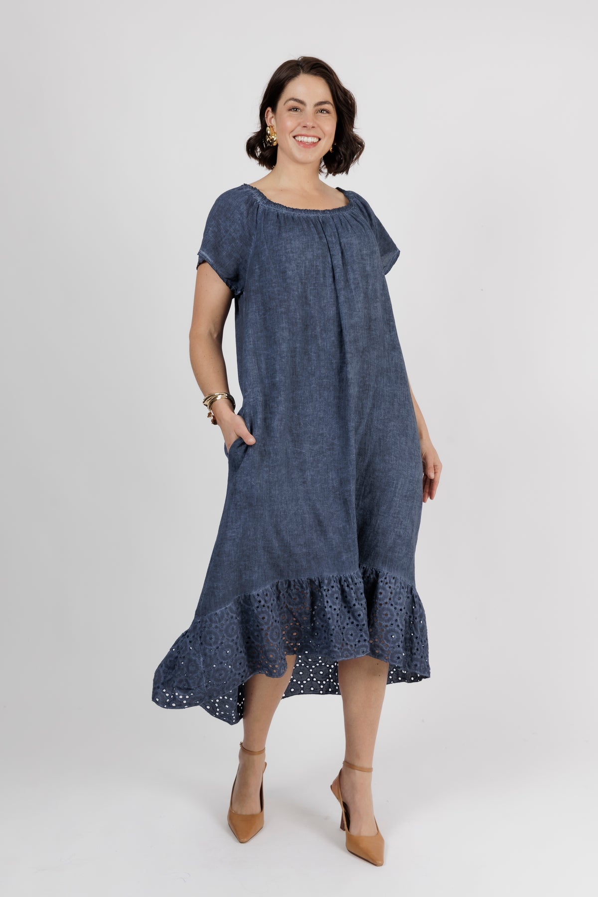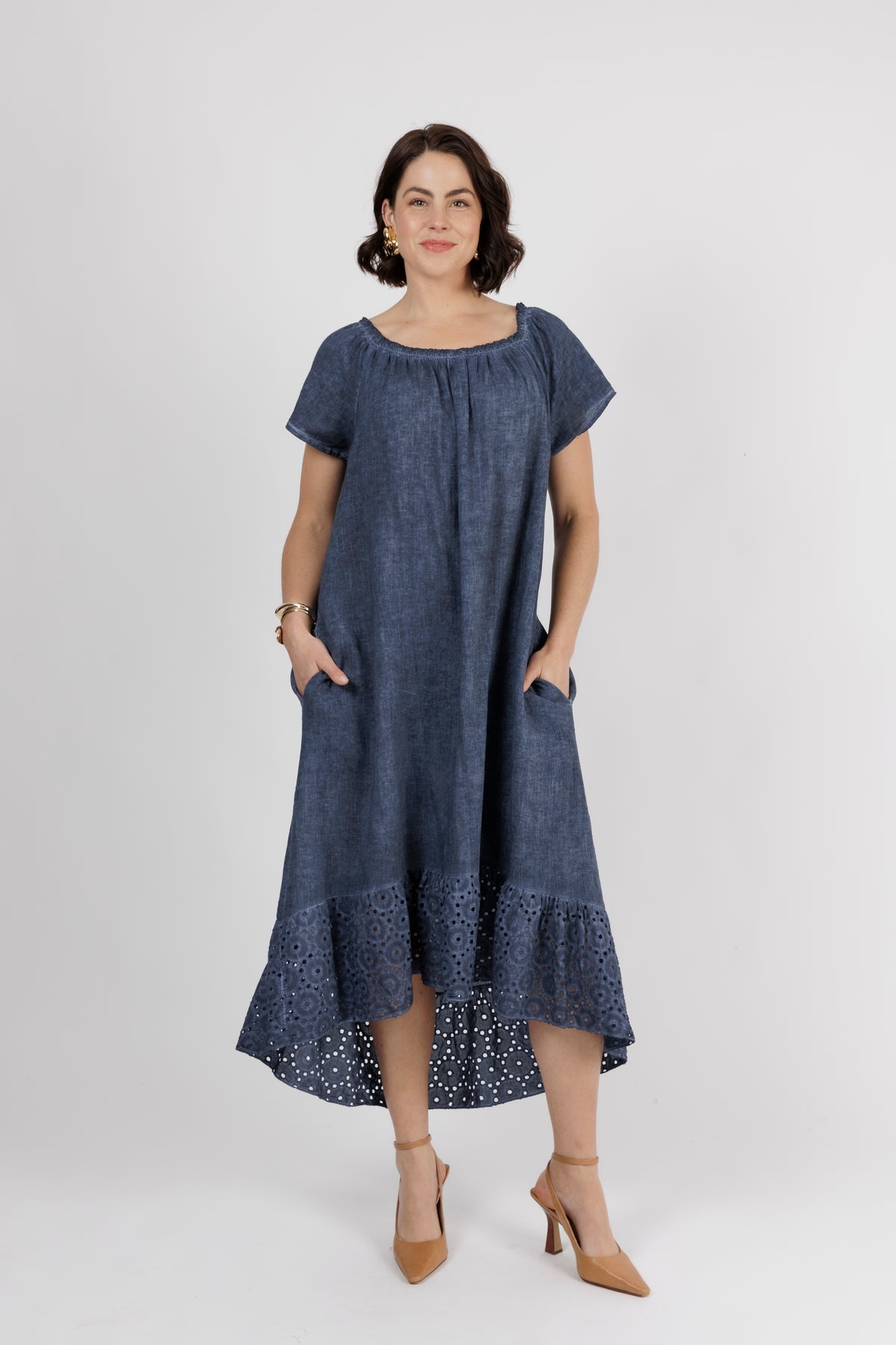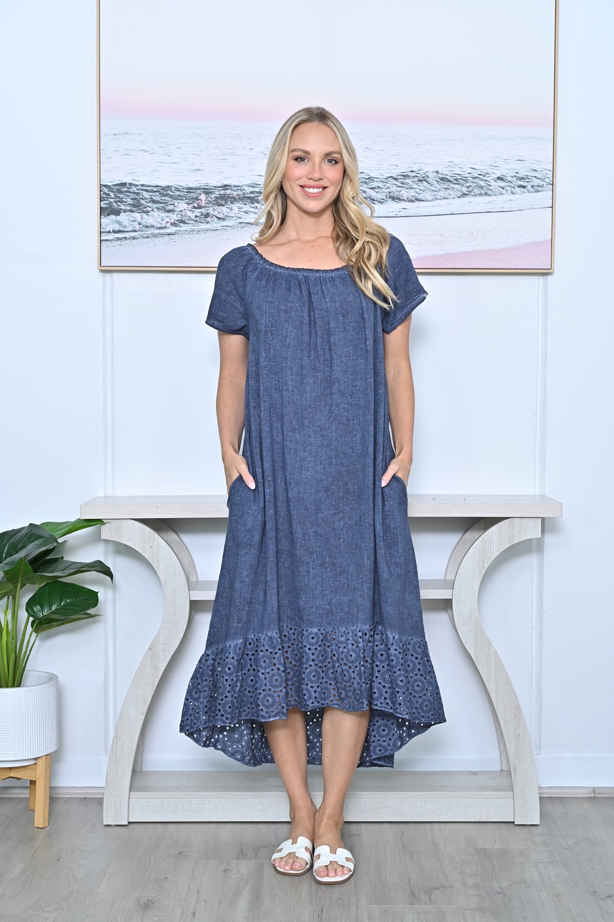 HAILEE Navy A Line Crochet Hem Linen Dress