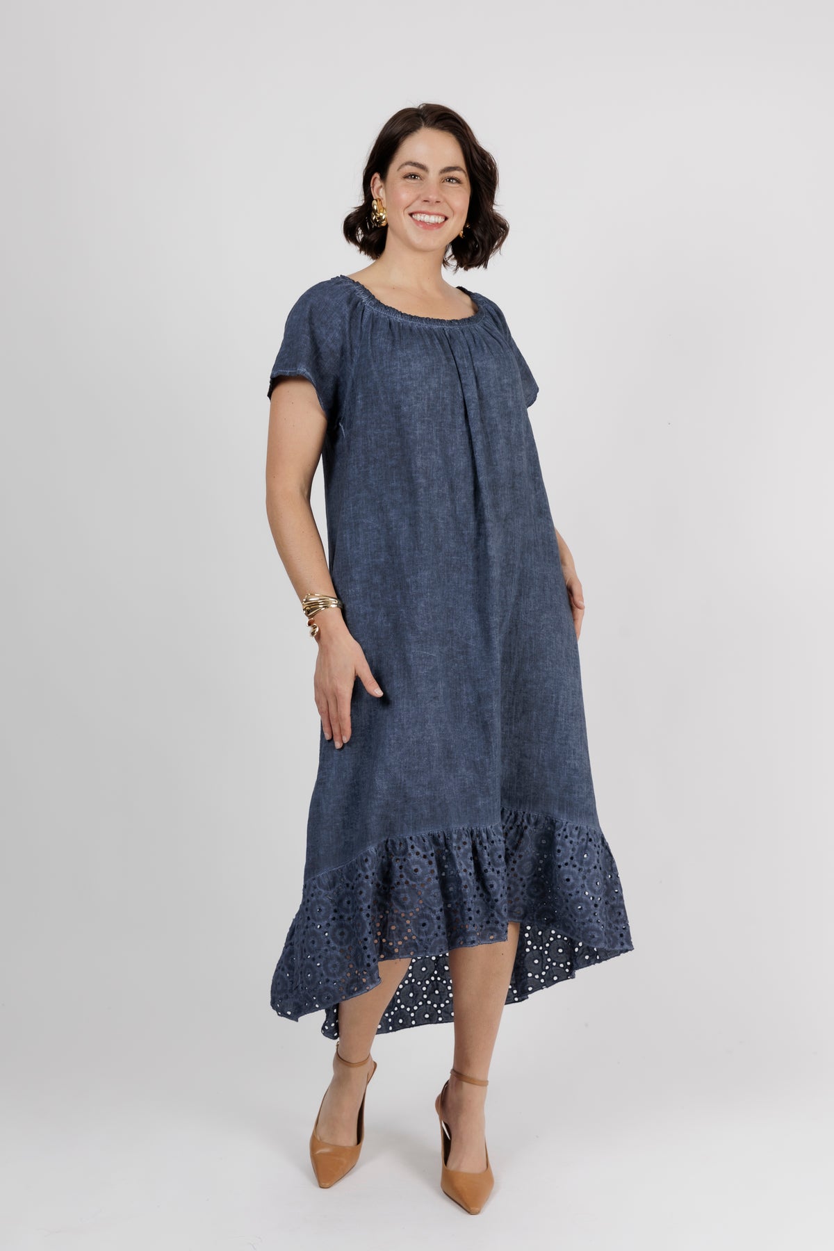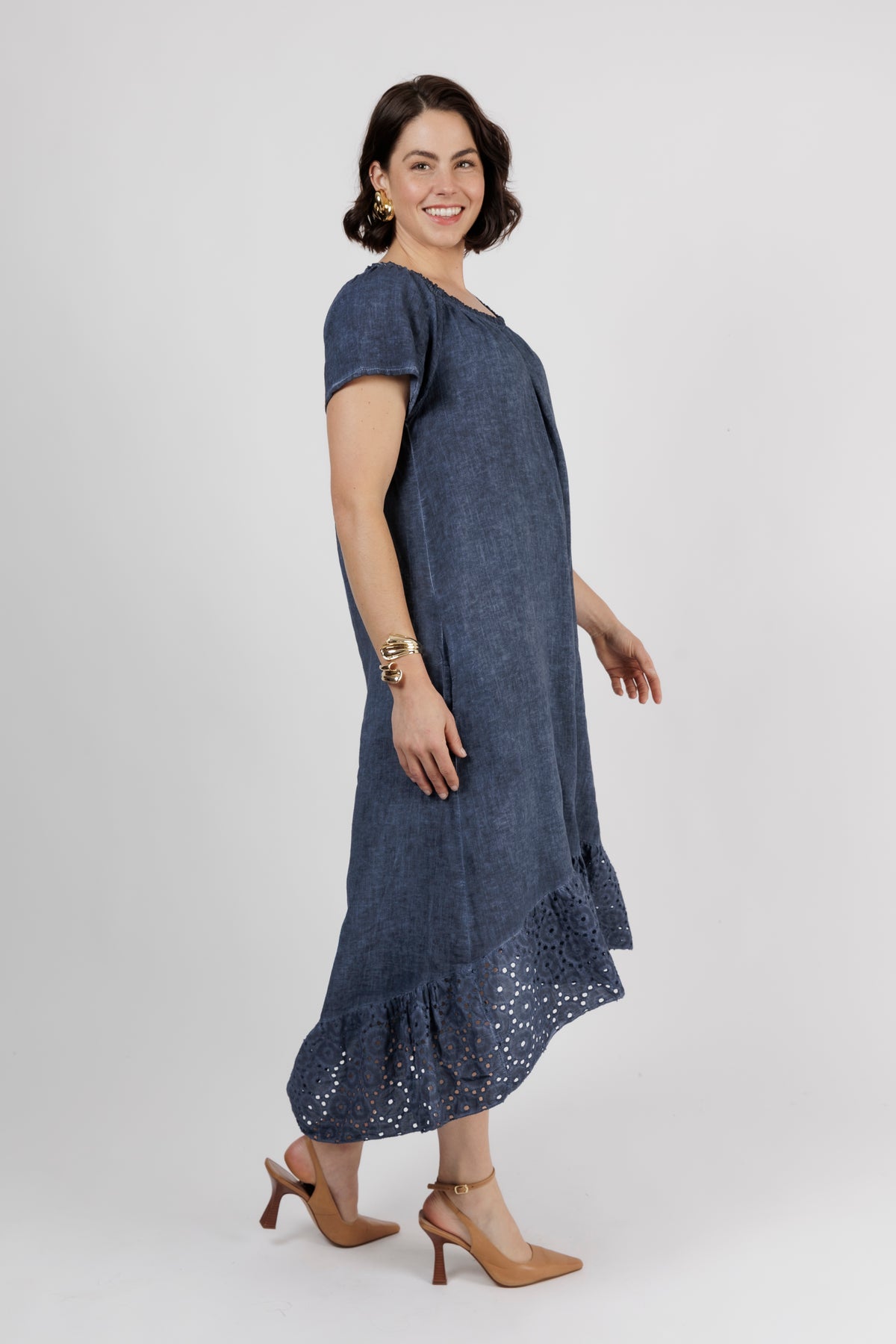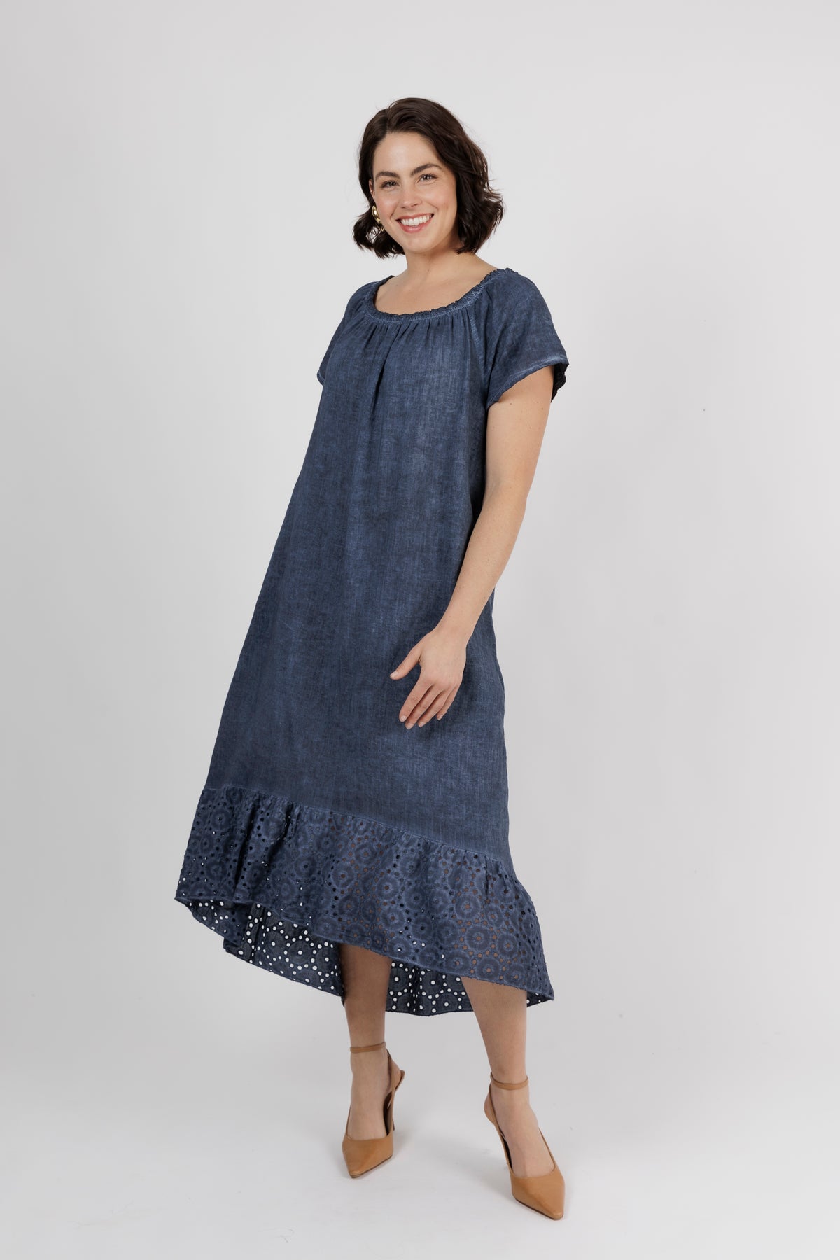 HAILEE Navy A Line Crochet Hem Linen Dress