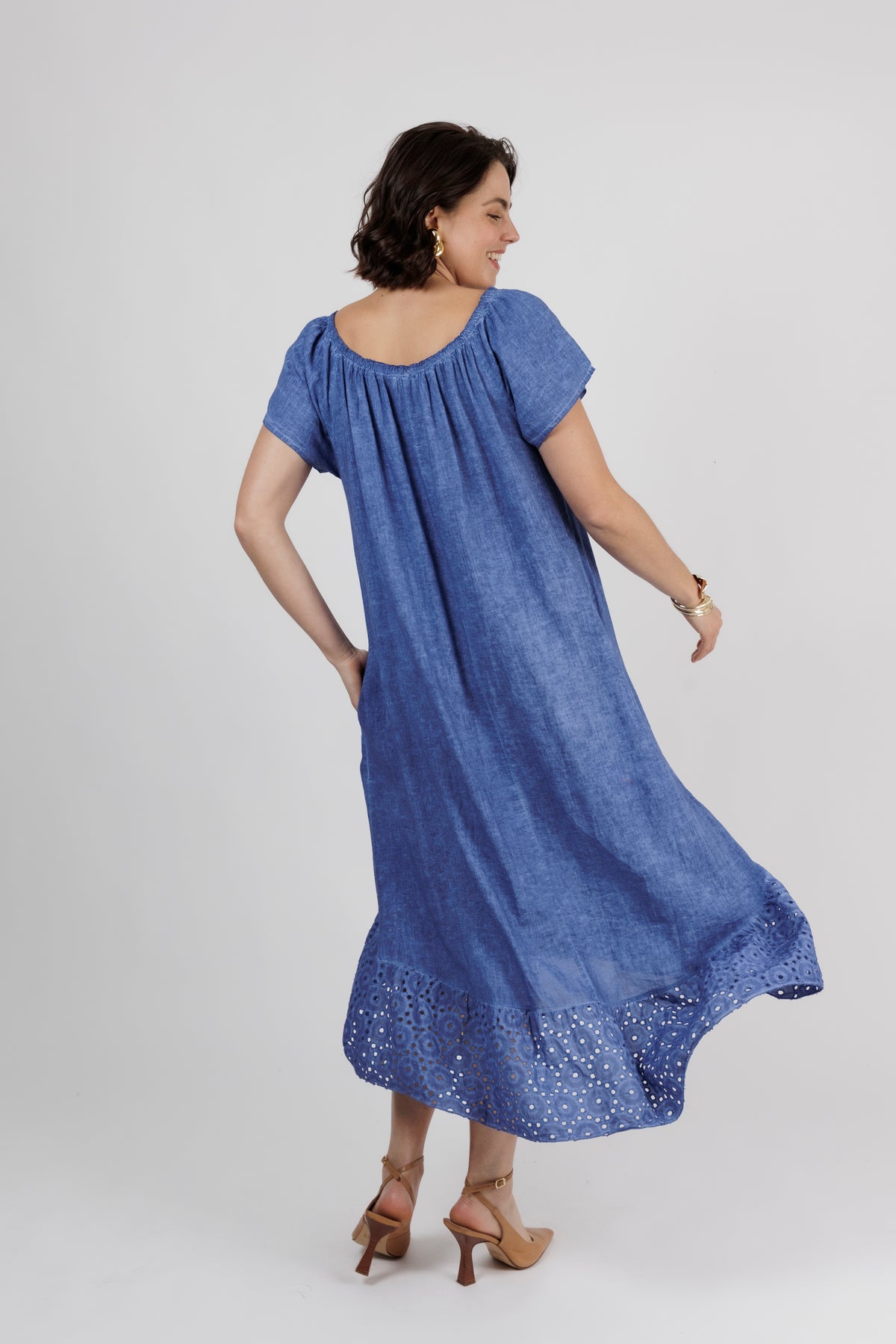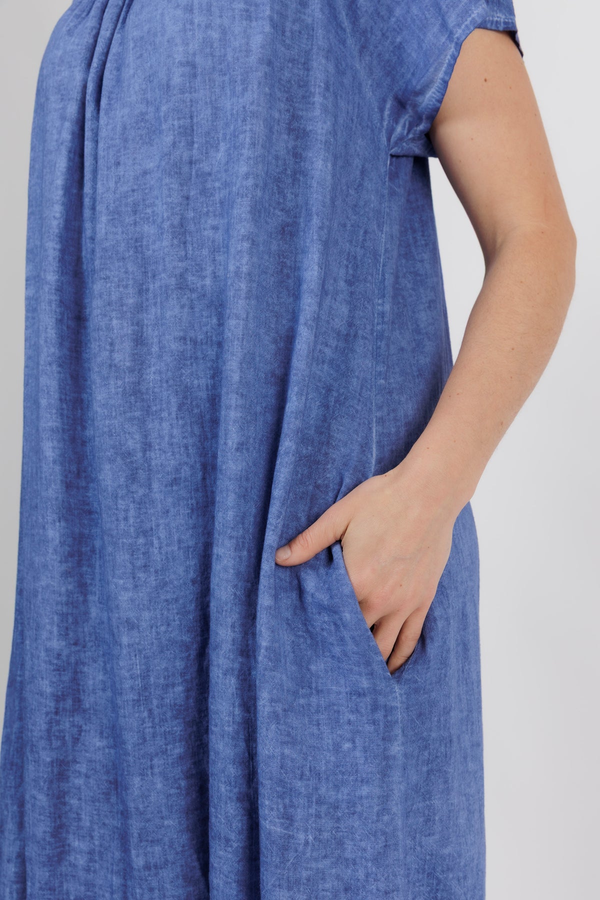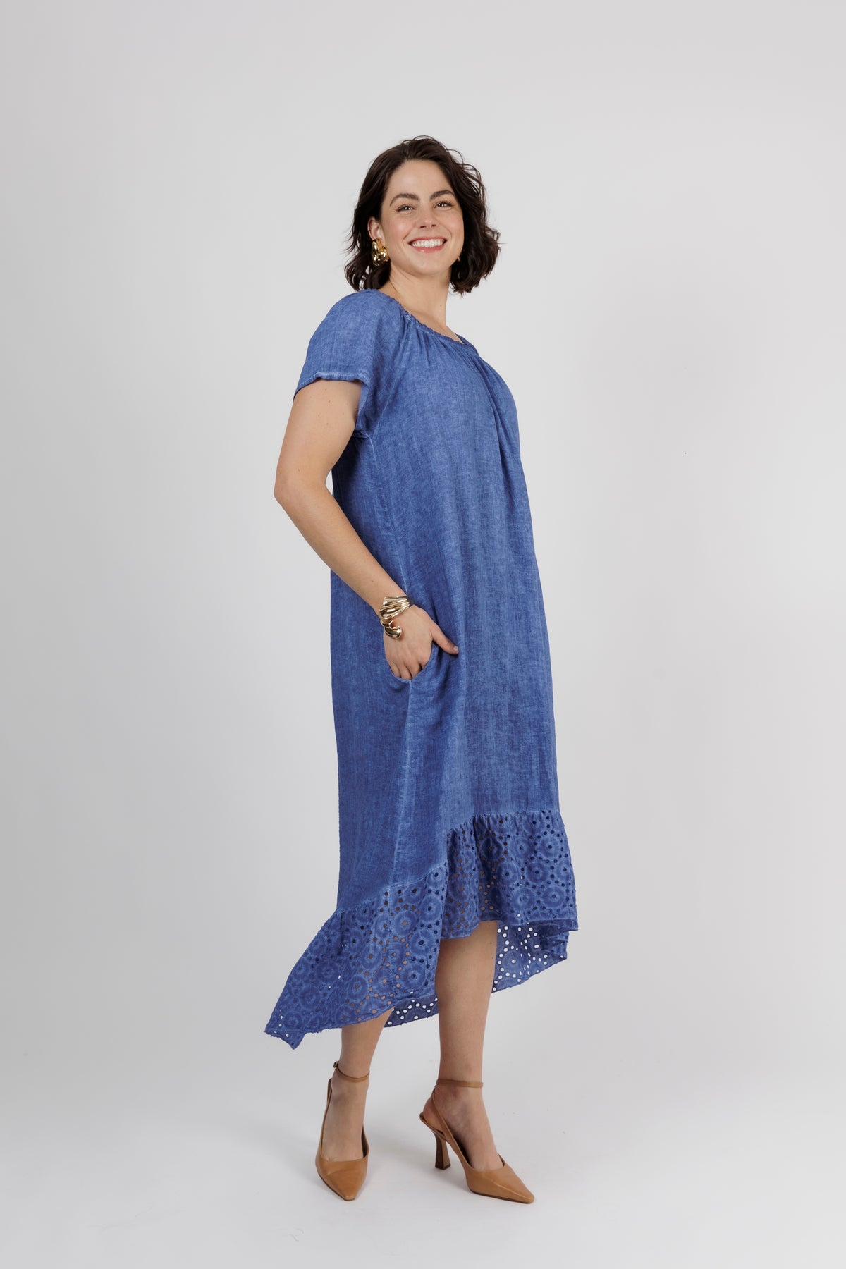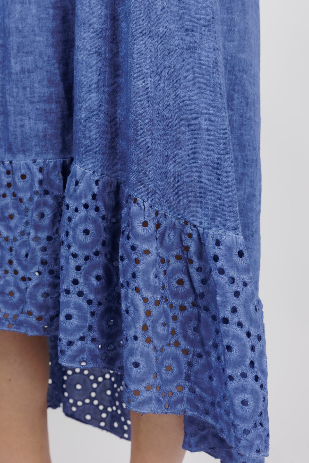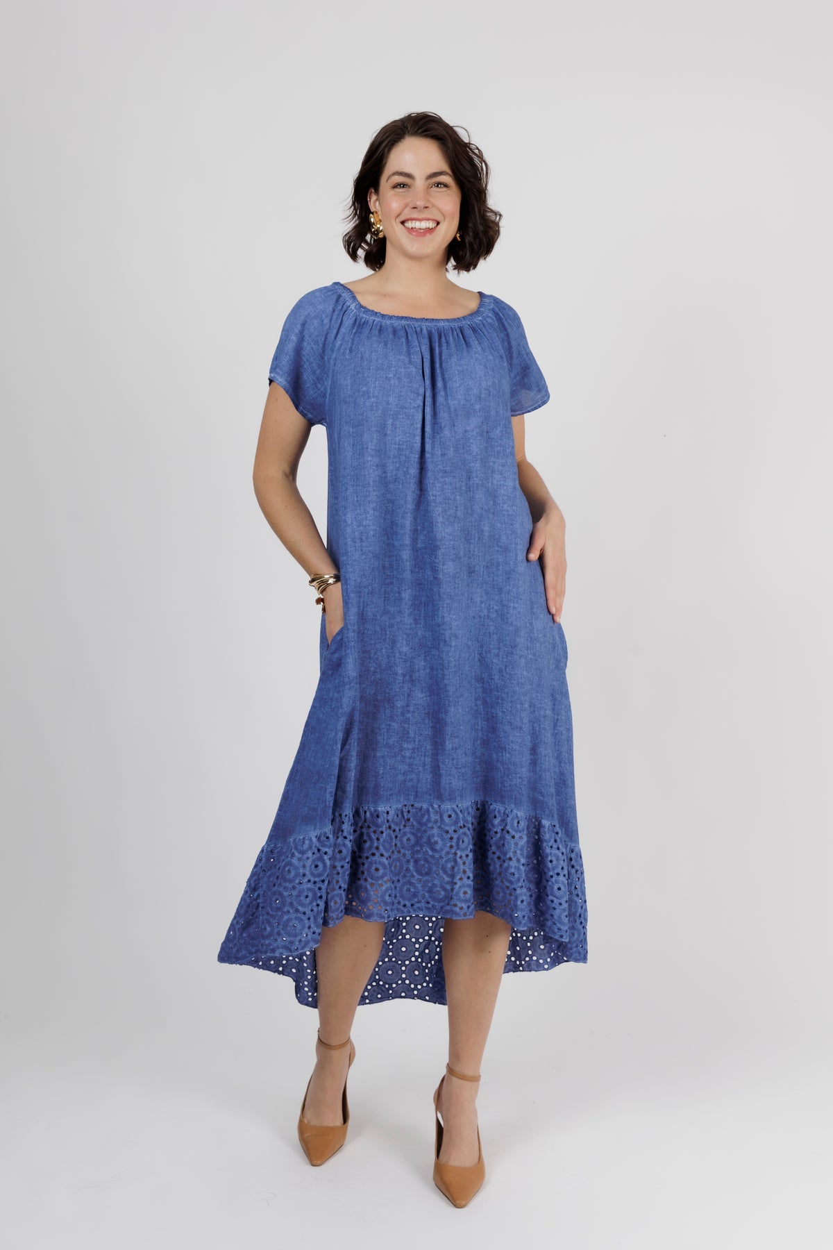 HAILEE Cobalt A Line Crochet Hem Linen Dress