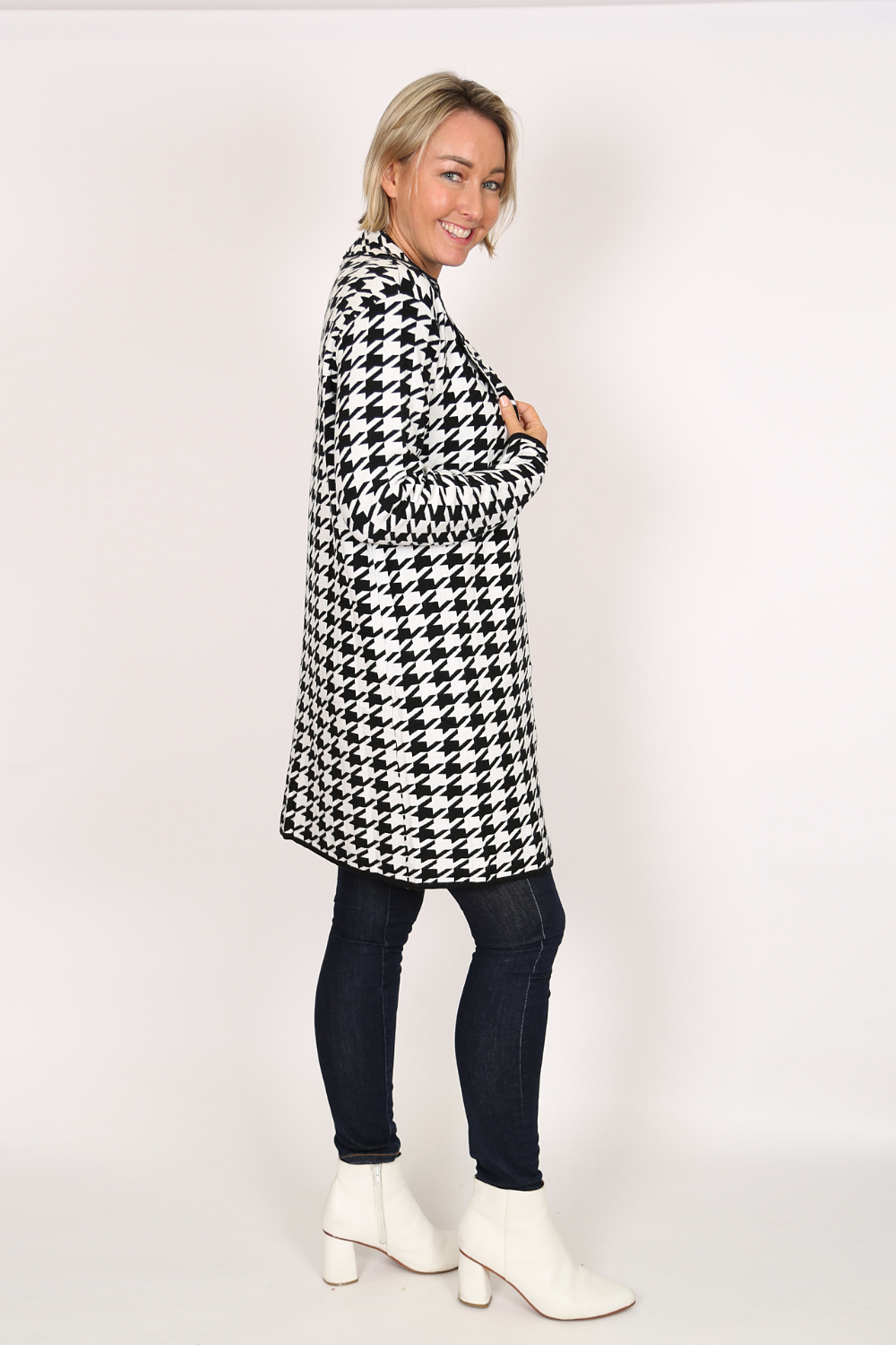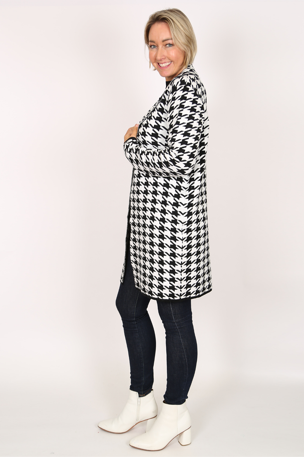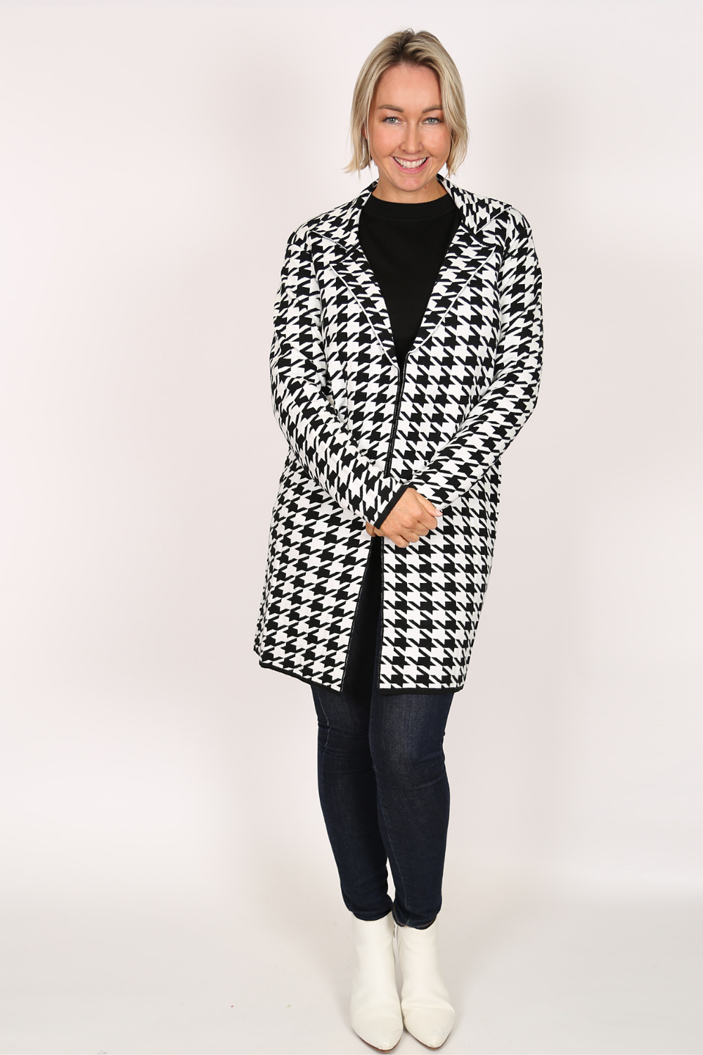 The edge-to-edge knit jacket is a stylish and comfortable piece that adds a touch of sophistication to any outfit. Made from a soft knit fabric, this jacket features a classic black and white houndstooth pattern that never goes out of style.