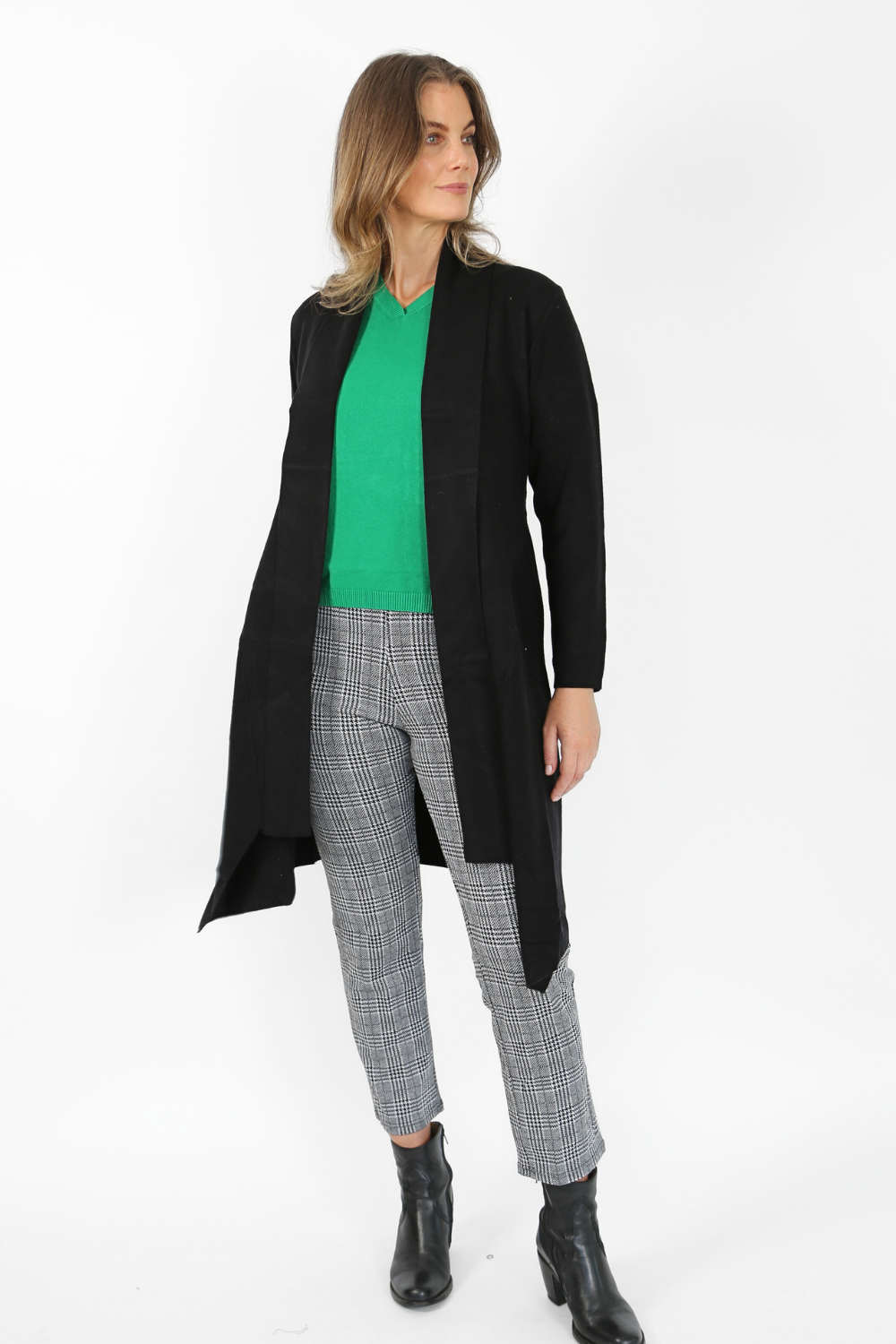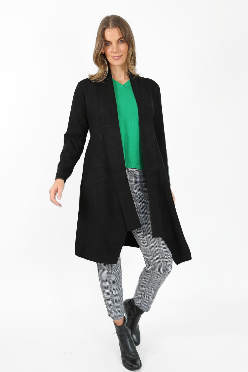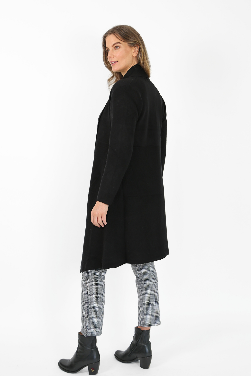 The edge-to-edge knit jacket is a stylish and comfortable piece that adds a touch of sophistication to any outfit. Made from a soft knit fabric, this jacket features a classic black and white houndstooth pattern that never goes out of style.
