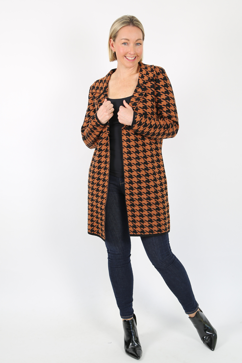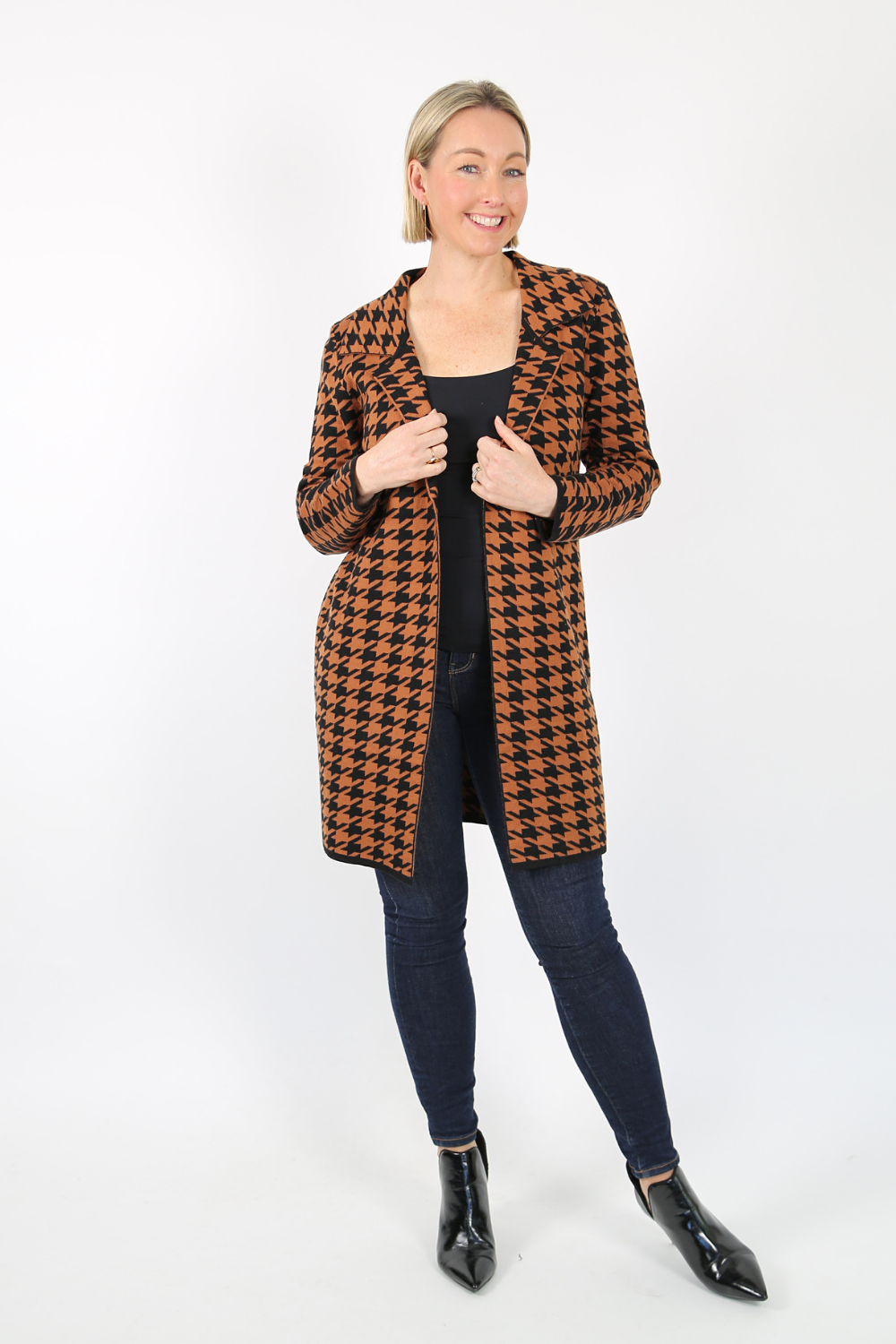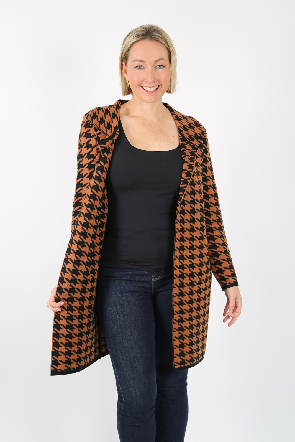 The edge-to-edge knit jacket is a stylish and comfortable piece that adds a touch of sophistication to any outfit. Made from a soft knit fabric, this jacket features a classic black and camel houndstooth pattern that never goes out of style.