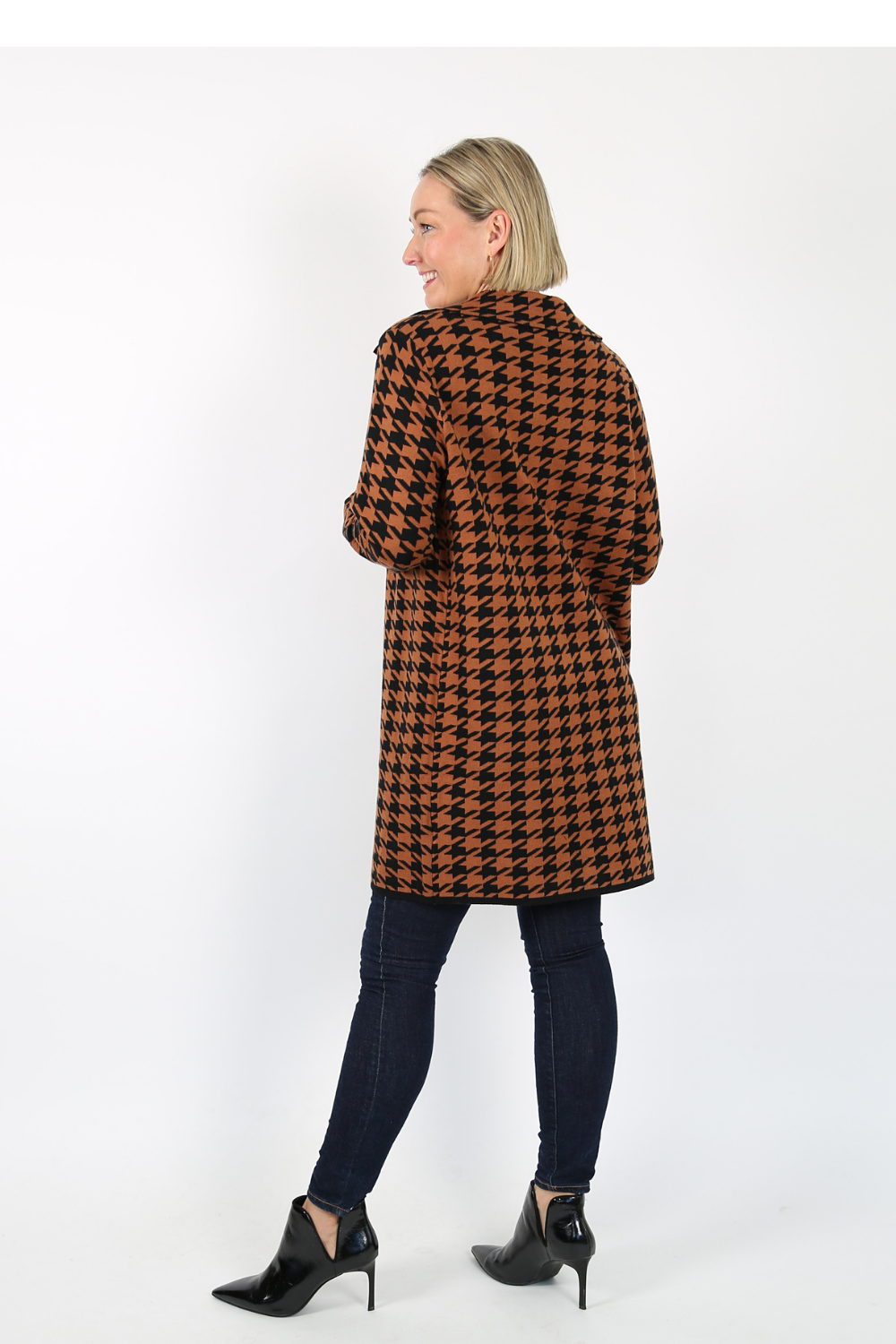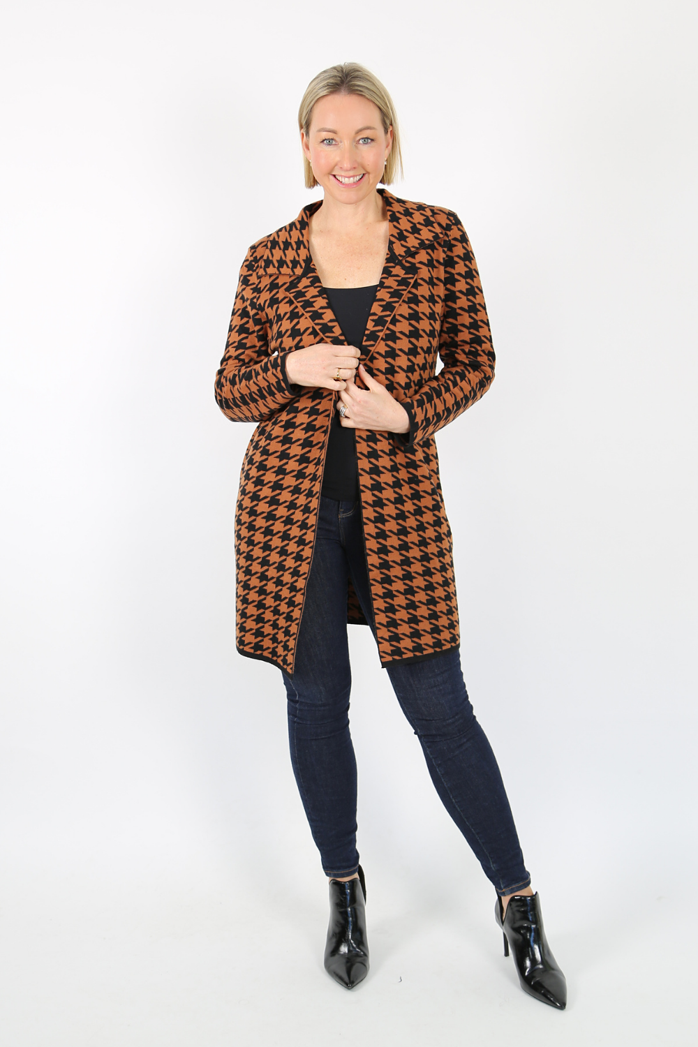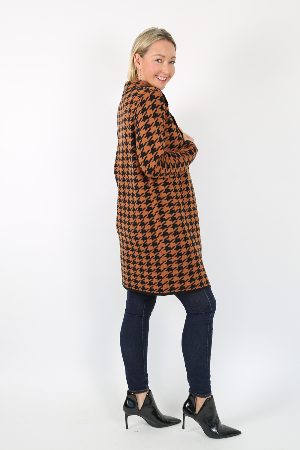 The edge-to-edge knit jacket is a stylish and comfortable piece that adds a touch of sophistication to any outfit. Made from a soft knit fabric, this jacket features a classic black and camel houndstooth pattern that never goes out of style.