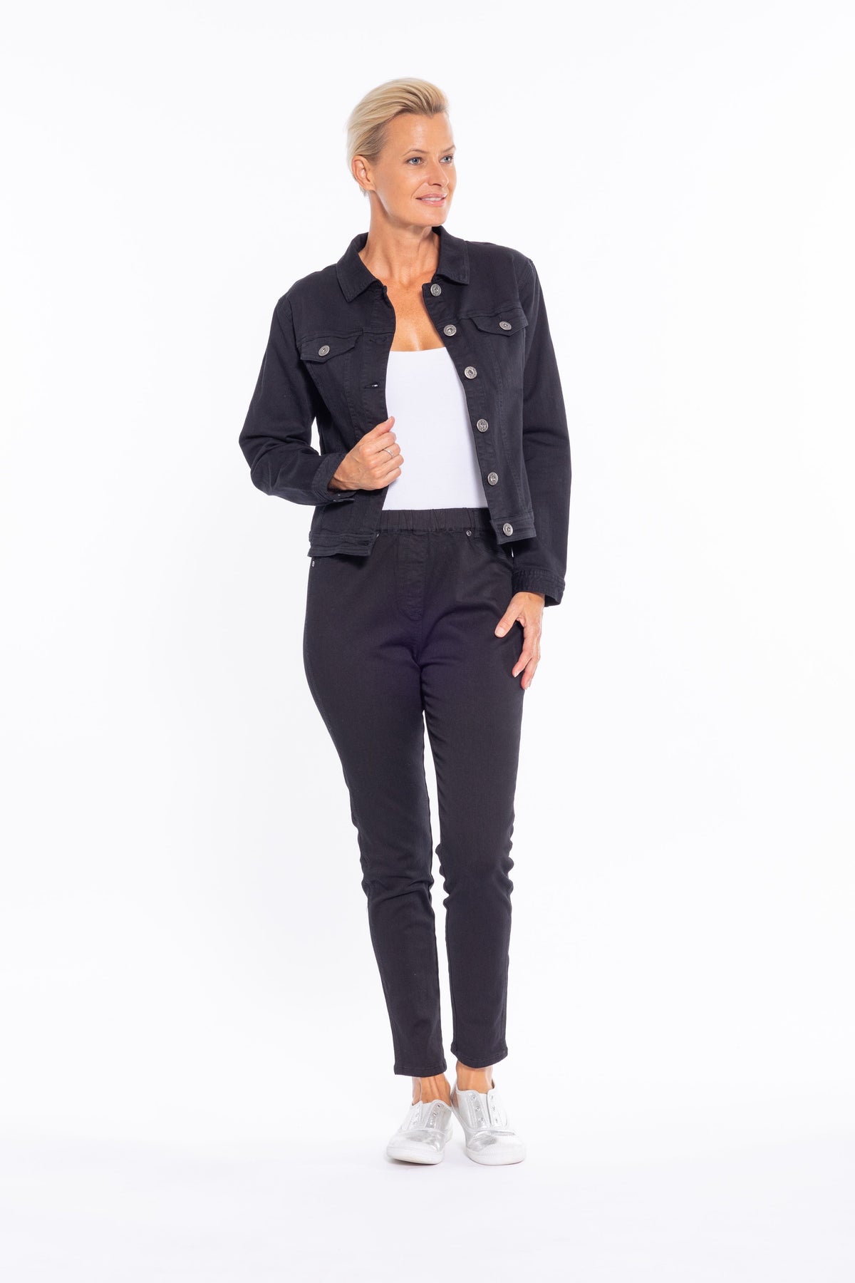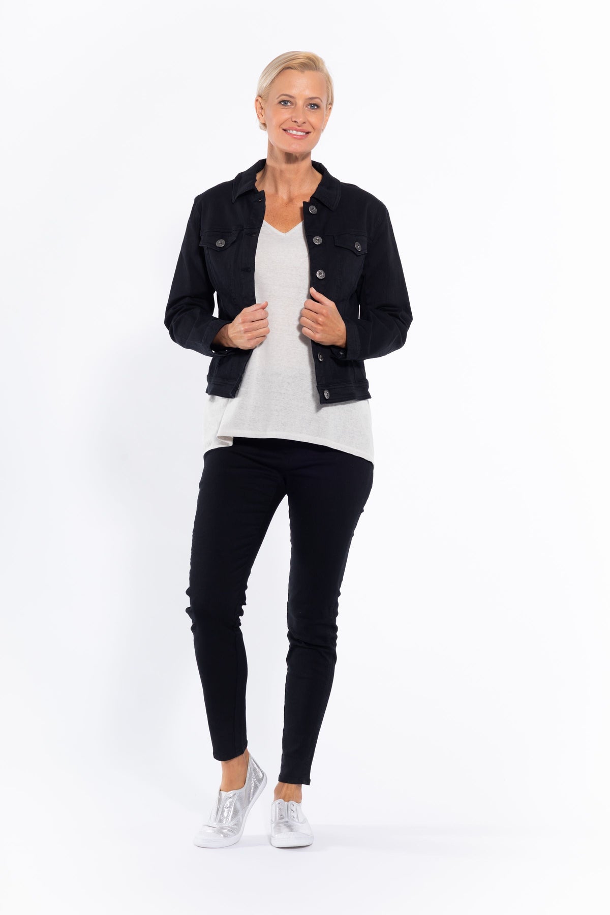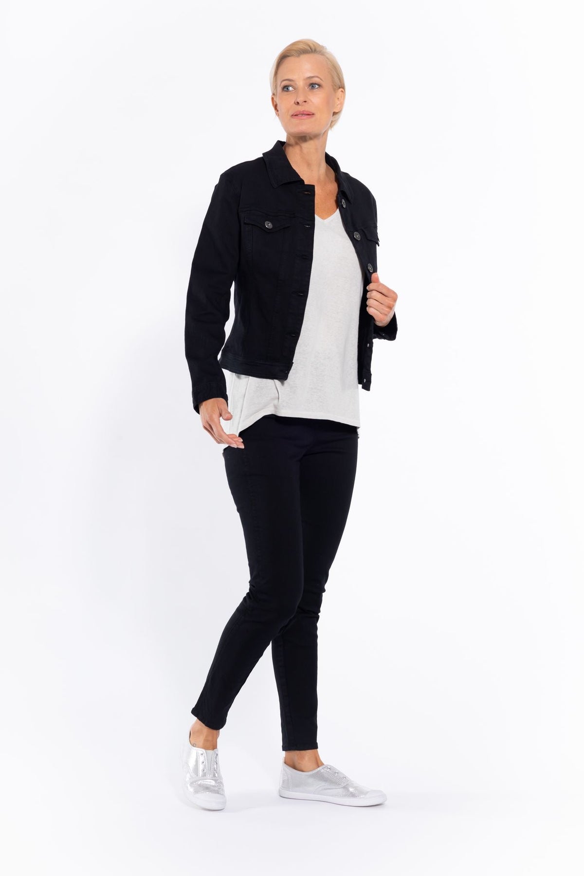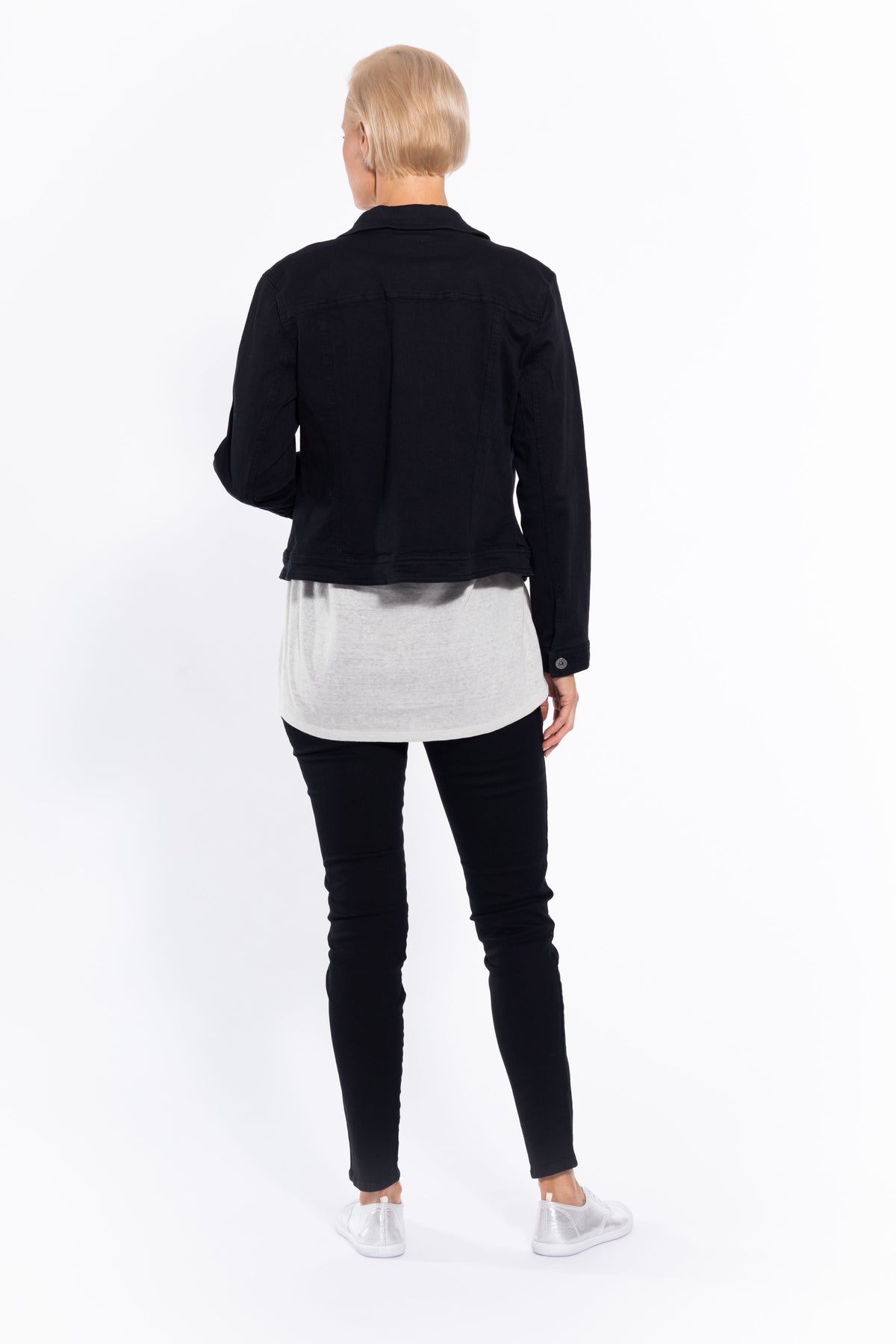 Style tip: throw this classic black denim-look jacket over a printed dress for a modern and comfortable casual look.