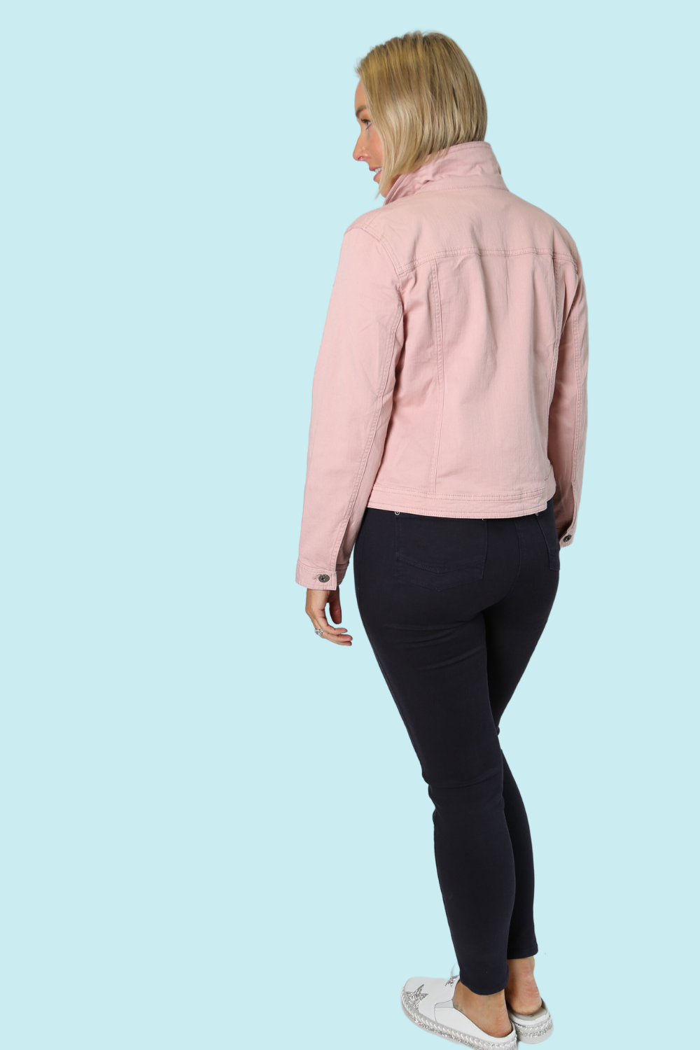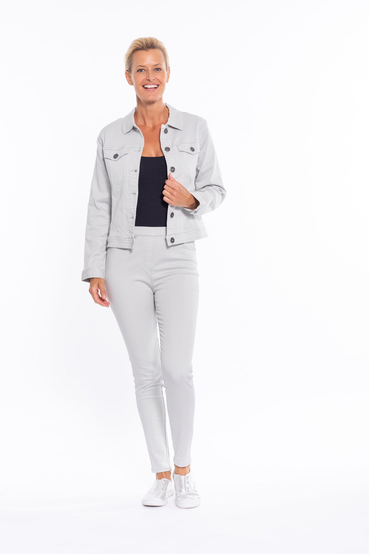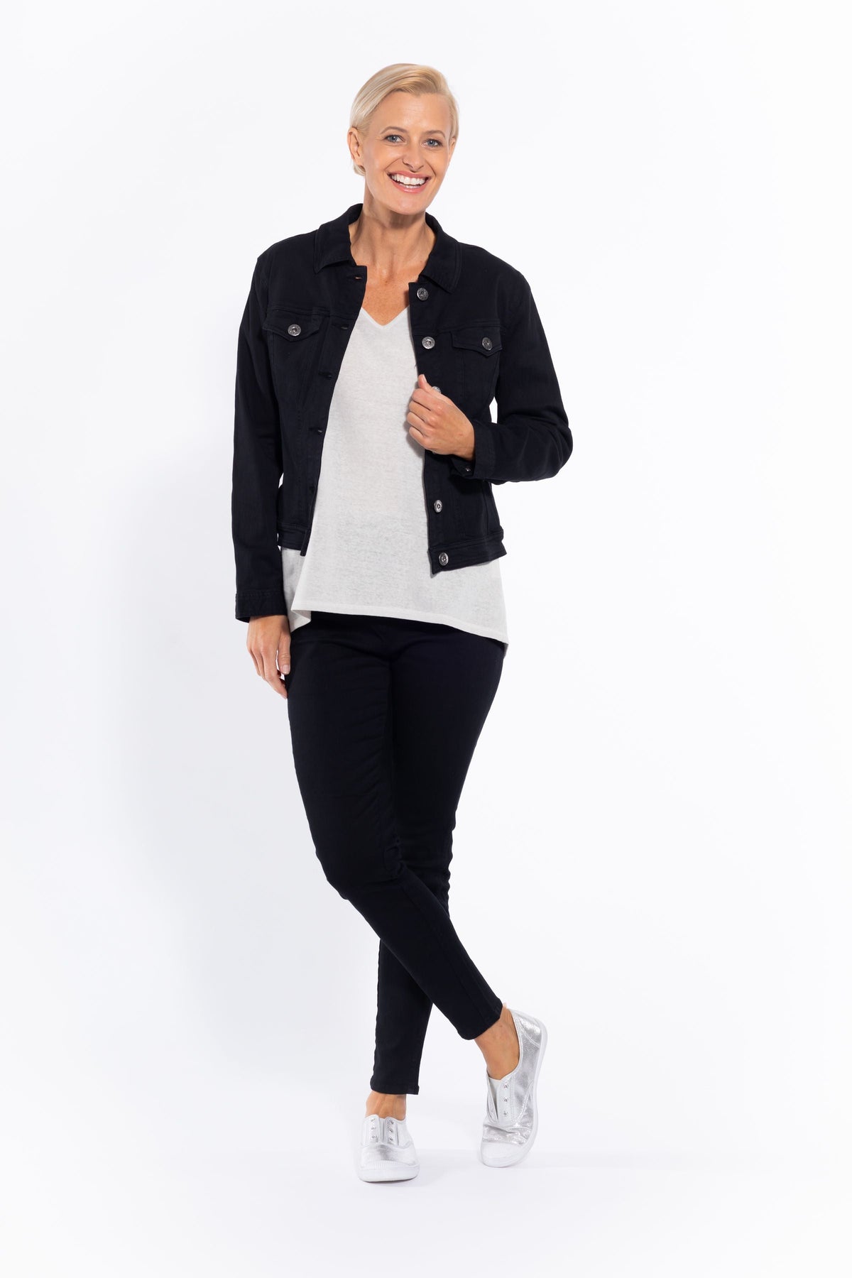 Style tip: throw this classic black denim-look jacket over a printed dress for a modern and comfortable casual look.