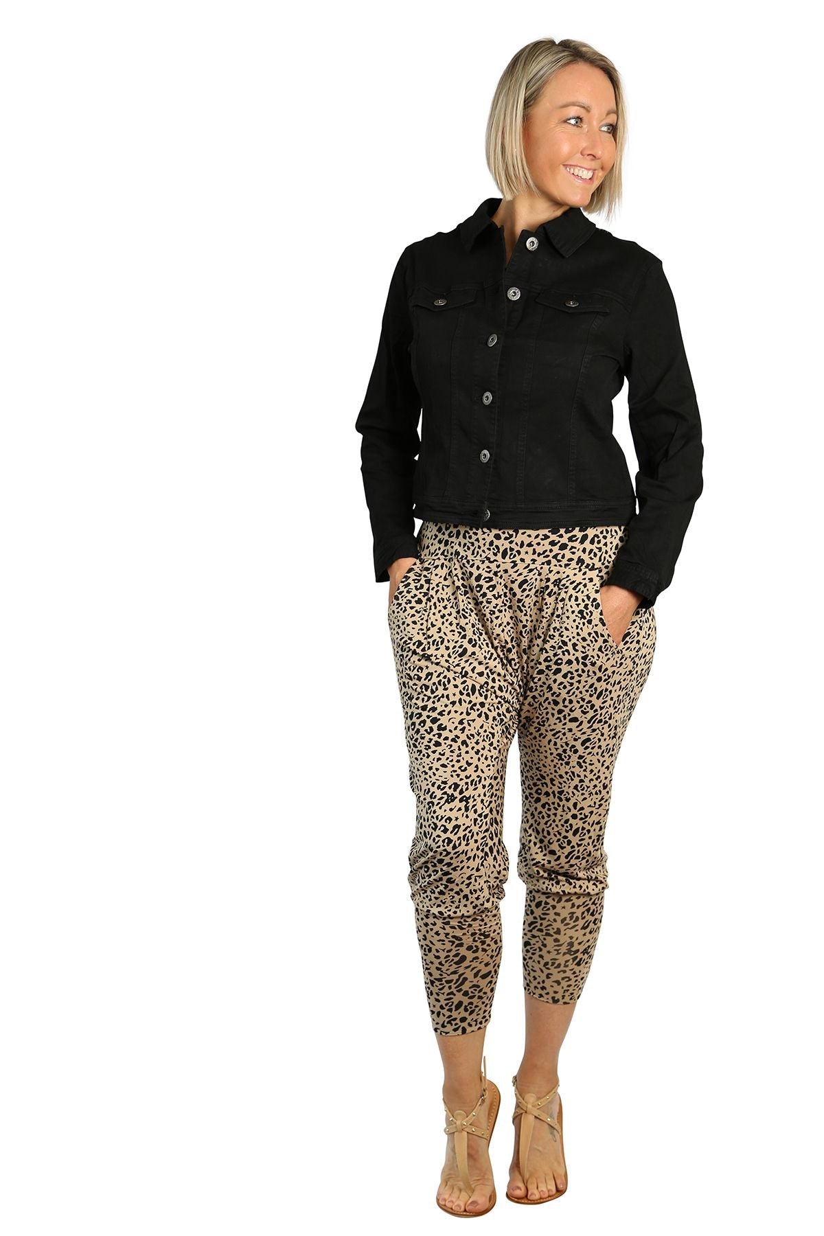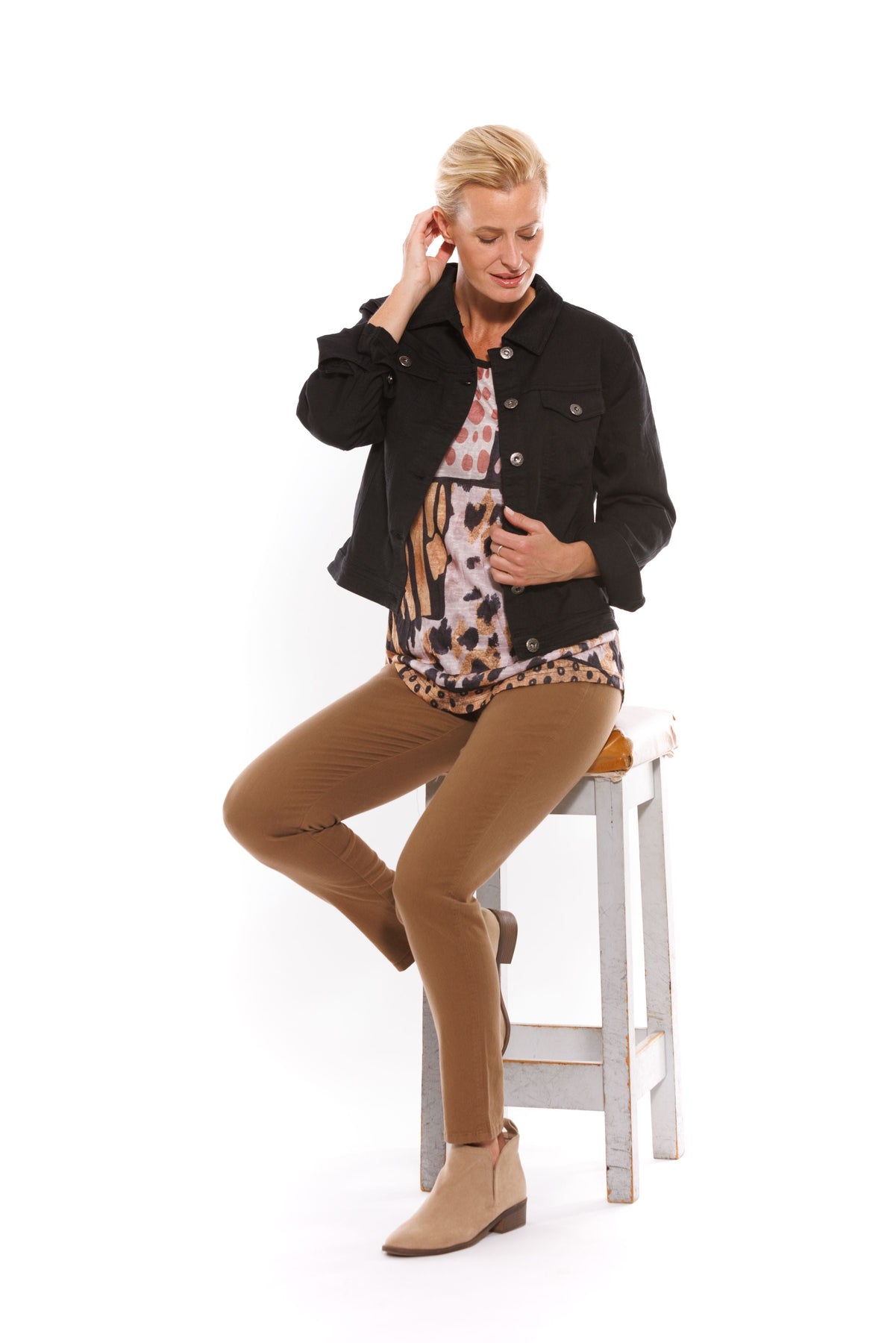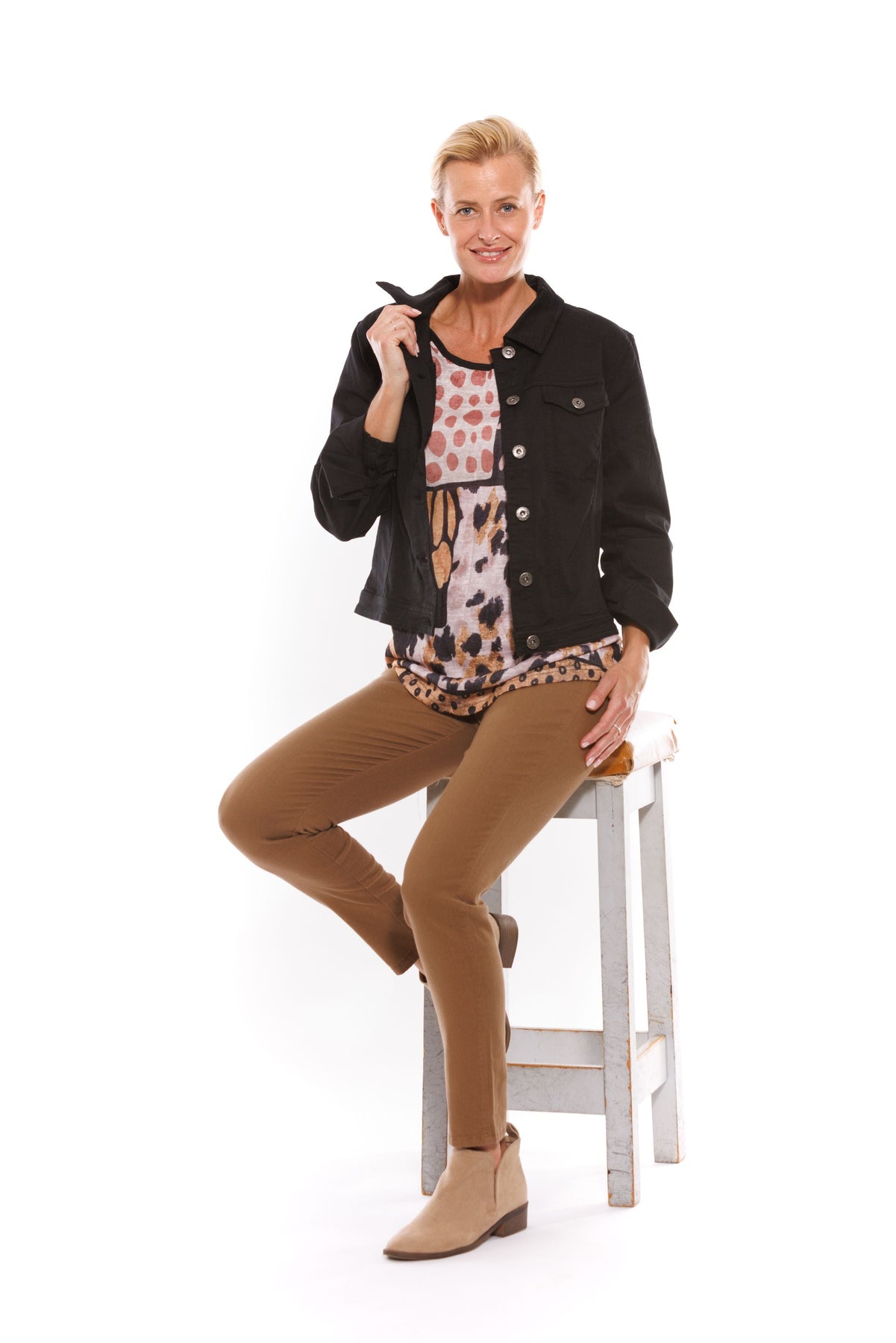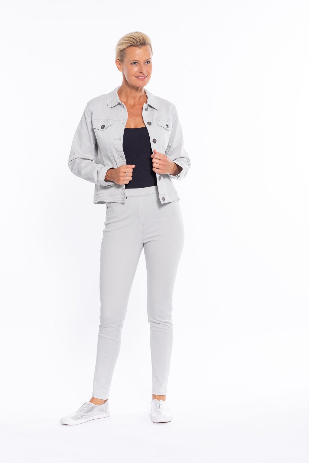 Style tip: throw this classic black denim-look jacket over a printed dress for a modern and comfortable casual look.