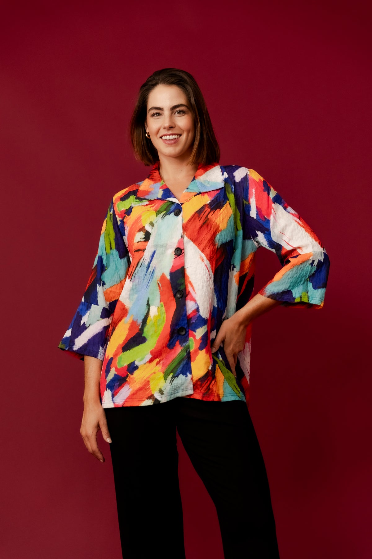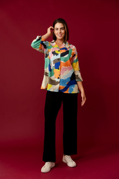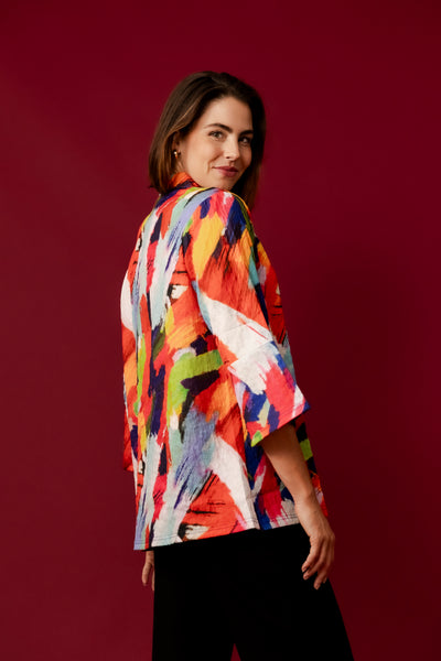 Introducing the Margery Jacket in a vibrant print, a must-have for those who love to make a statement with their wardrobe. This light weight jacket features an explosion of bold colours, including bright greens, blues, reds, and yellows, arranged in an abstract, artistic pattern. The unique textured fabric presents subtle embossed flowers, adding an extra dimension to the design, making it both visually appealing and comfortable to wear.
