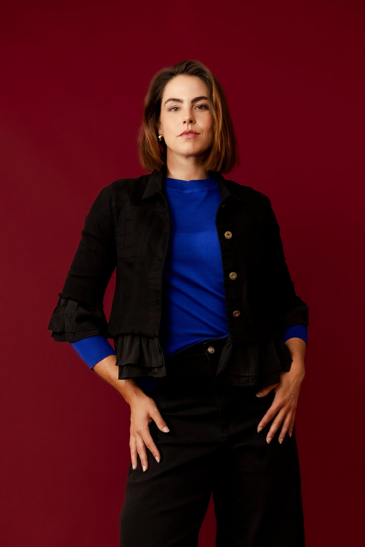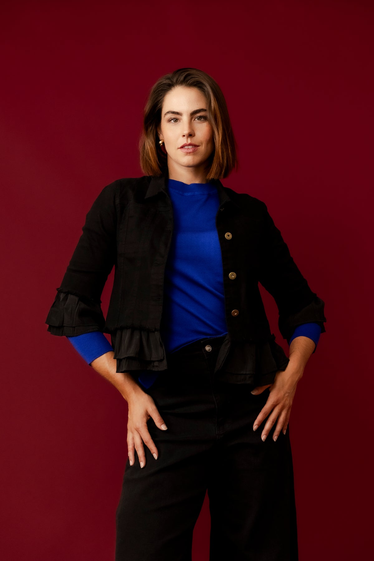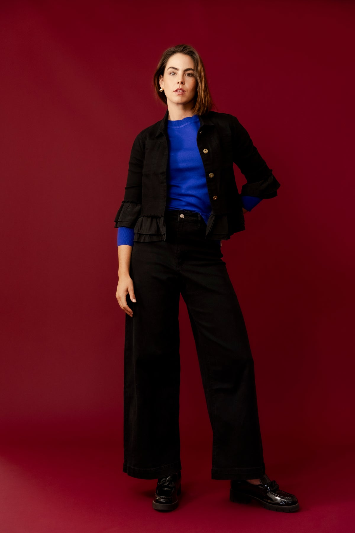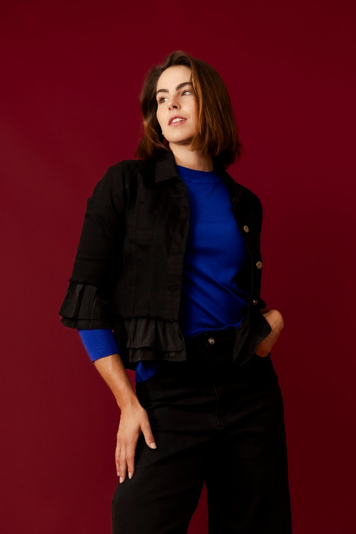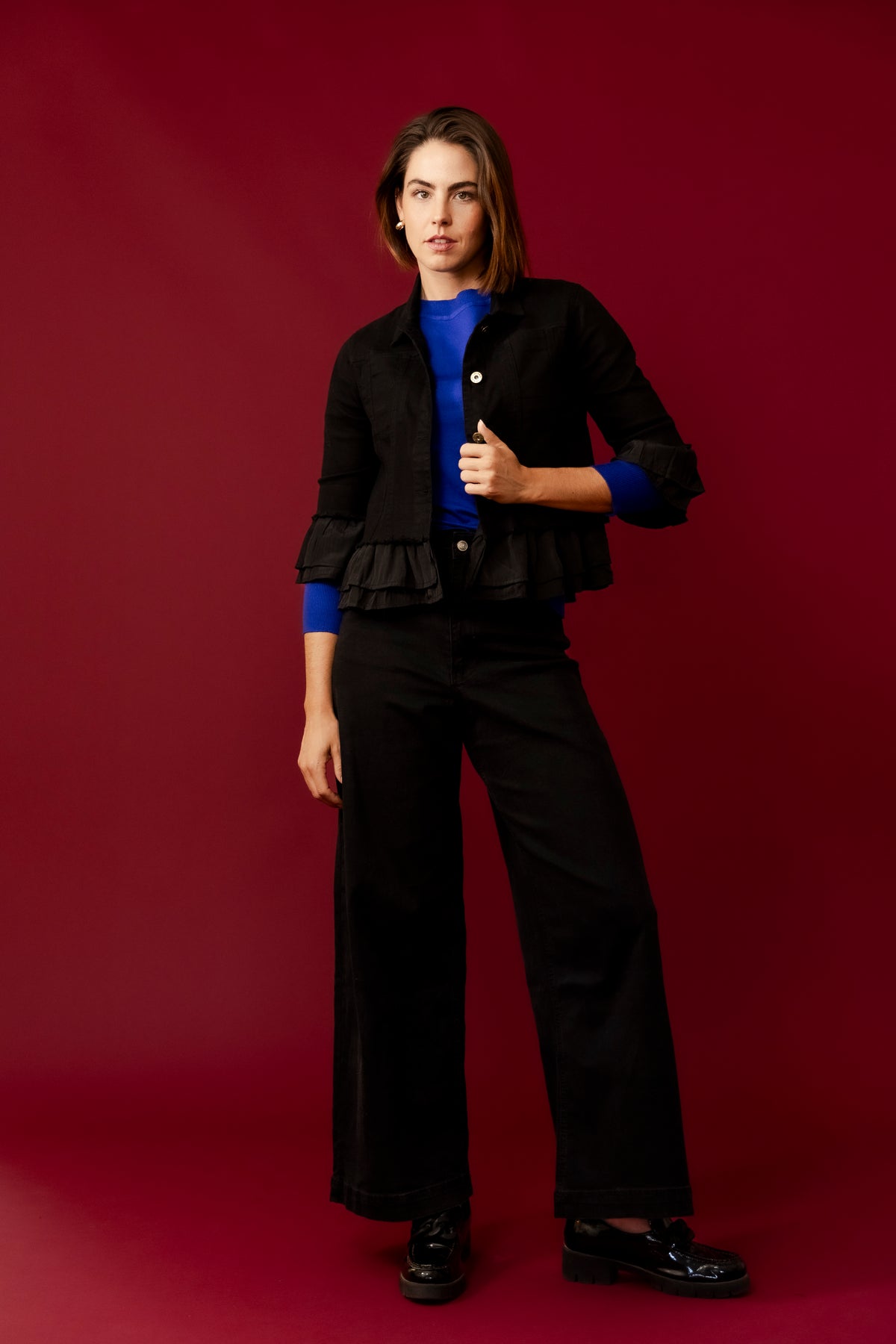 The Leela Cropped Ruffle Denim Jacket is versatile and stylish, perfect for adding a chic layer to both casual and dressy ensembles. Pair it with high-waisted jeans or a flowy skirt for a fashionable and effortless look.
