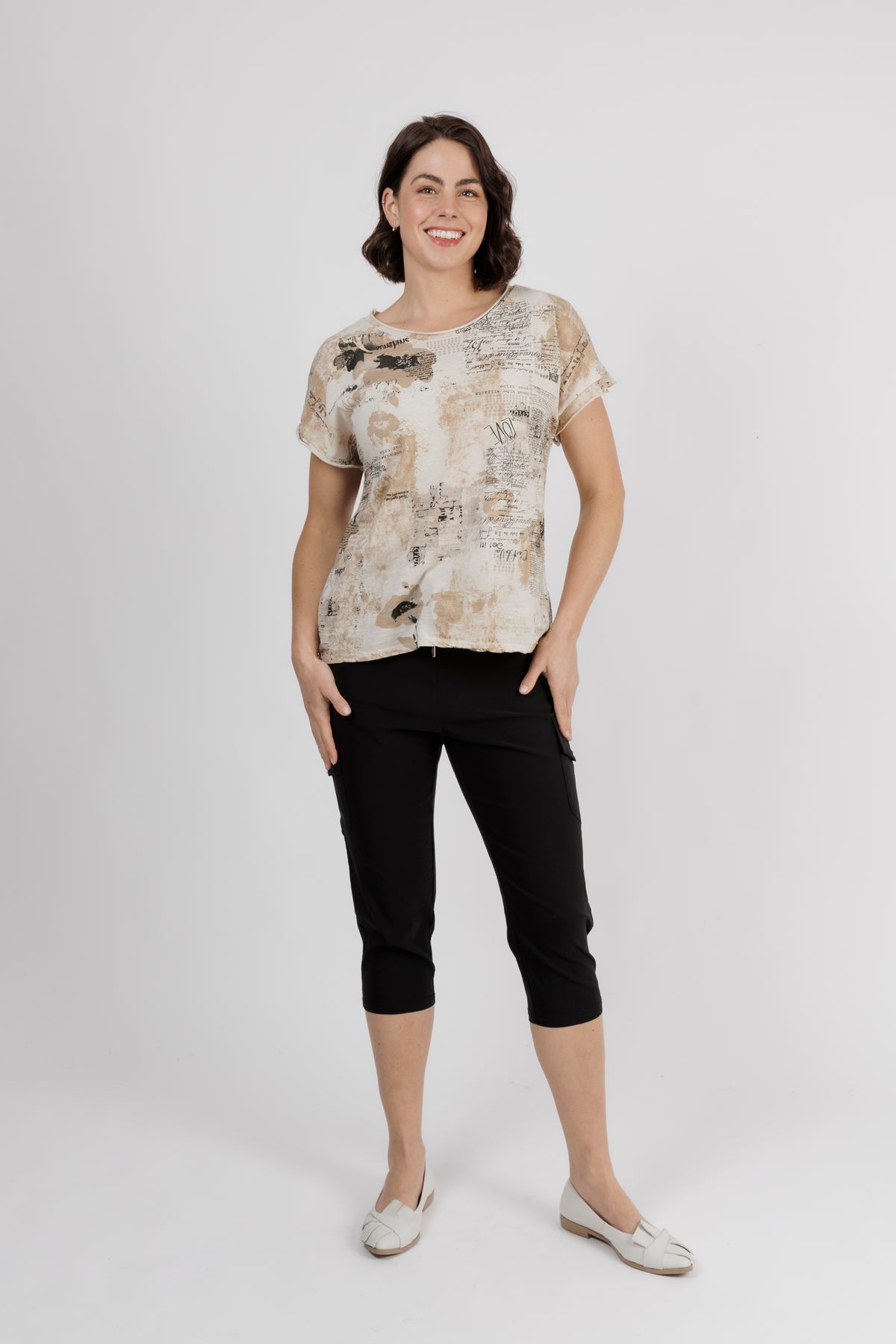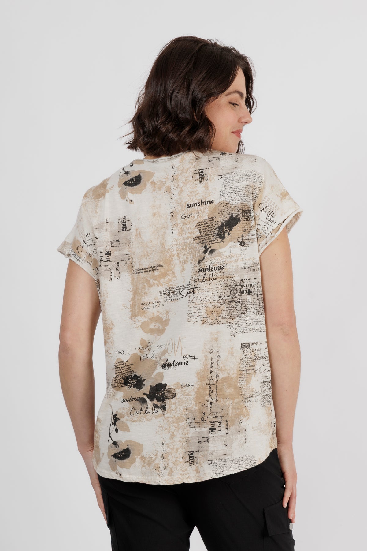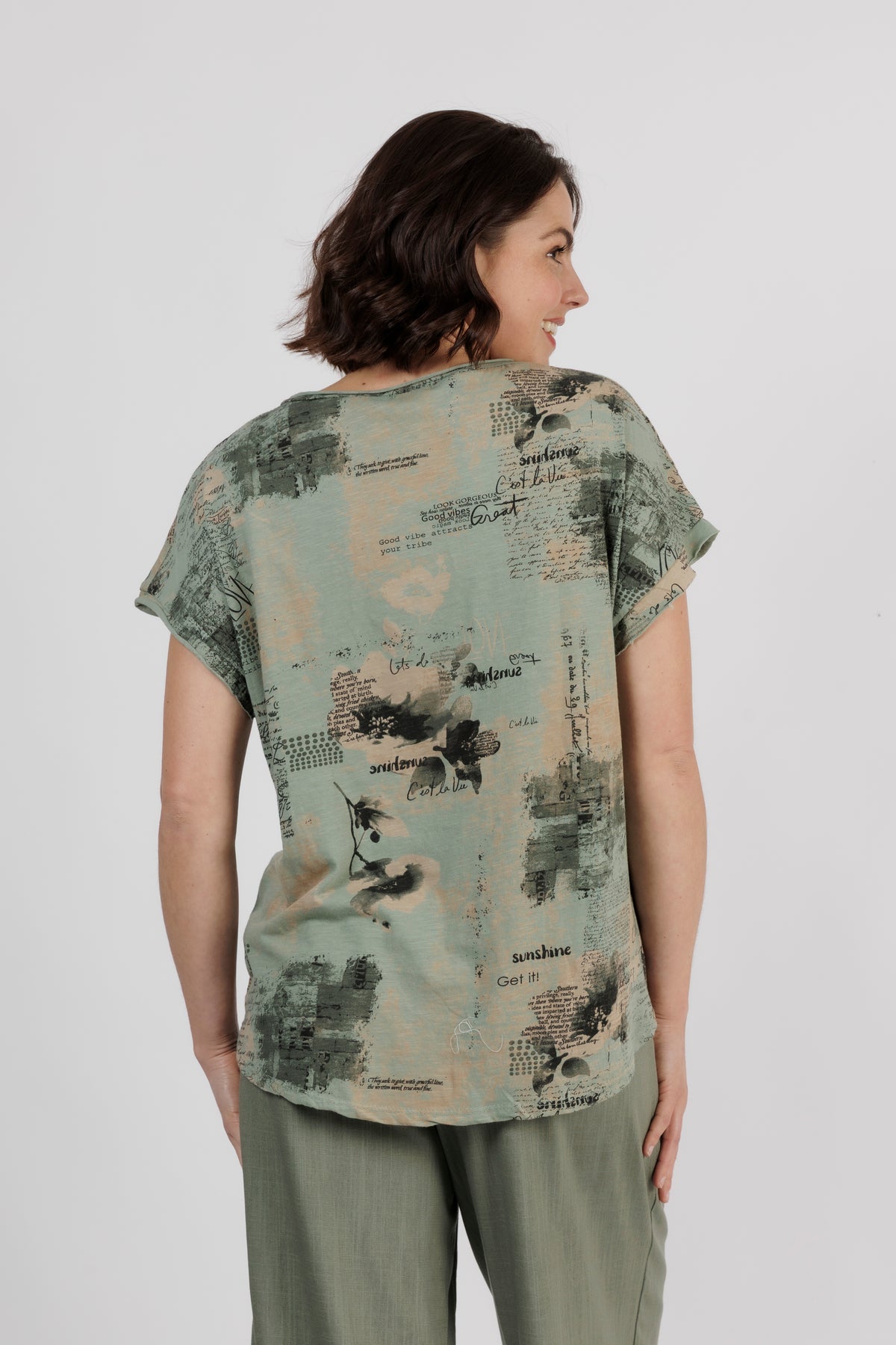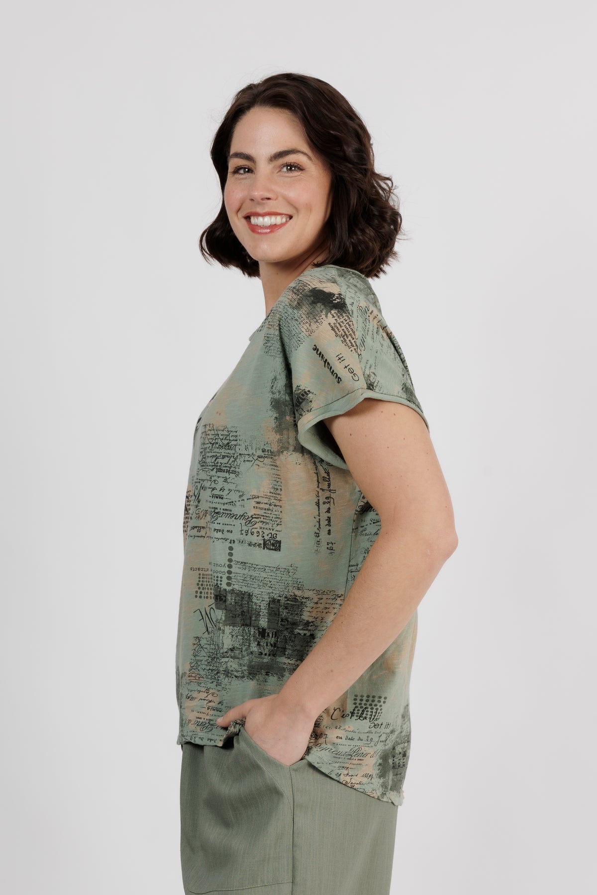 - Rounded neckline and t-shirt style sleeves framed by a khaki hem