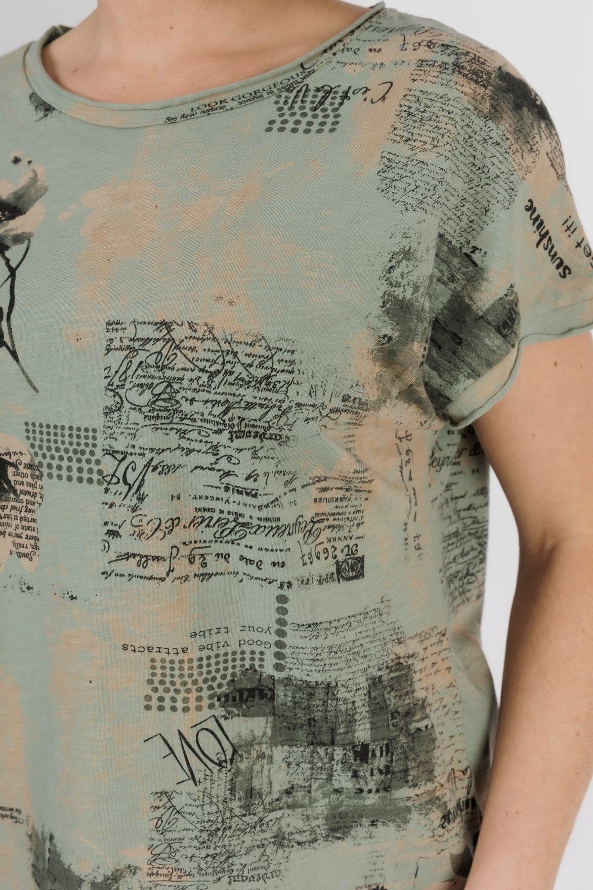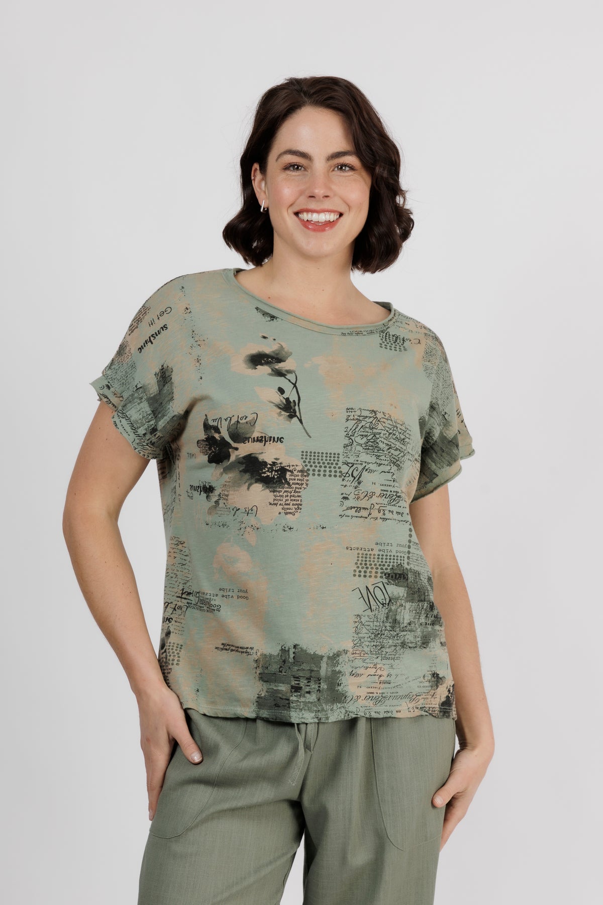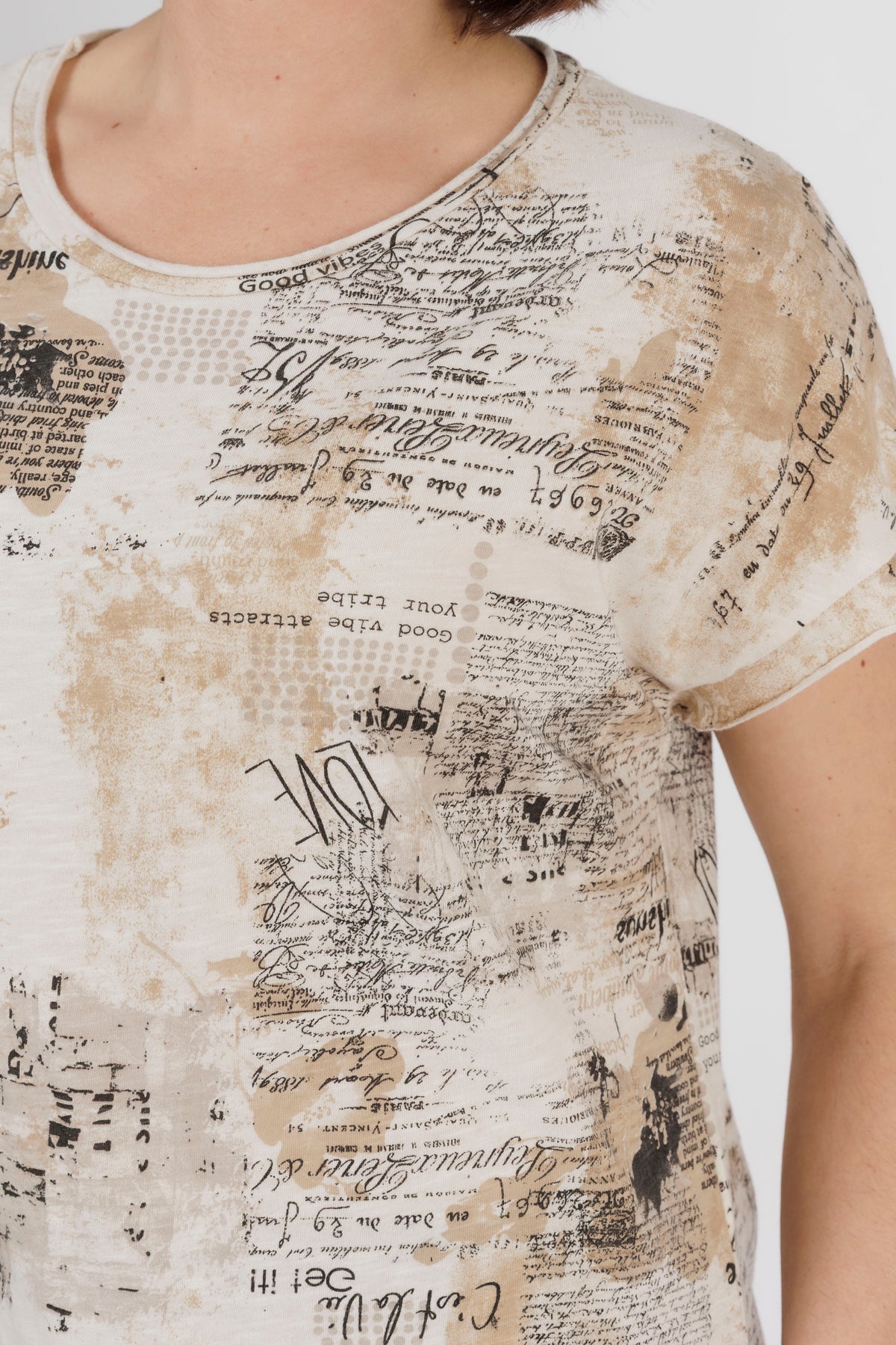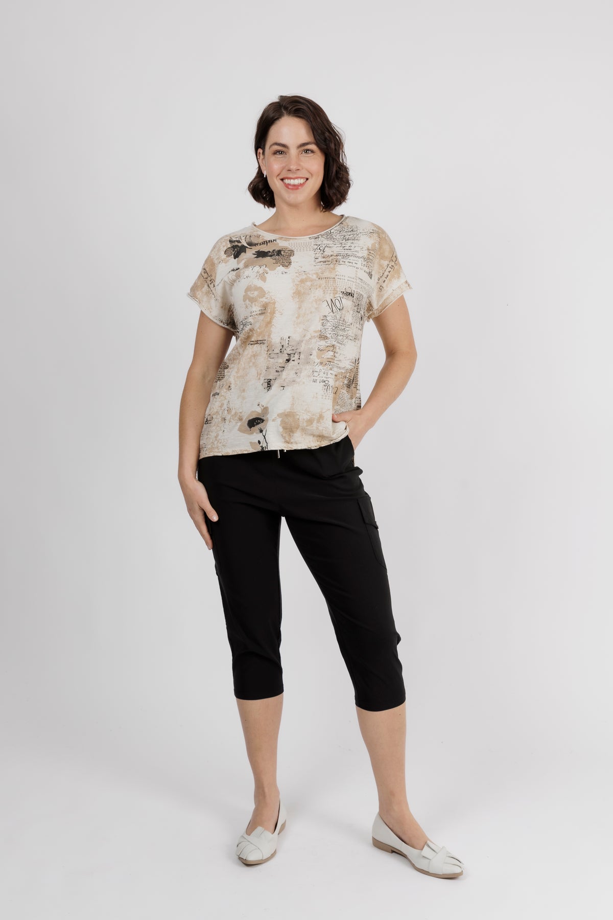 - Rounded neckline and t-shirt style sleeves framed by a khaki hem