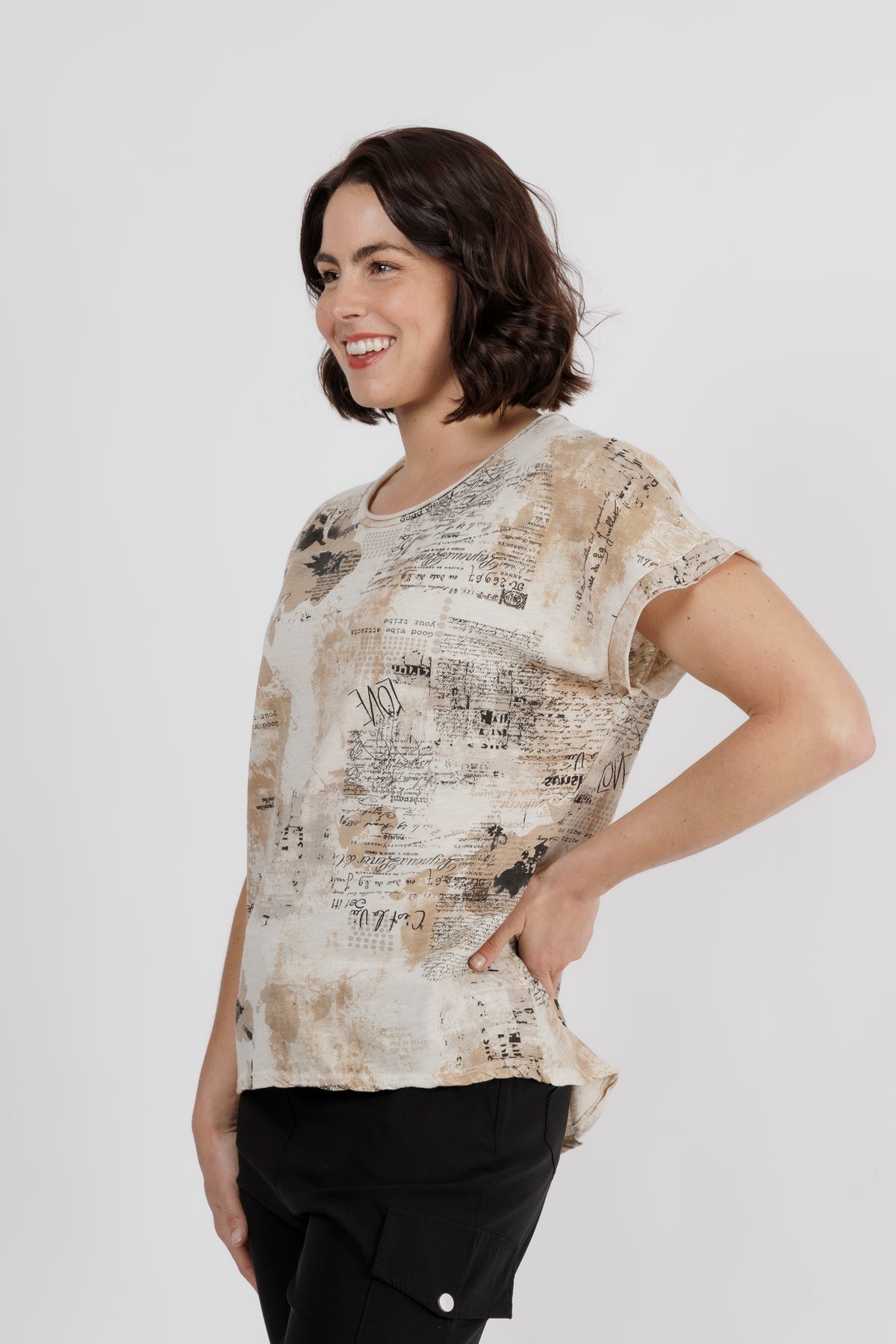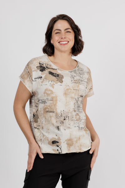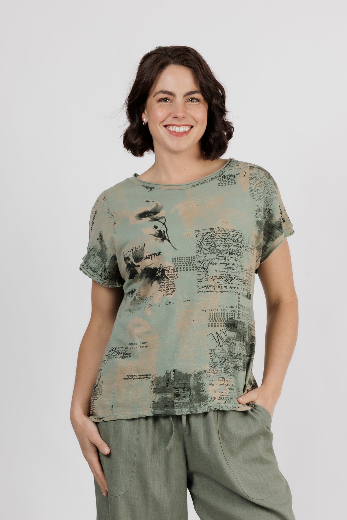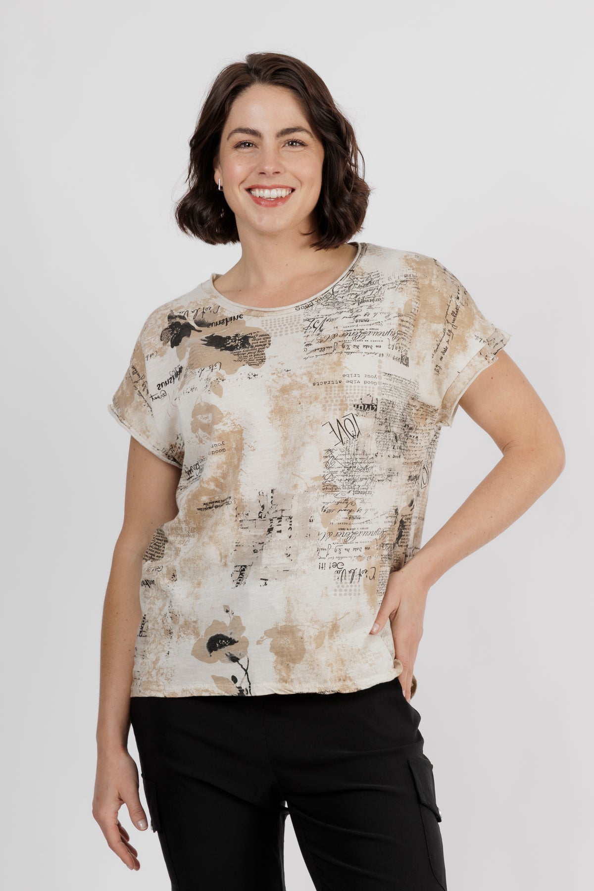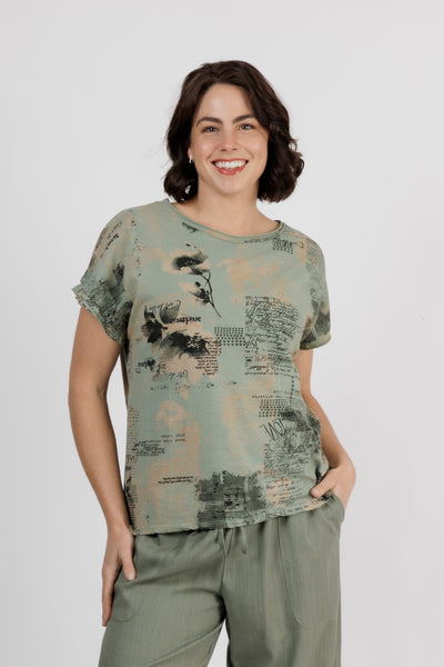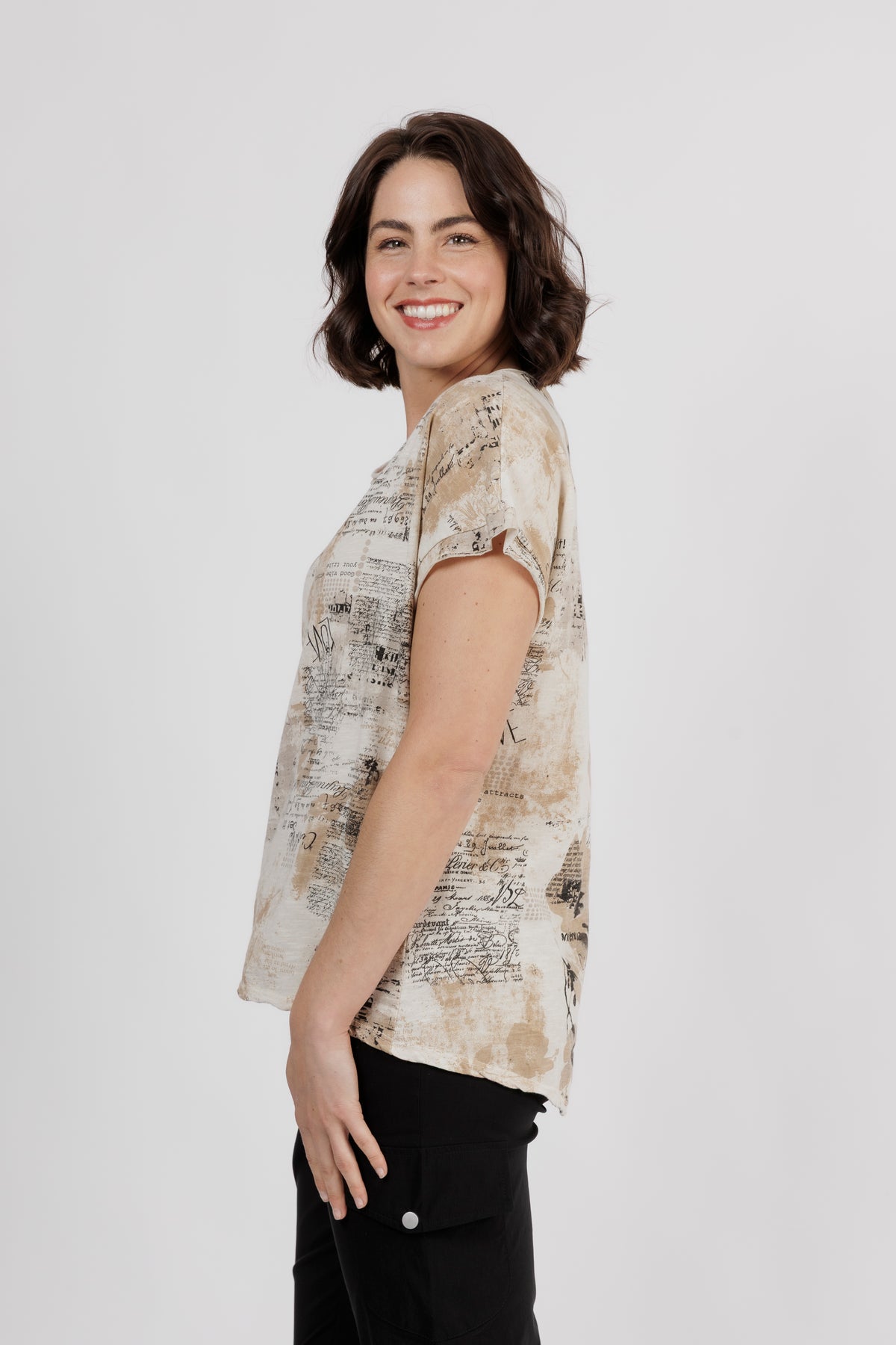 - Rounded neckline and t-shirt style sleeves framed by a khaki hem