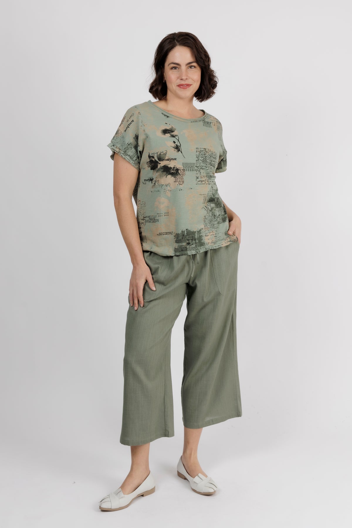 DONYA Khaki Abstract Silk Wide Leg Pants