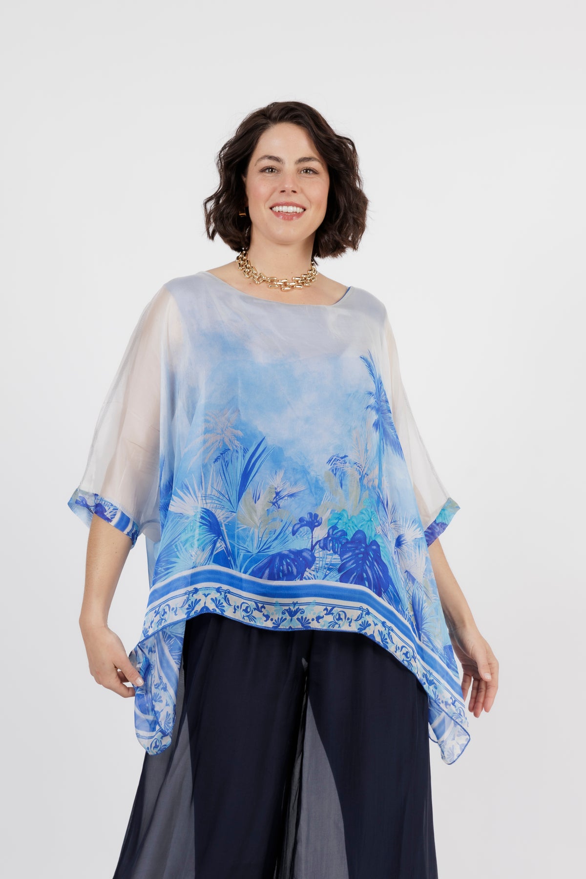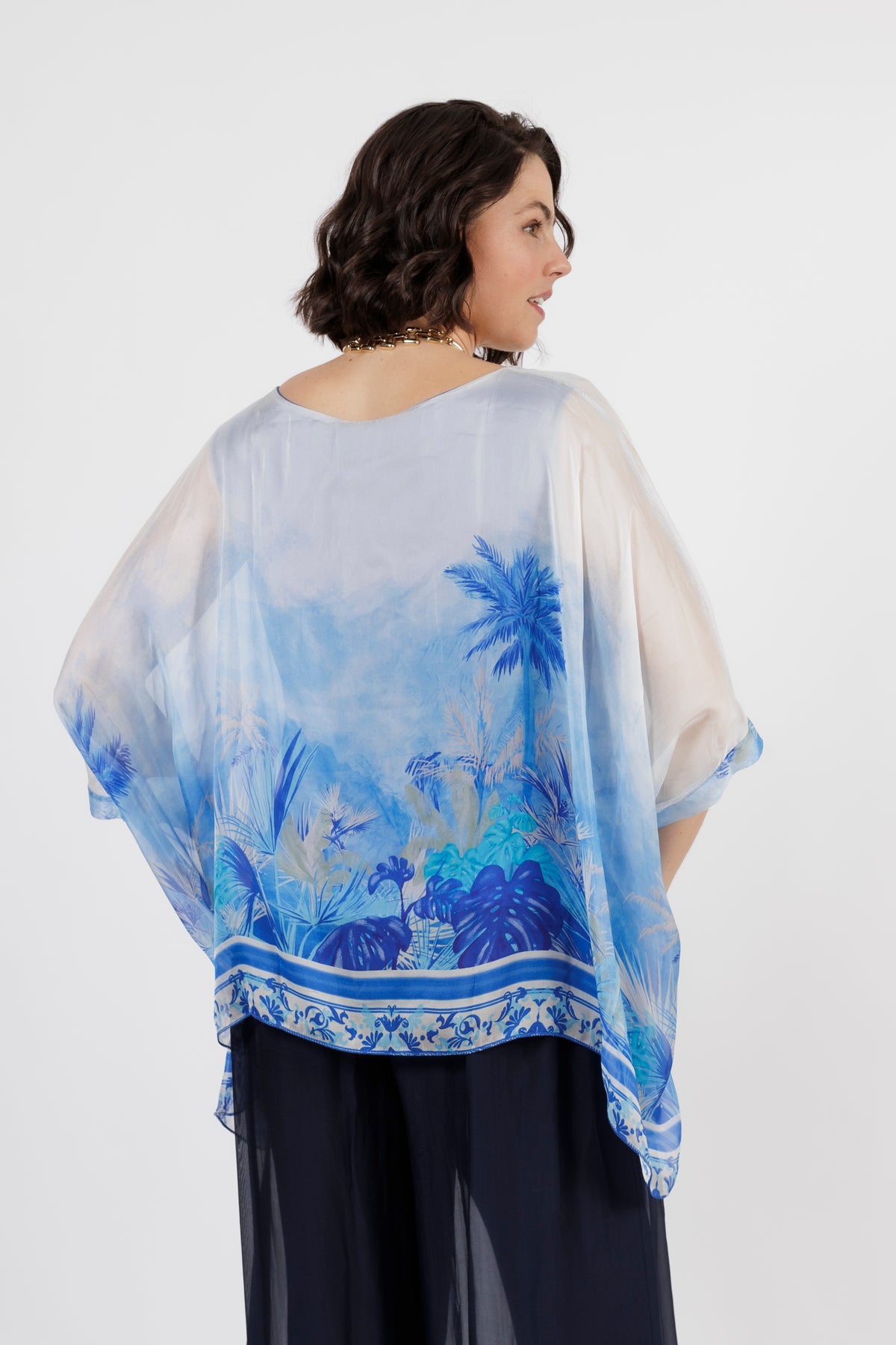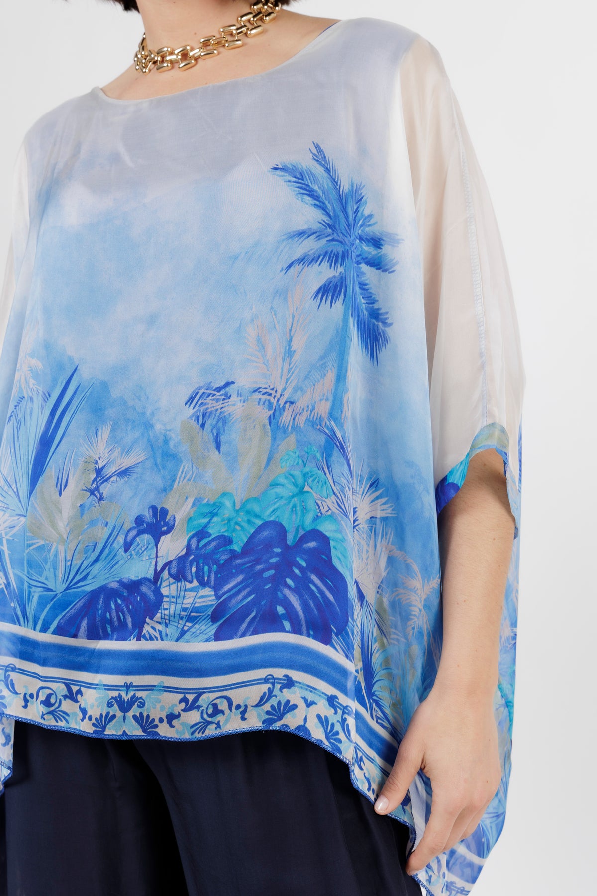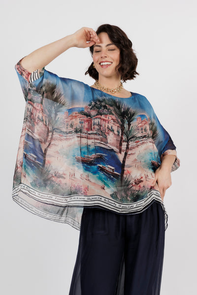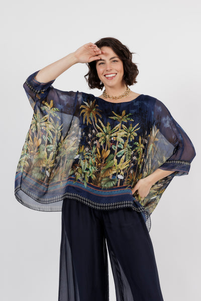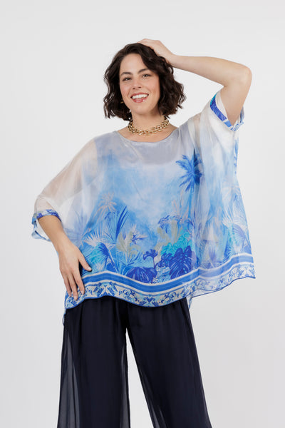 CONTESSA Blue Palm Silk Overlay Top