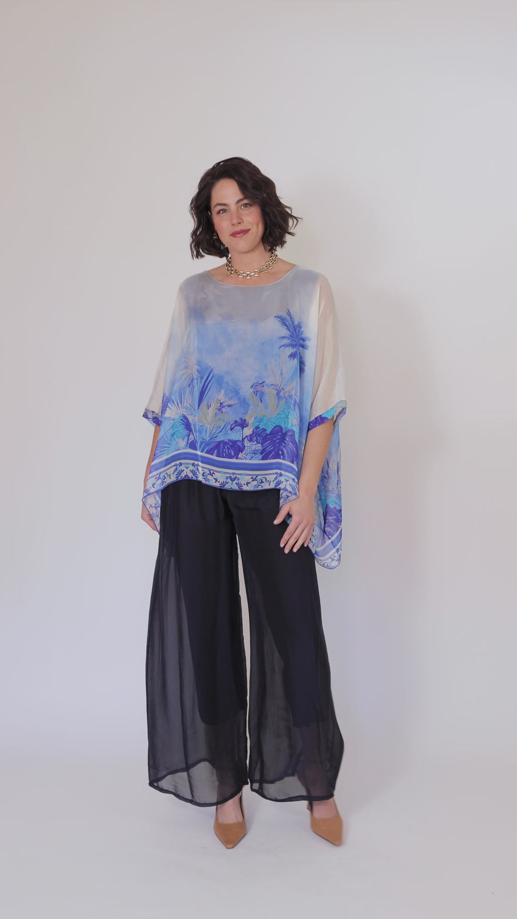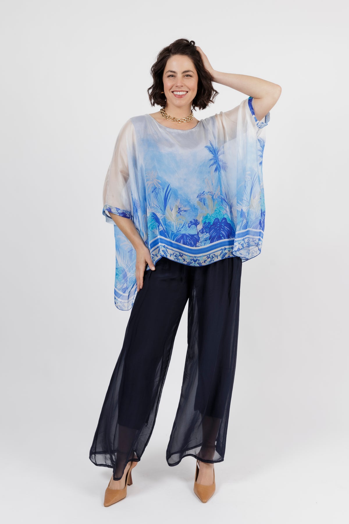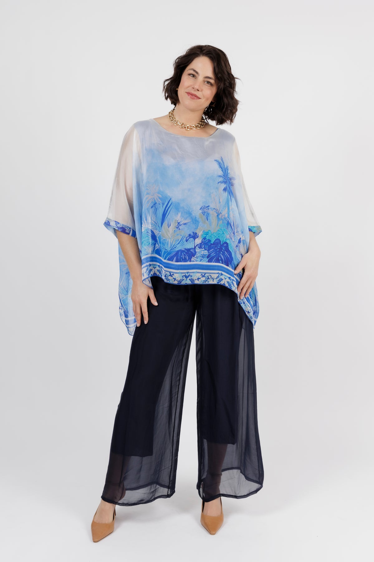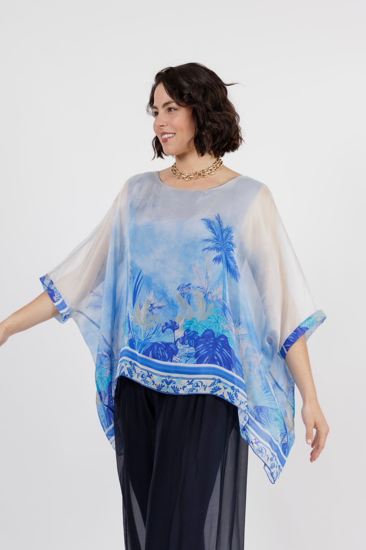 CONTESSA Blue Palm Silk Overlay Top