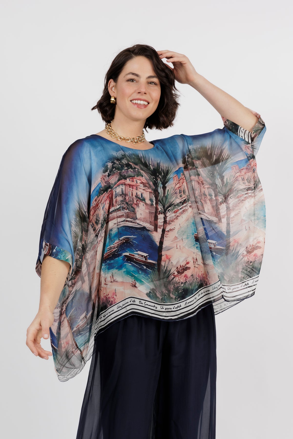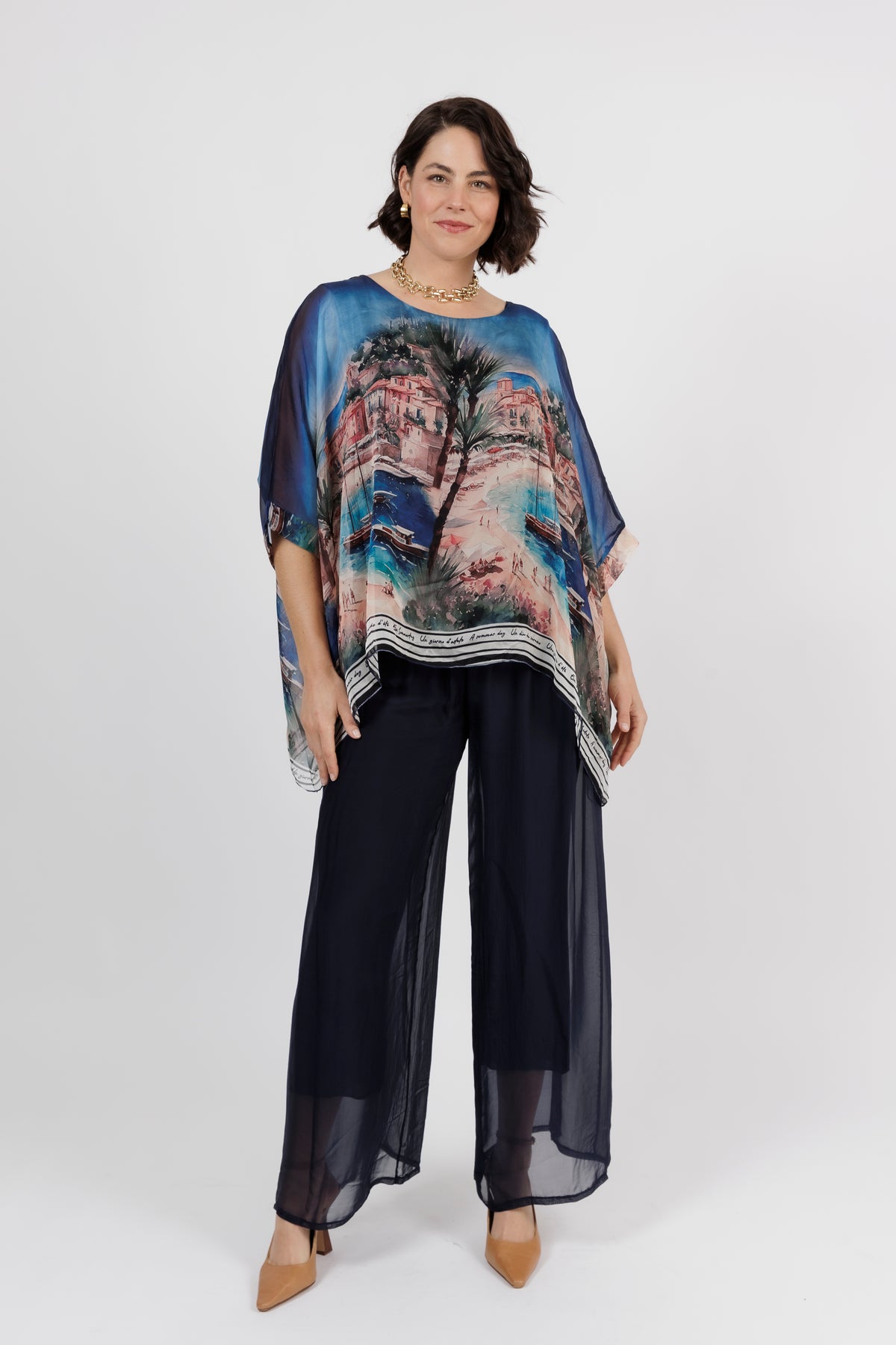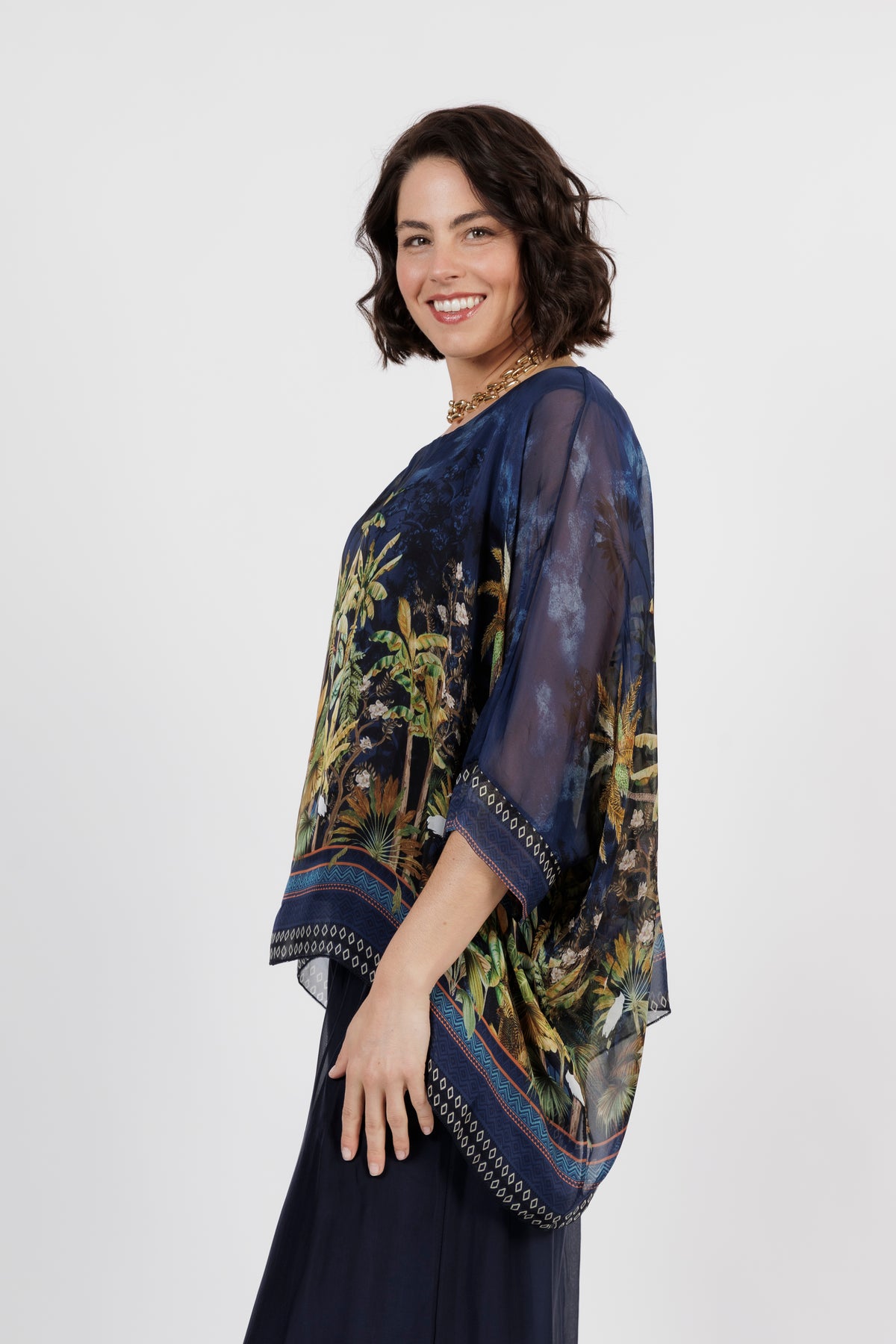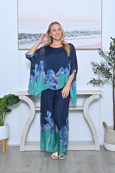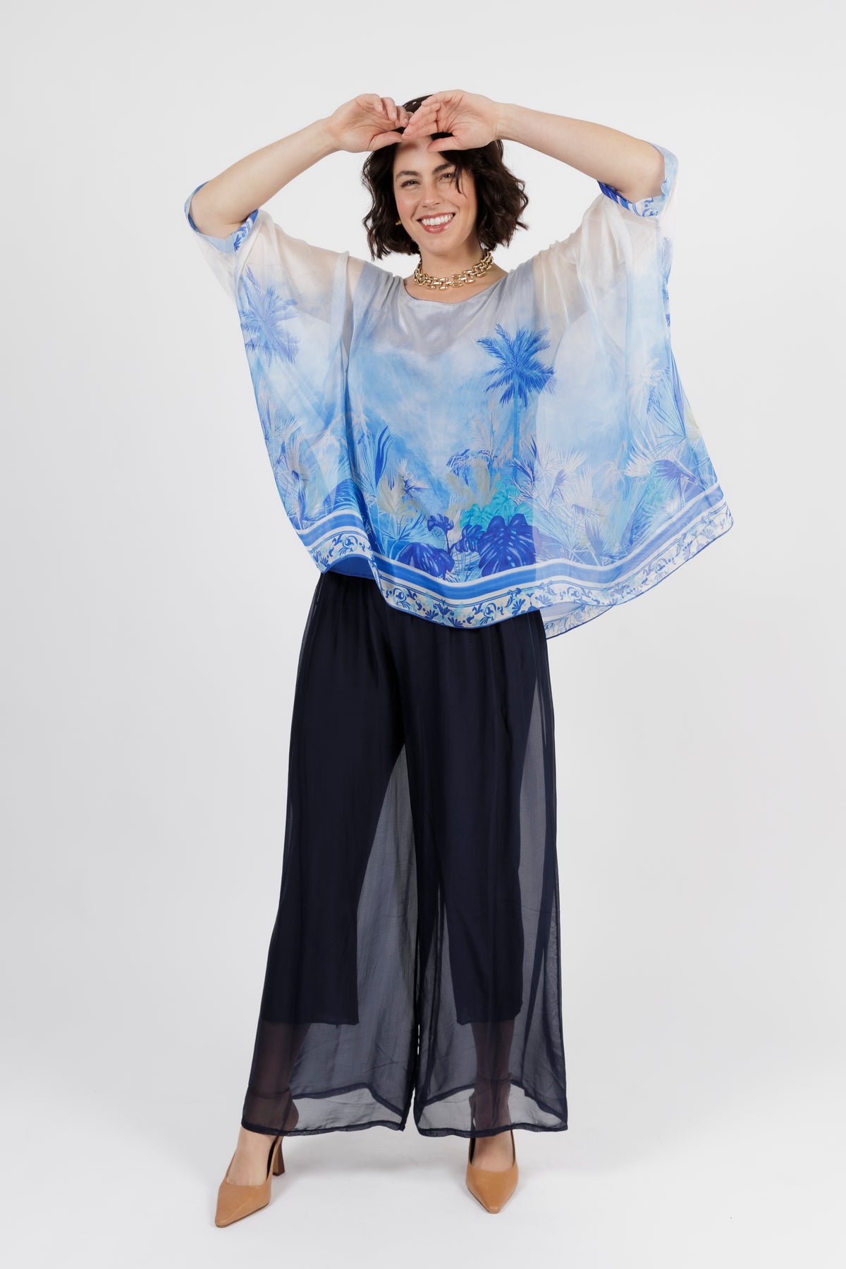 CONTESSA Blue Palm Silk Overlay Top