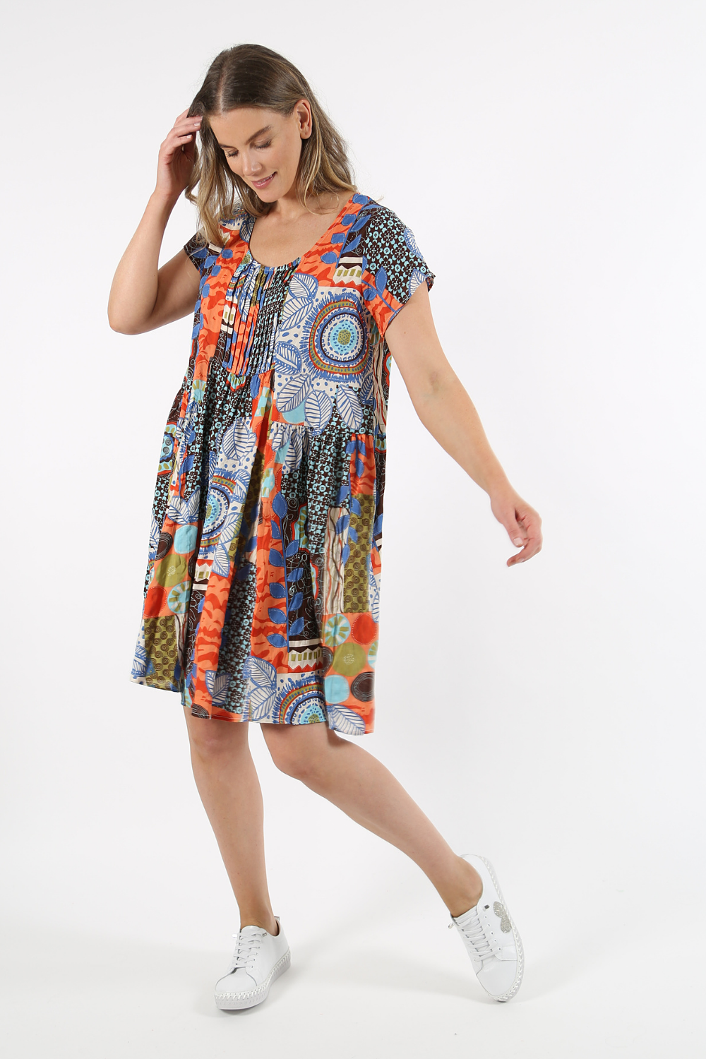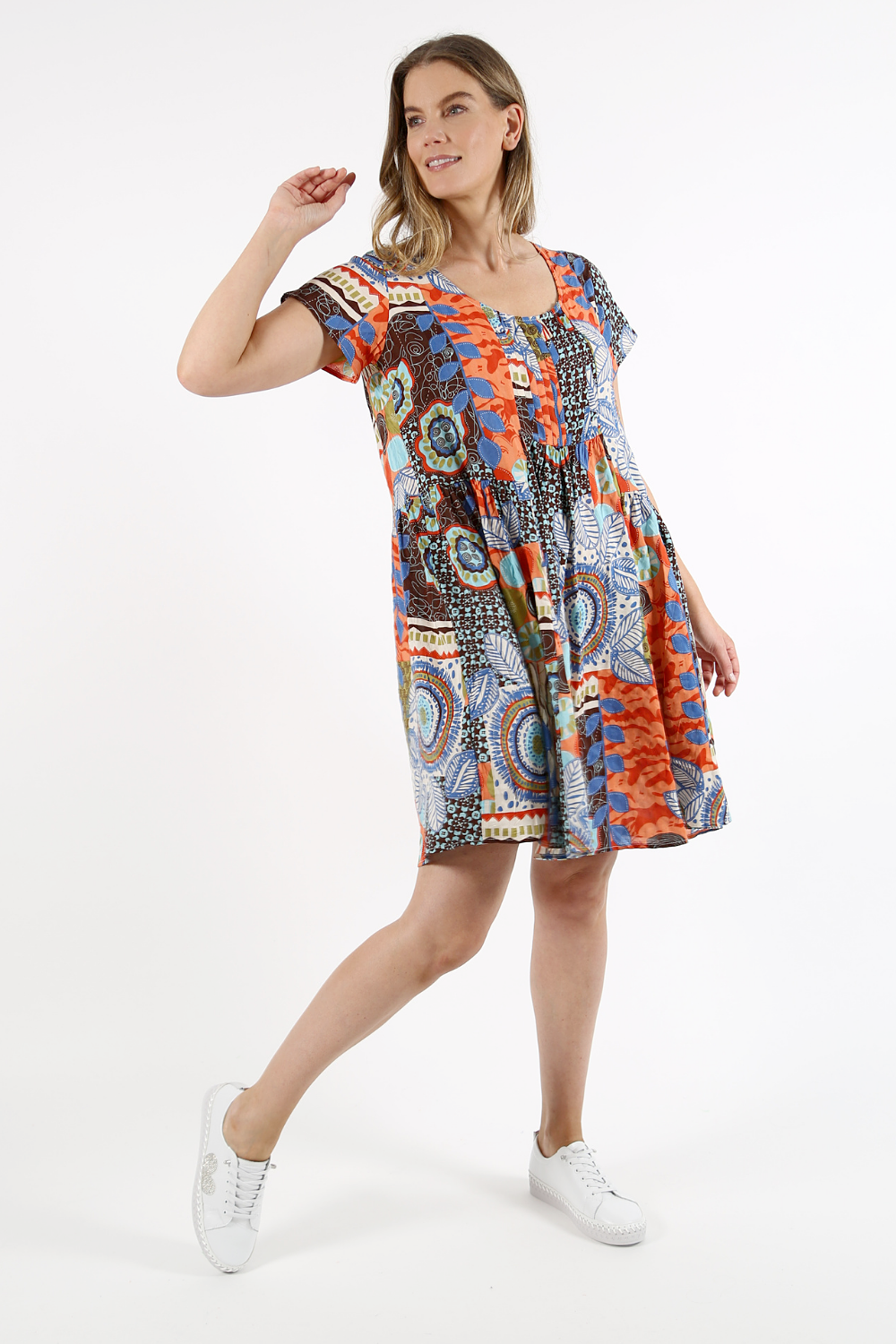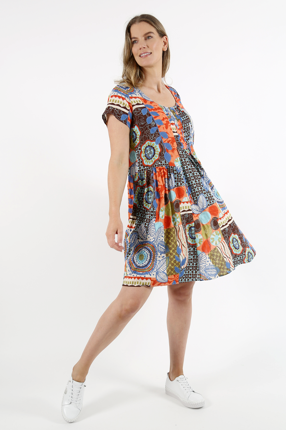 Bring colour and creativity to your summer wardrobe with our Patchwork Print Cotton-Blend Dress, a relaxed and flattering style designed for everyday comfort. This vibrant design features an artistic patchwork pattern combining floral, geometric, and abstract elements in warm earthy tones with pops of blue and red.