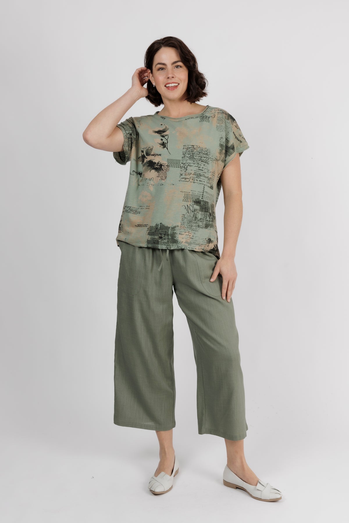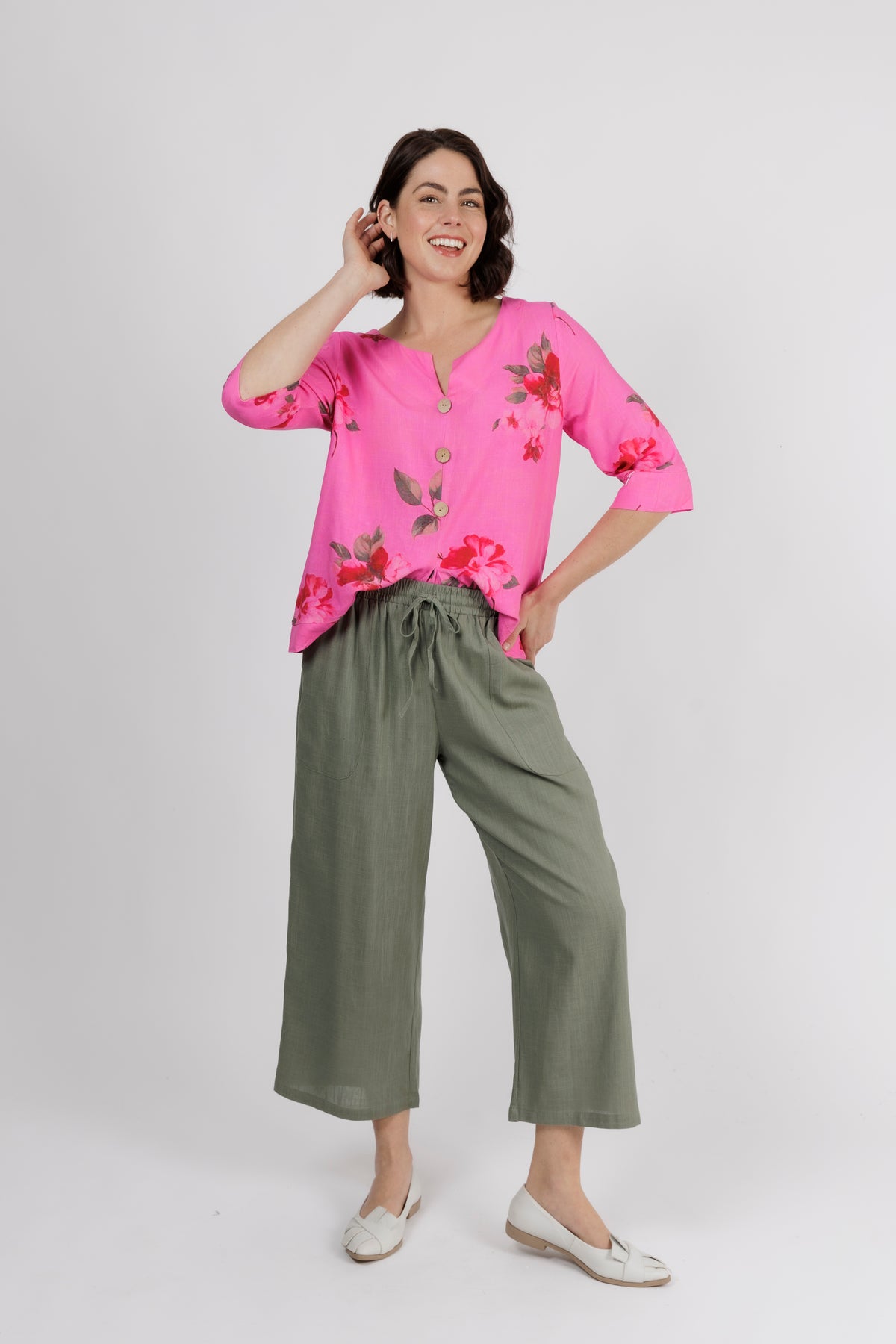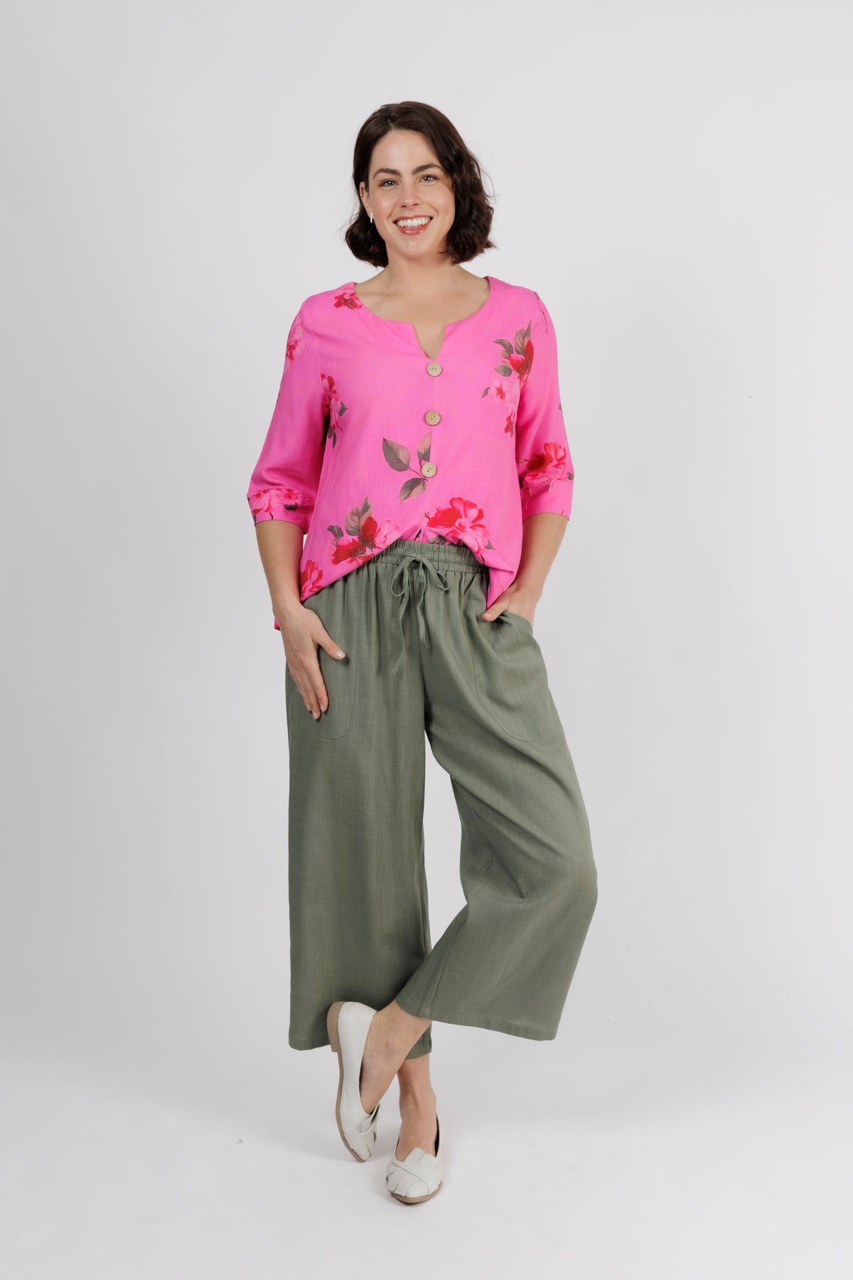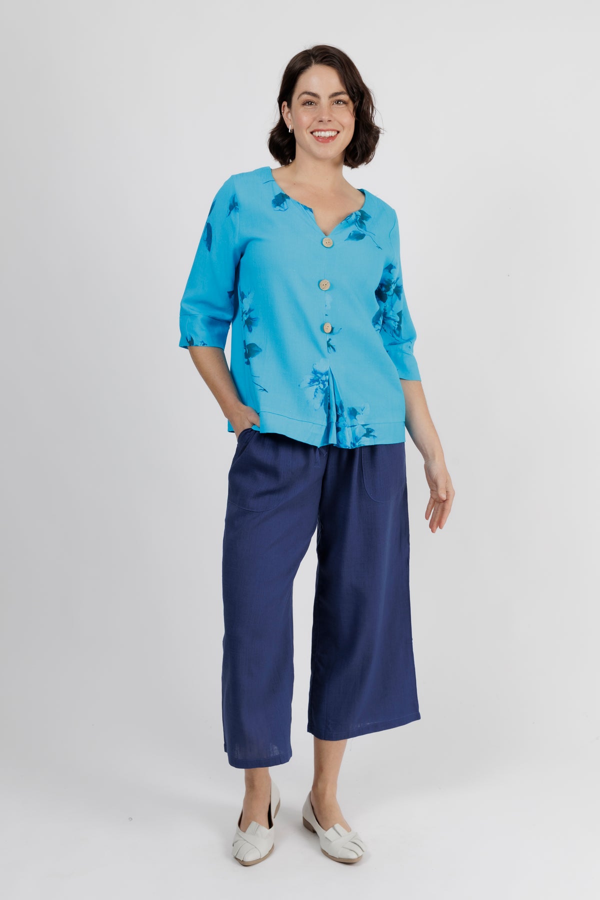 The V-neckline is finished with natural wooden buttons for a beautiful contrast, while the 3/4 sleeves make it ideal for layering or wearing on its own through warmer seasons. A gentle pleat at the front adds movement and shape, ensuring a flattering fit for everyday wear.