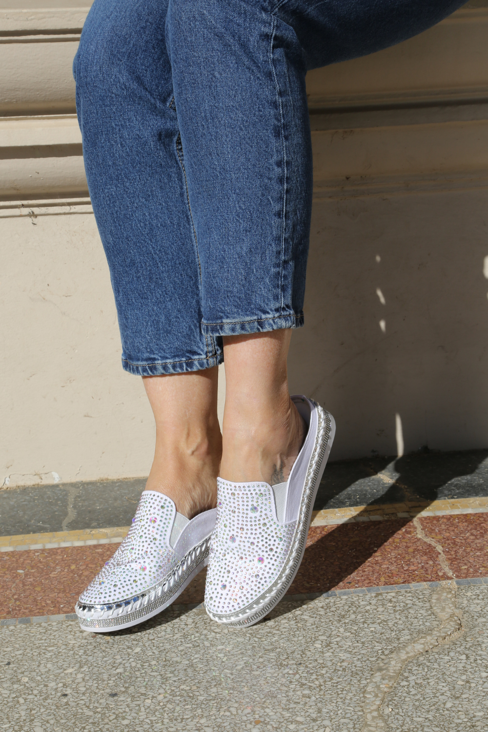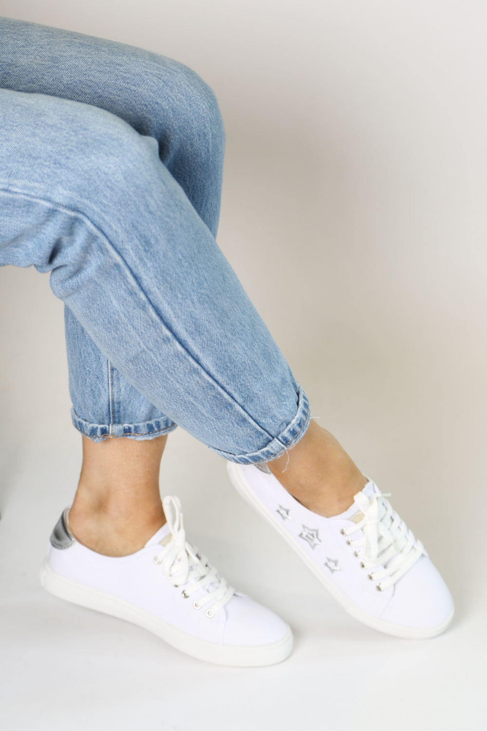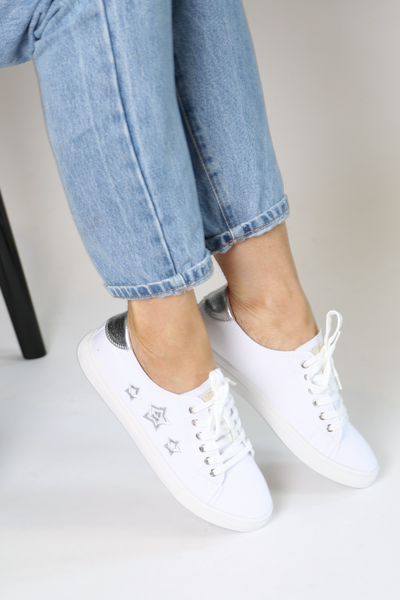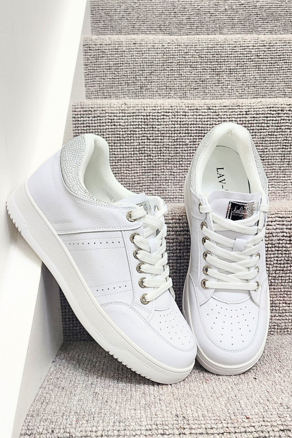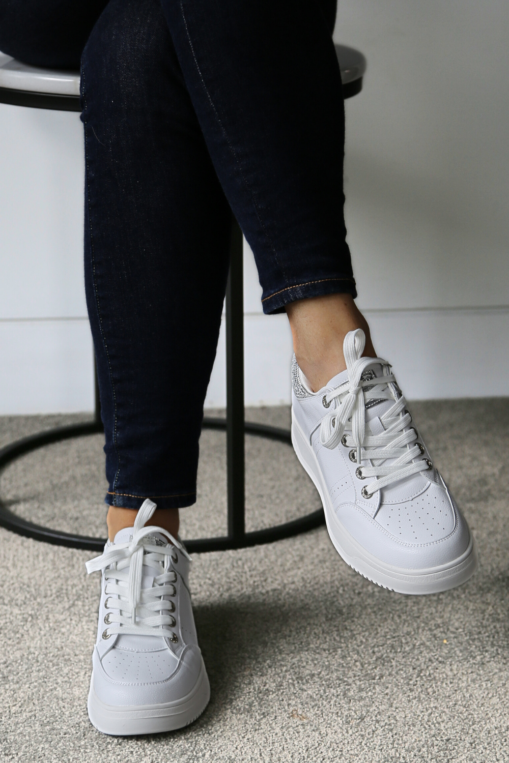 ALONZA White Lace Up Leather With Clear Crystal Sneakers