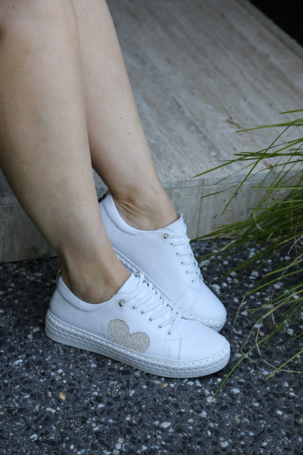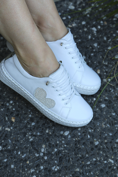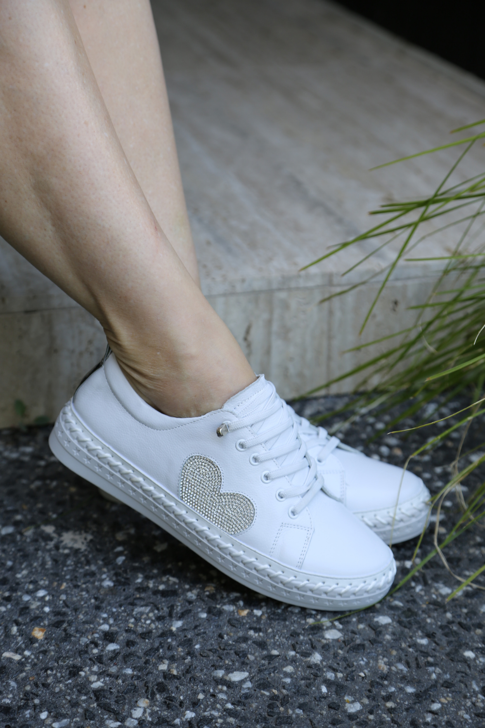 ALONZA Silver Heart White Leather Lace-Up Sneakers