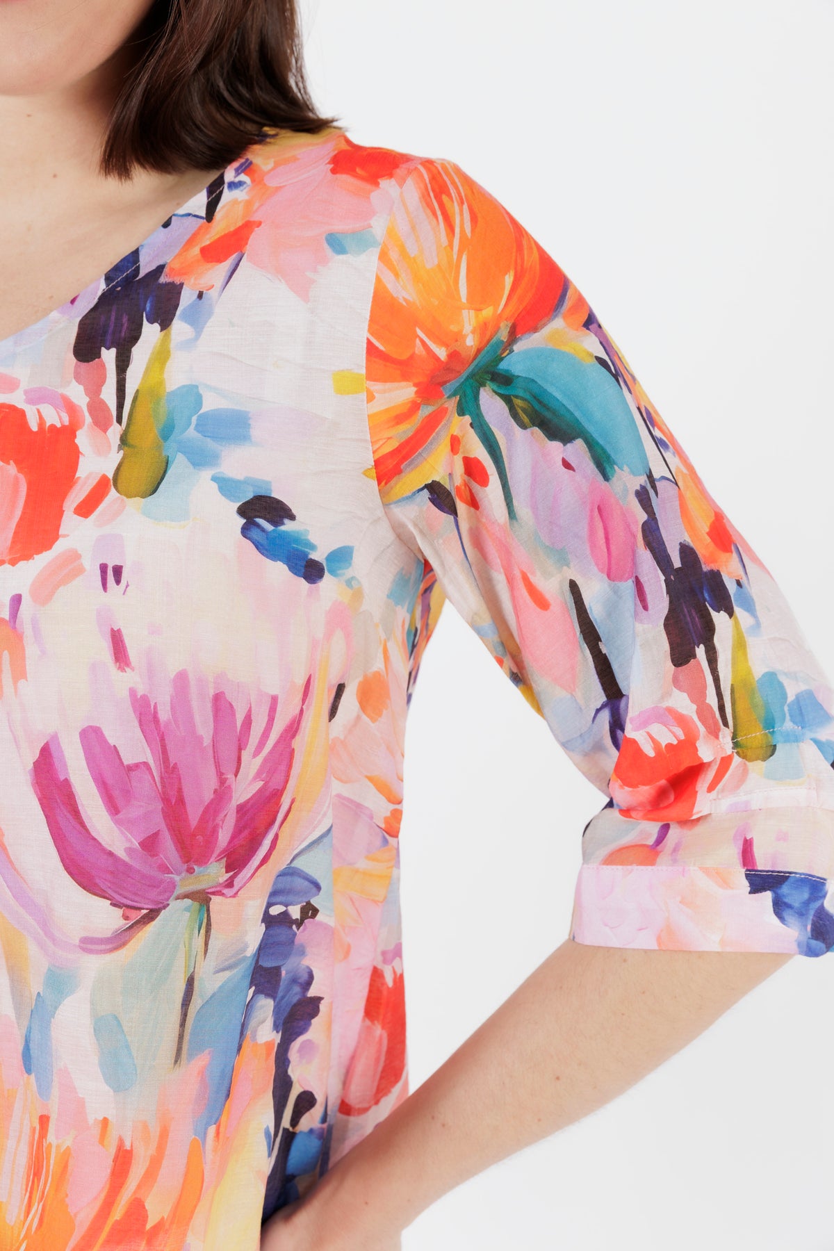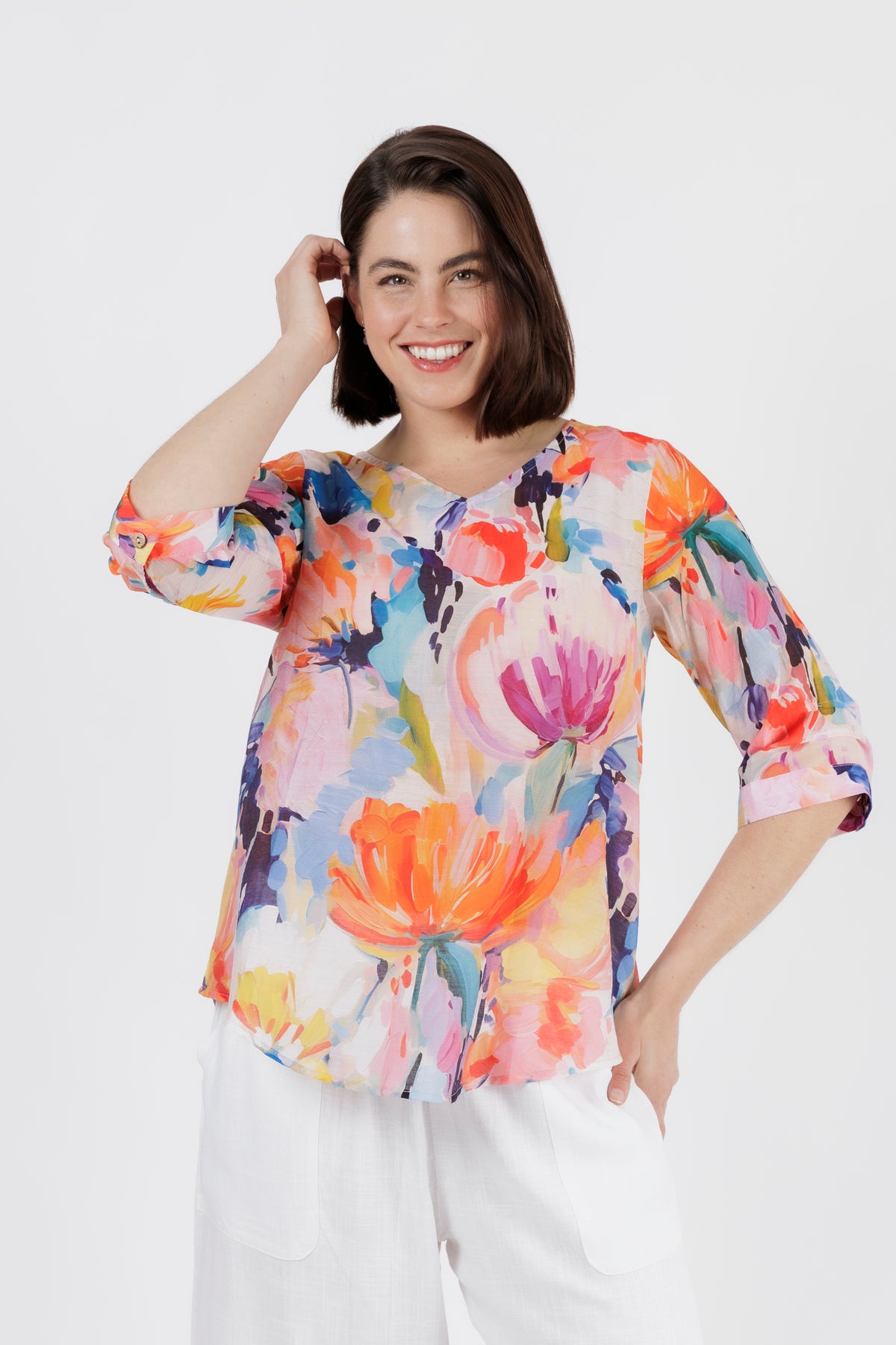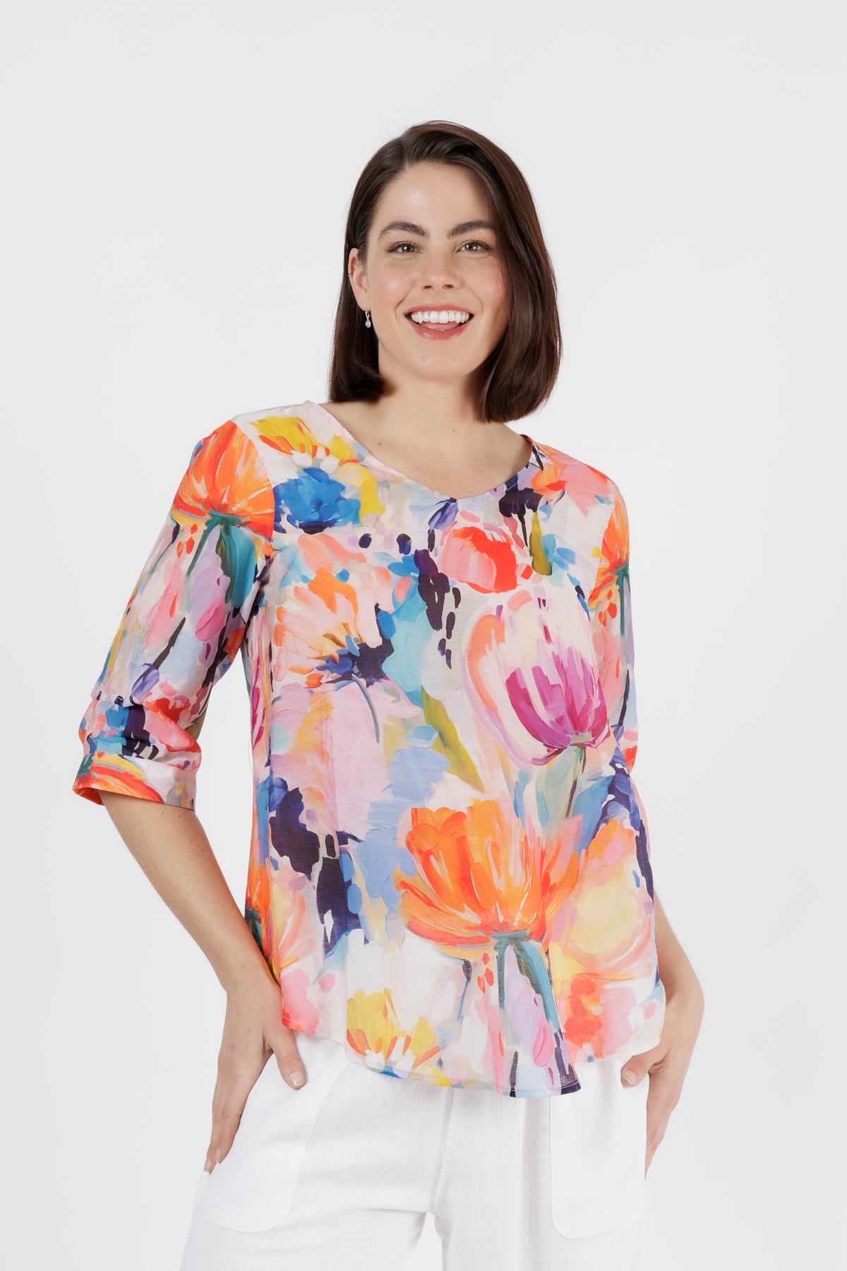 Bright, feminine, and effortlessly uplifting — this vibrant watercolour floral top adds instant freshness to your wardrobe. The painterly print blends soft tangerine, coral, aqua, lilac, and touches of deep teal, creating a beautifully artistic look that feels perfect for warm days and relaxed outings.
