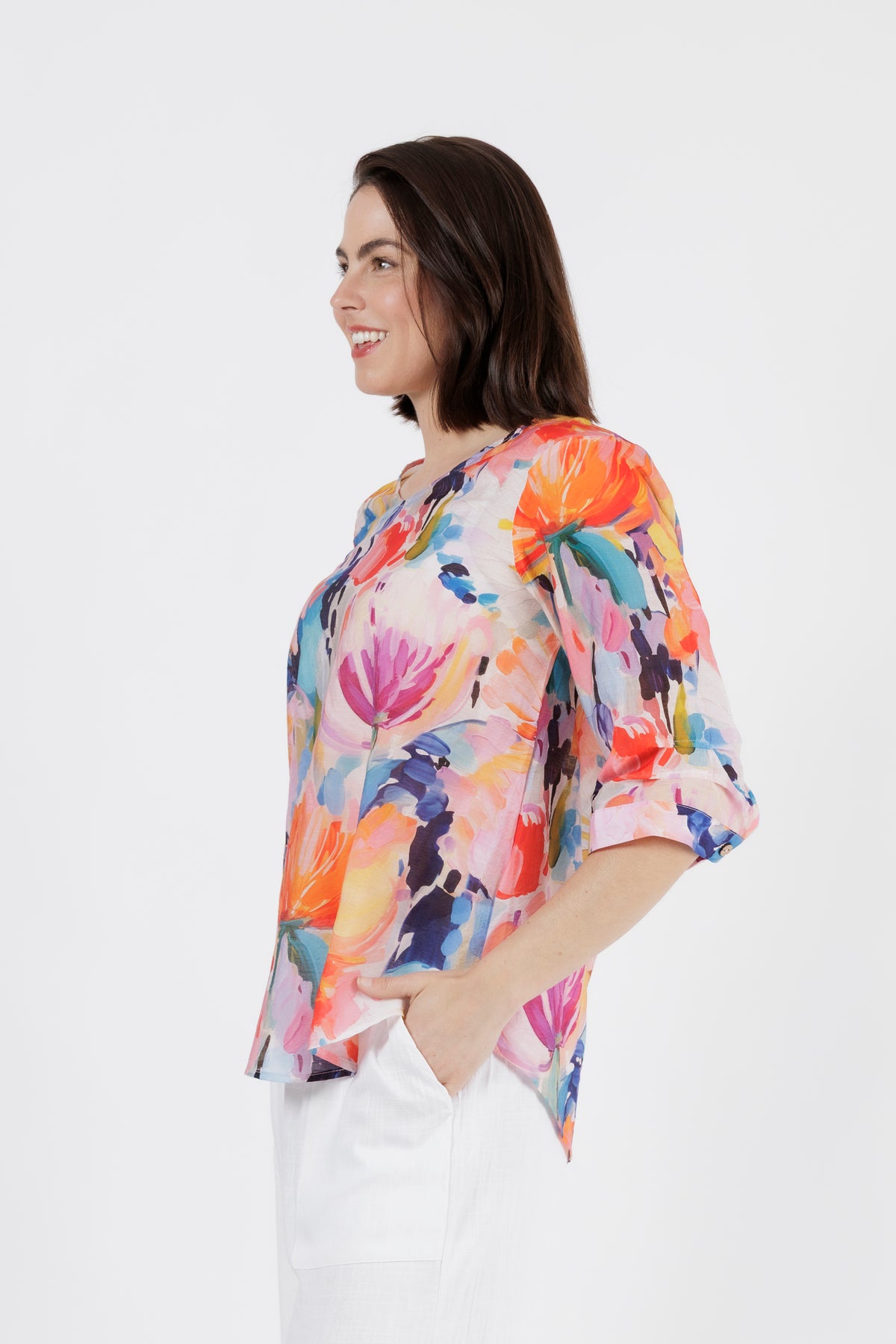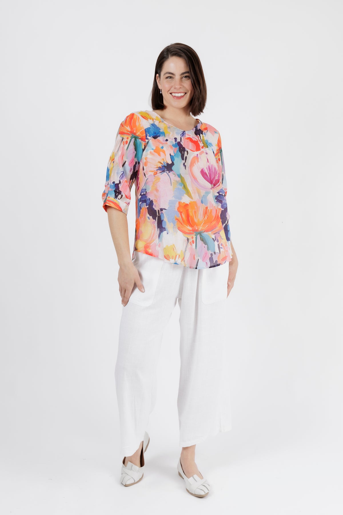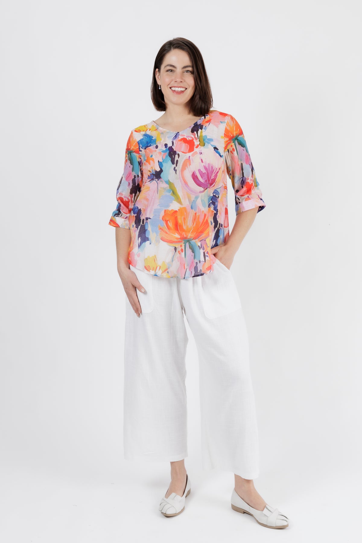 Bright, feminine, and effortlessly uplifting — this vibrant watercolour floral top adds instant freshness to your wardrobe. The painterly print blends soft tangerine, coral, aqua, lilac, and touches of deep teal, creating a beautifully artistic look that feels perfect for warm days and relaxed outings.