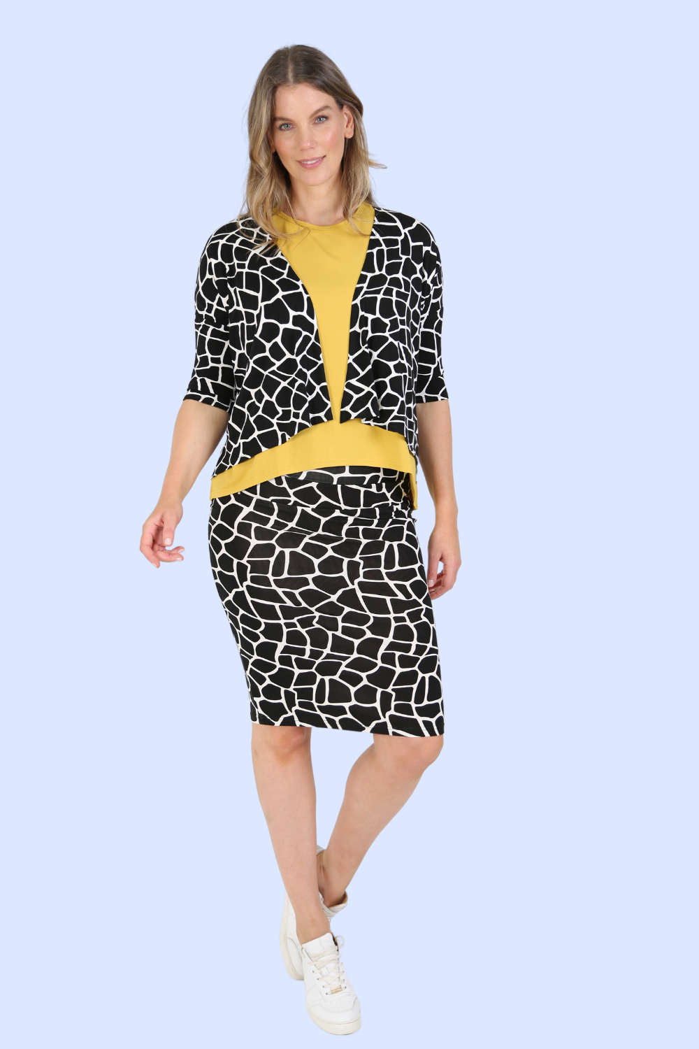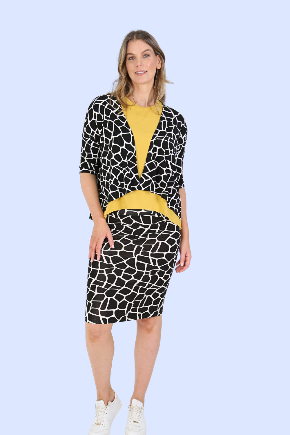 Simple and minimal, this bamboo shrug jacket is soft and relaxed, so easy to slip on for an extra layer. The waterfall lapels create a lovely draping effect, while the three quarter sleeves keep it versatile for any weather. You can't go wrong with black and white spot print, so this is bound to become a handy wardrobe staple.