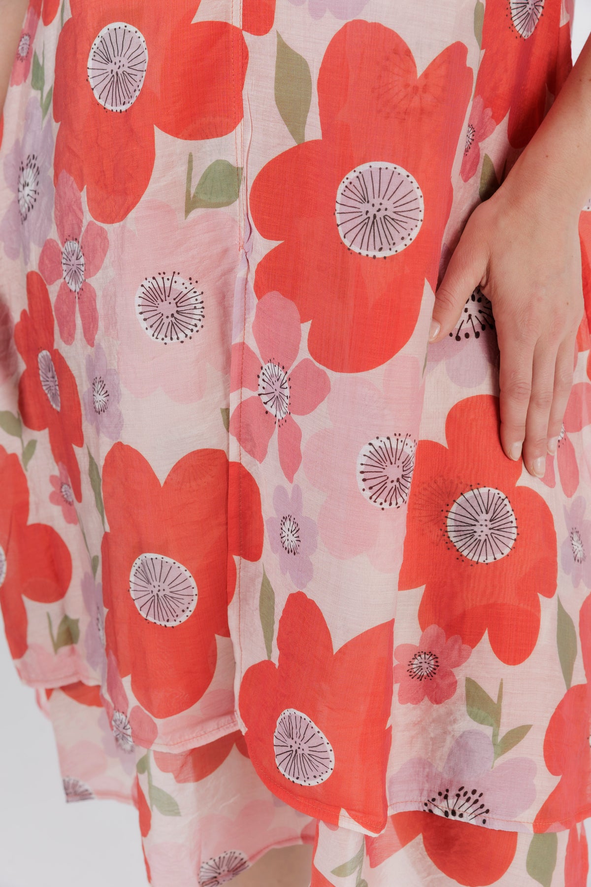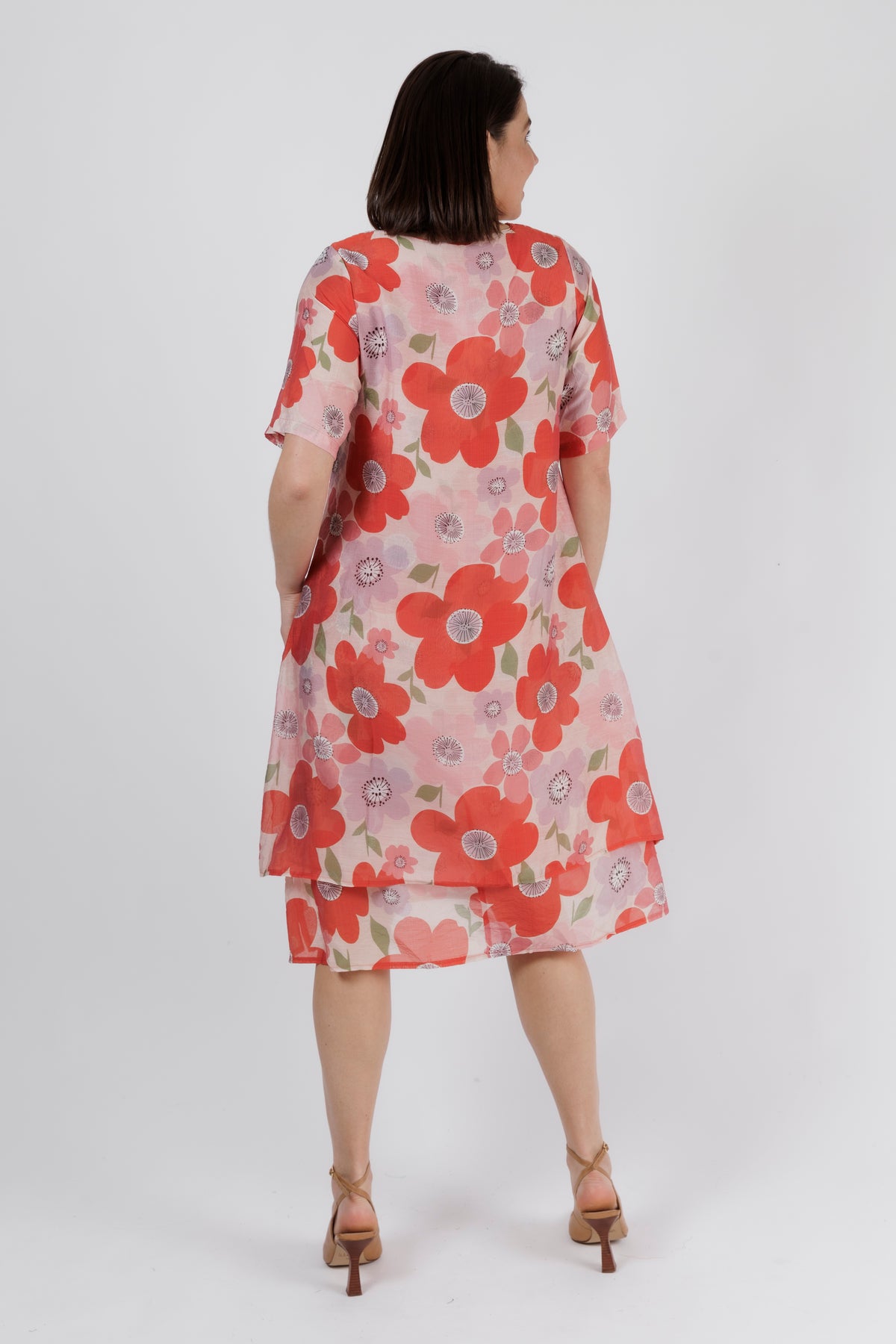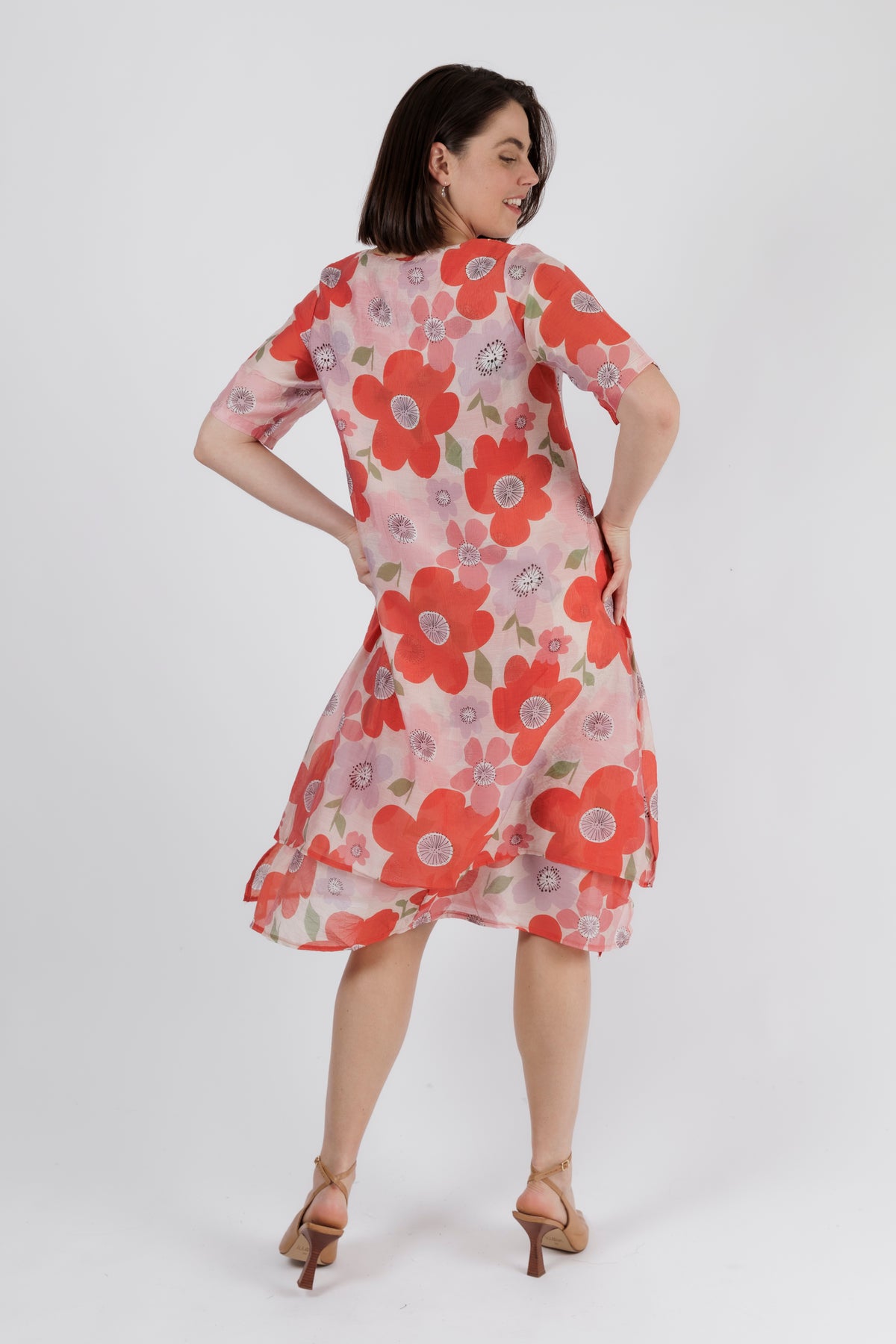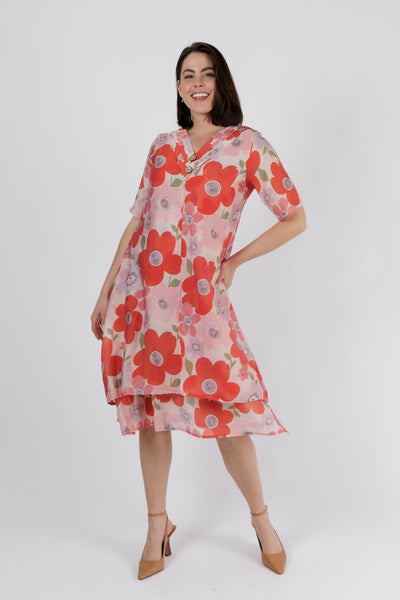 Bright, joyful, and beautifully feminine — this poppy blossom midi dress brings fresh colour and playful charm to your warm-weather wardrobe. The soft pink base is adorned with oversized red poppies and delicate accent florals, creating a bold yet uplifting print that feels perfect for summer days and holiday escapes.