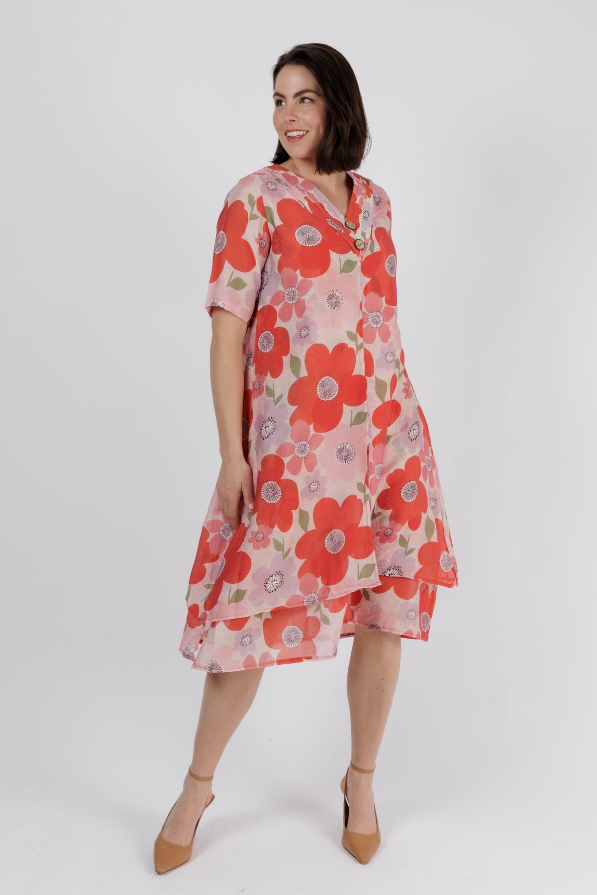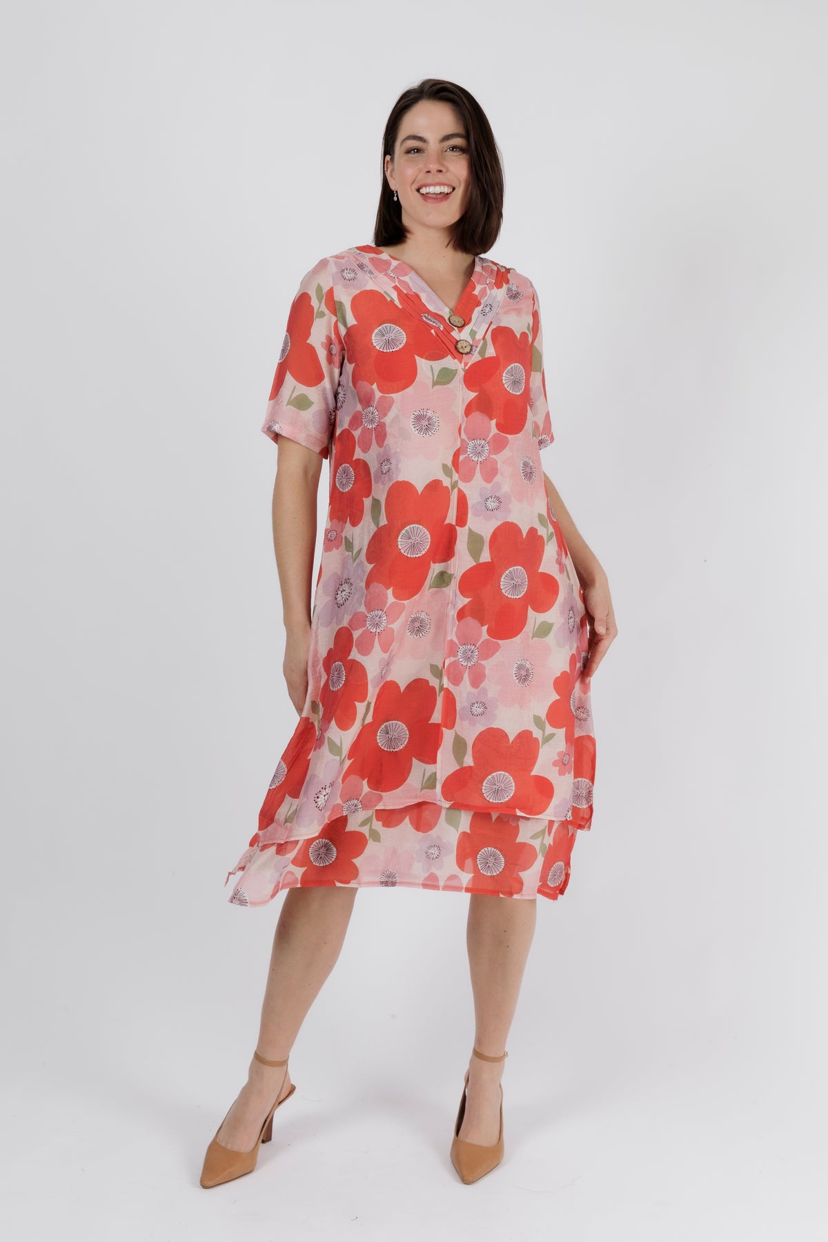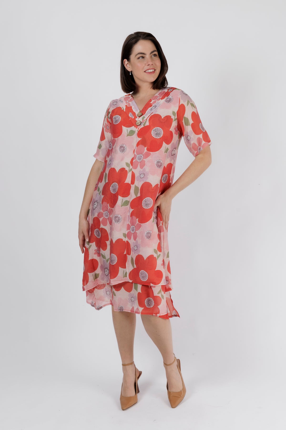 Crafted from a lightweight, breathable fabric, the dress flows gently with a relaxed silhouette that moves effortlessly. The flattering V-neckline is finished with a stitched placket and natural-look buttons for a touch of artisanal detail. Elbow-length sleeves offer comfortable coverage, while the layered hem adds soft movement and dimension.