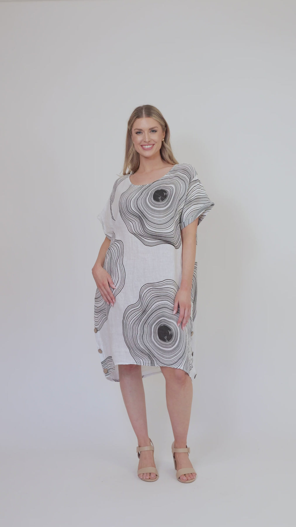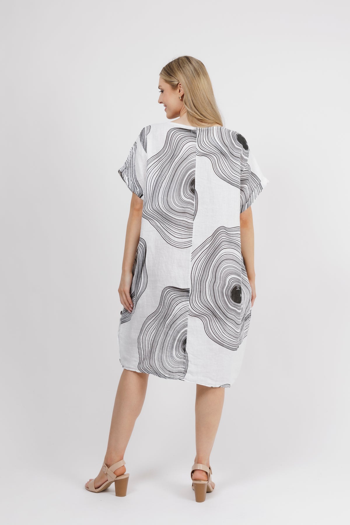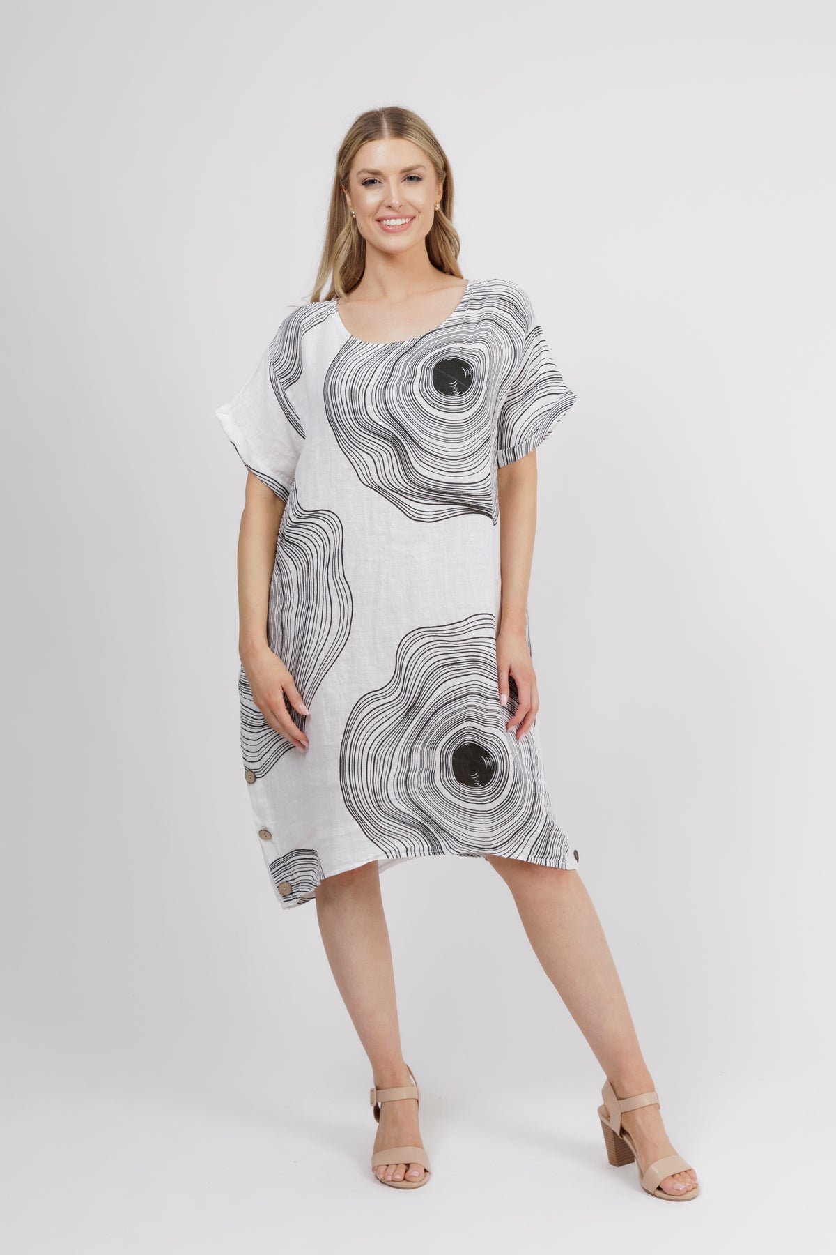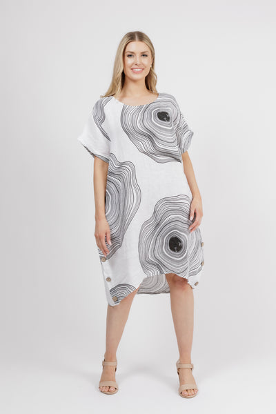 MARCELA White Side Button Abstract Line Linen Dress